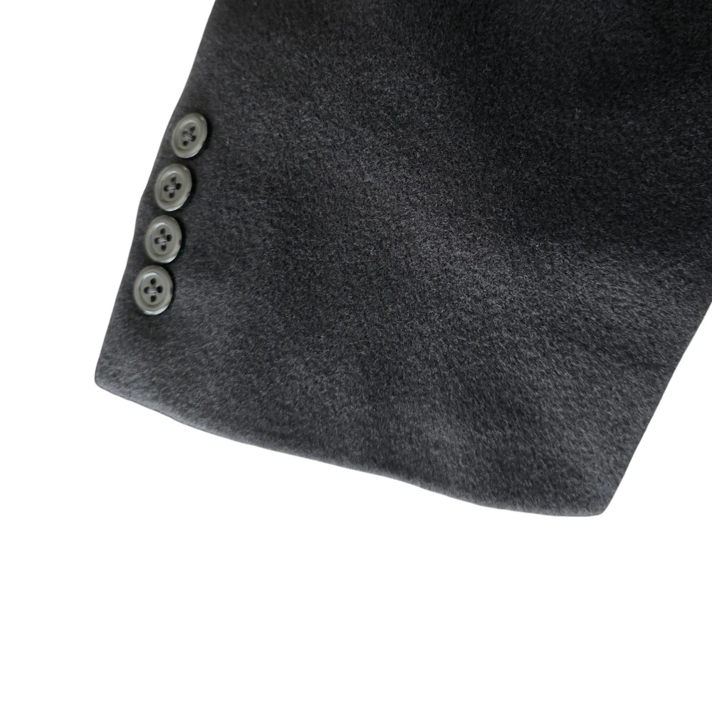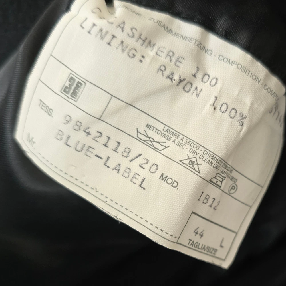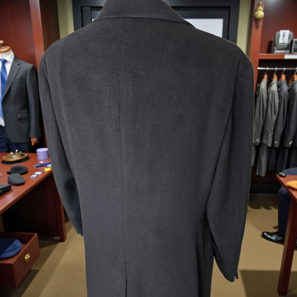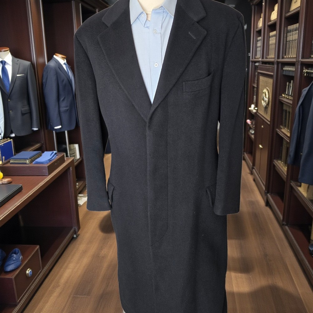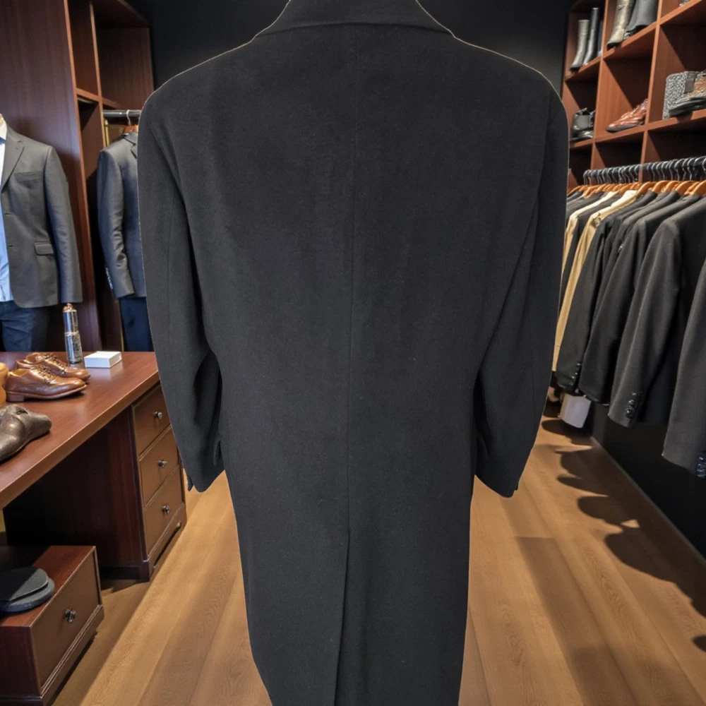 Size: 44L USA with*** 25 inch arm length***and a jacket length of 48 inches. For complete measurements, see photo #2 To see exactly how we measured, see the last series of photos. Color: black Condition: excellent vintage condition. No real signs of use. No flaws. No holes. No stains. No smells. No snags. Midweight cashmere, light structure, light shoulder pads, full length, hidden buttons Return policy: We offer free shipping and no returns. We can not afford to offer both in the highest return category on eBay. It becomes very expensive to mail out items for free for people to try on if they are not confident in checking the measurements in picture #2. If you prefer to have the ability to return the item and pay $12.95 shipping, please send us a message, and we can change the listing format to offer returns. The $12.95 shipping cost would break us out even in the case you needed to return the item. We ship the next business day after the payment is made.