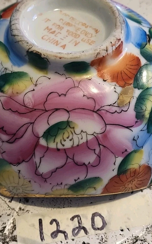 This vintage porcelain bowl is hand-painted with a vintage floral pattern and gold trim, making it a stylish and elegant piece. Made in China in 1940, it features a round shape with a glossy finish, measuring 6 inches in width and 2 inches in depth. This art pottery bowl is for decoration only and showcases an Asian style, perfect for display. The vibrant multicolor floral design adds a touch of charm to this timeless piece. Very colorful. Beautiful. No chips or damage. Very nice for trinkets. See pictures. Needs cleaned.