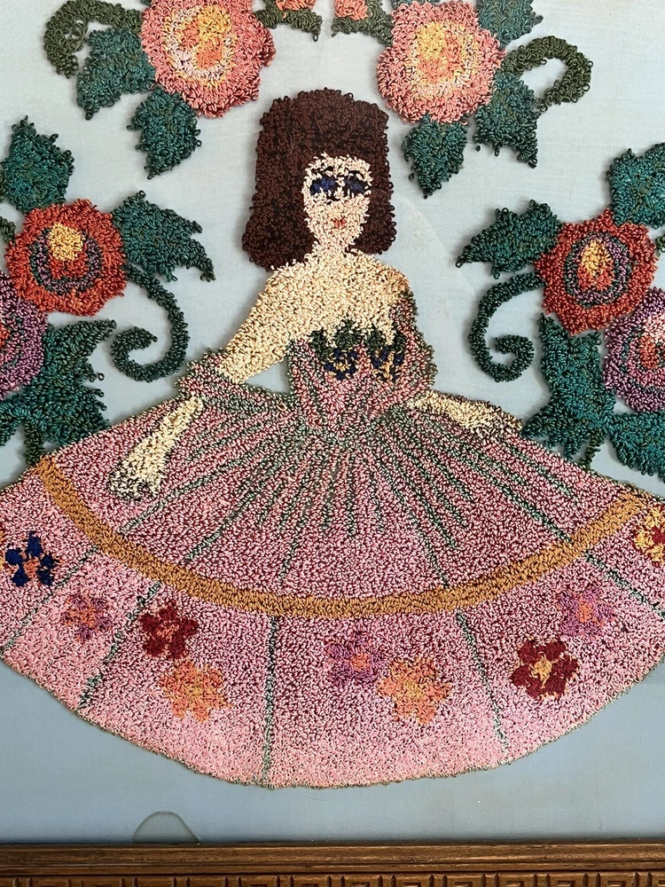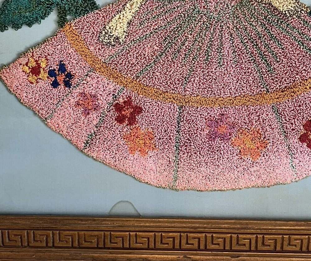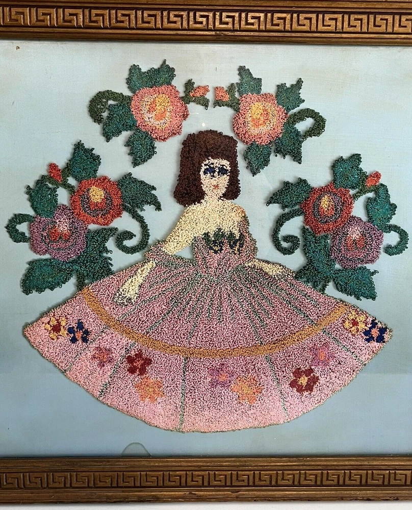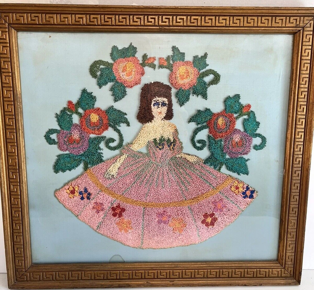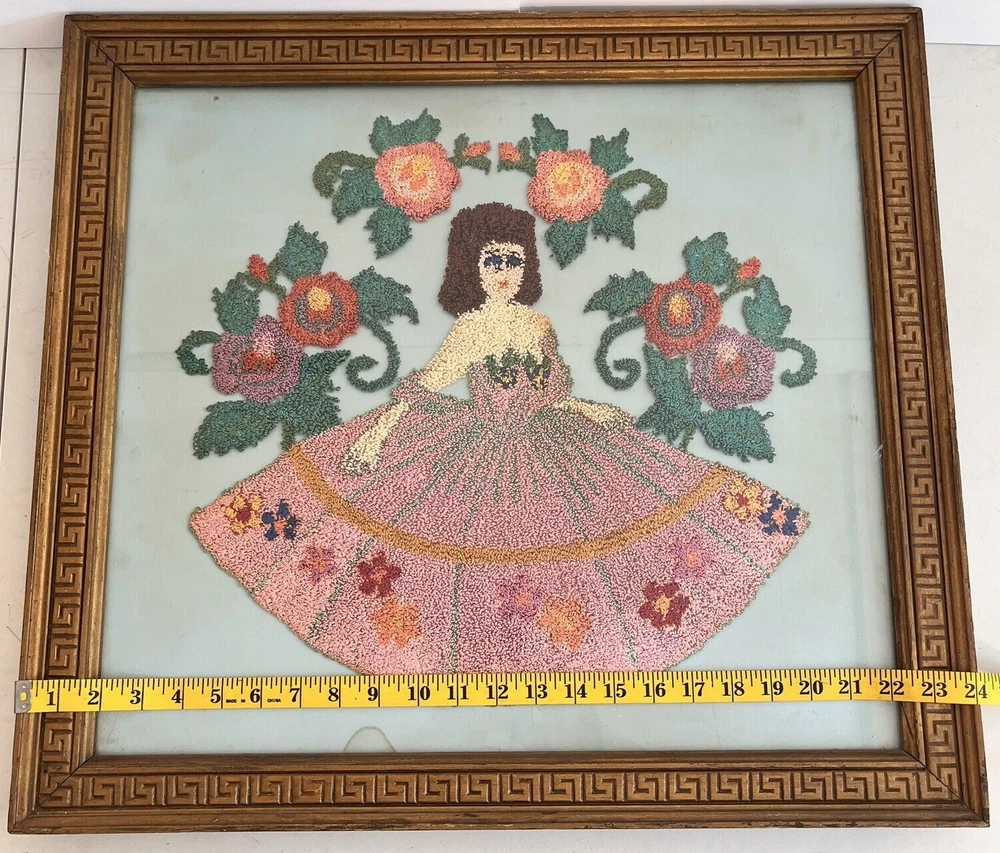 Vintage Punch Needle Art on Satin Greek Key Wood Frame with Glass Woman/Floral Needlework depicts a woman in a ball gown surrounded by floral designs. This measures with frame 21.5" x 24" This weighs 8 lbs. This is a pre-owned item and show signs of wear and age. The satin material on which the needlework is done has some signs of being slightly soiled. Please look at photos. The wood frame has a couple of snags which could be sanded smooth. Sold as is. I would be willing to remove the glass for shipping to decrease cost of shipping and minimize risk of breakage. If you are interested in this option please let me know and I'll provide a way to calculate shipping without glass. As is the listed will calculate shipping with glass. Please look closely at photos for details. My goal is to provide a smooth and seamless shopping experience which will result in you receiving something you will enjoy! If you have any questions or concerns about the item or the transaction, please first message me so that I have an opportunity to correct the issue to the best of my ability which I am more than willing to do. Thank you for shopping with Collectible Kitsch, hope to see you again!