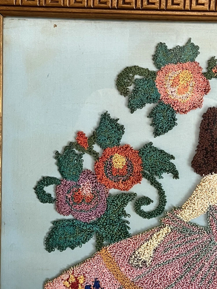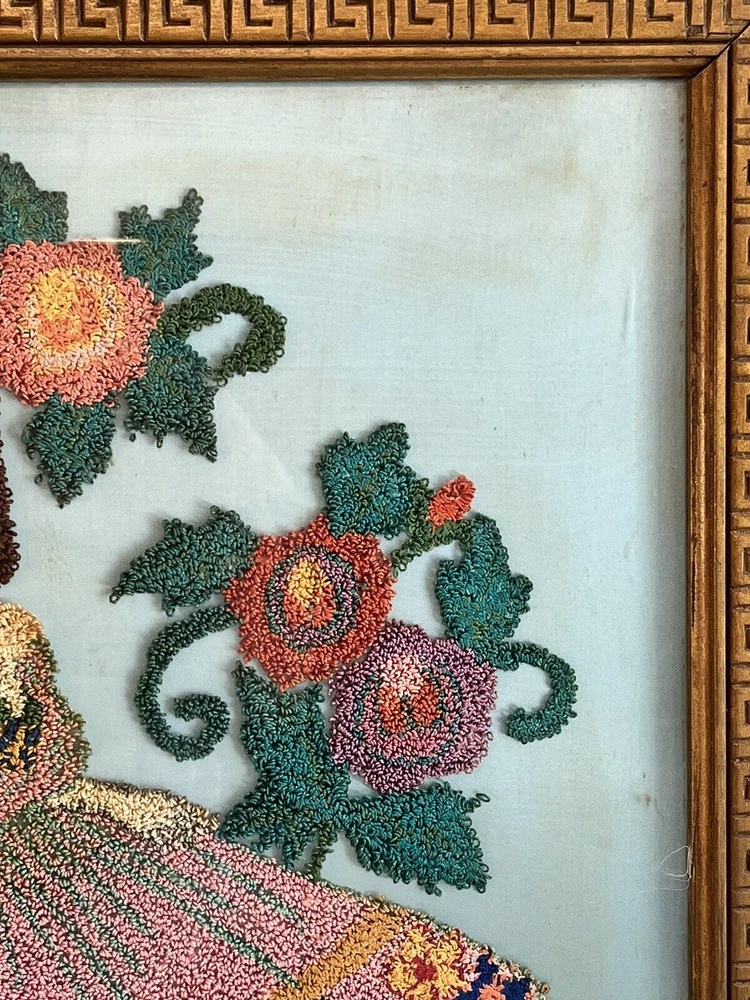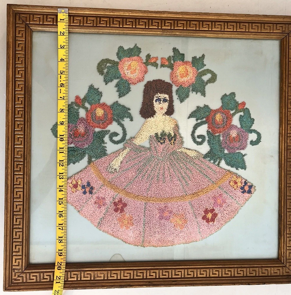 Vtg Punch Needle Art on Satin Greek Key Wood Frame with Glass Woman/Floral 21x24