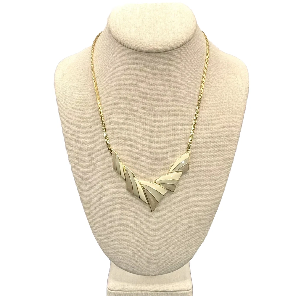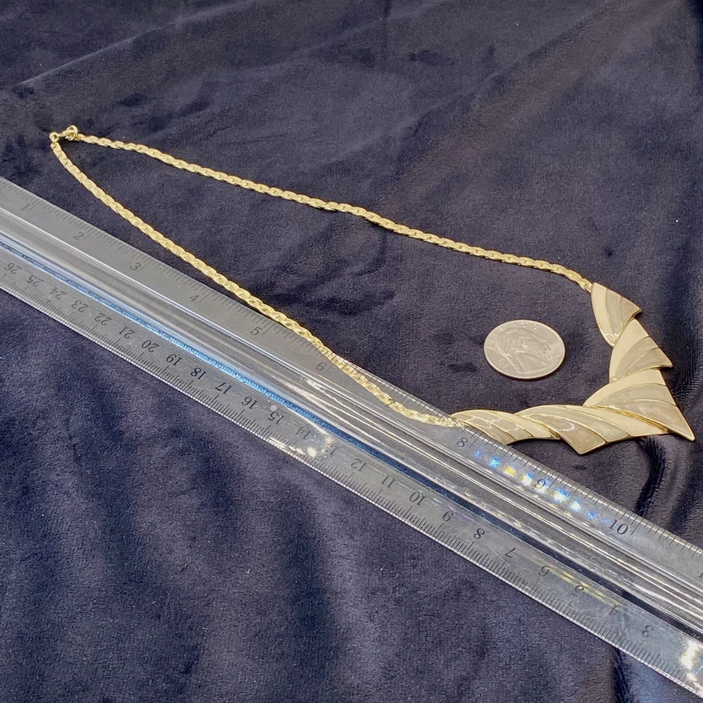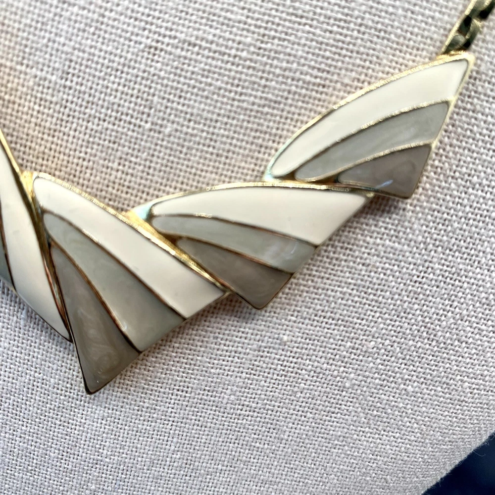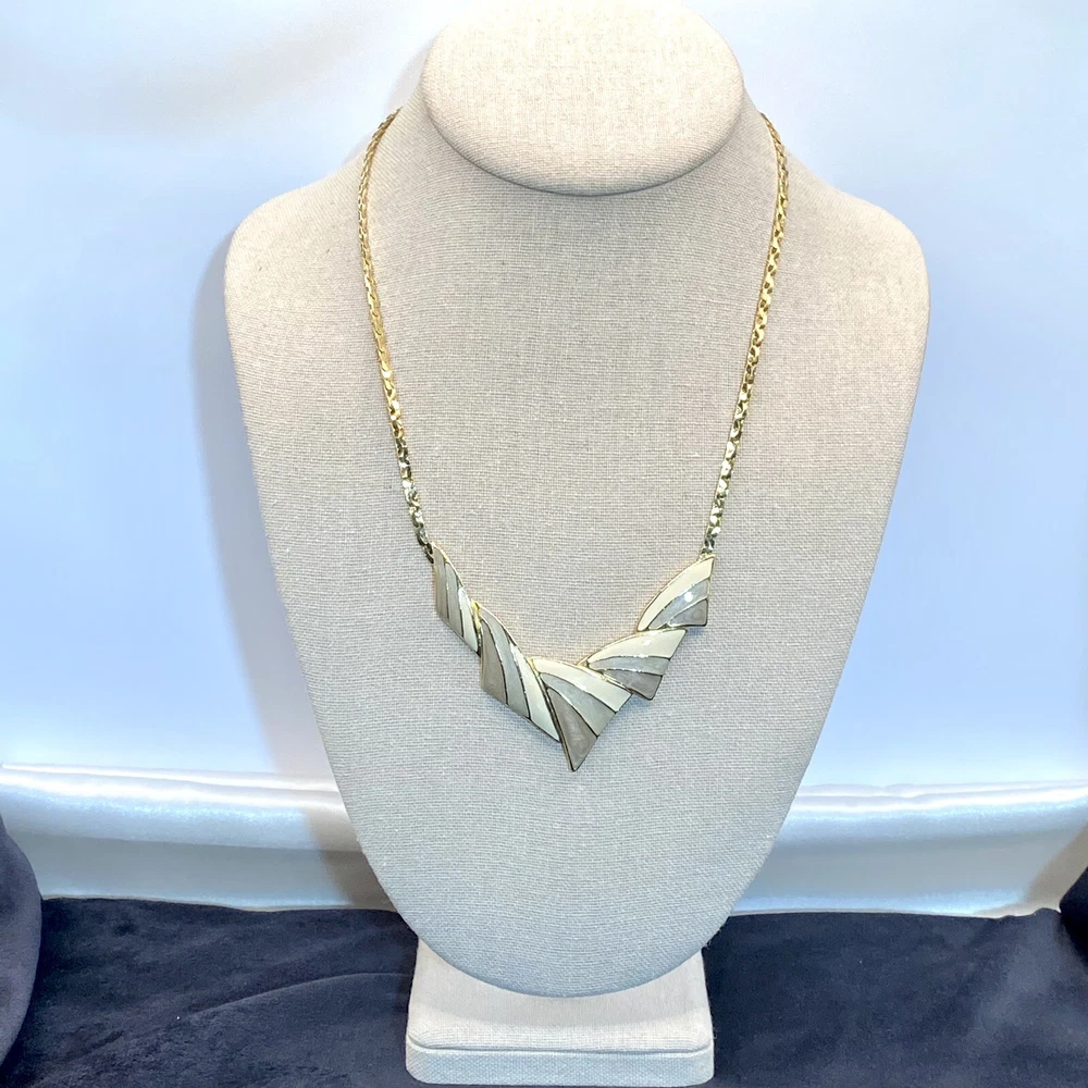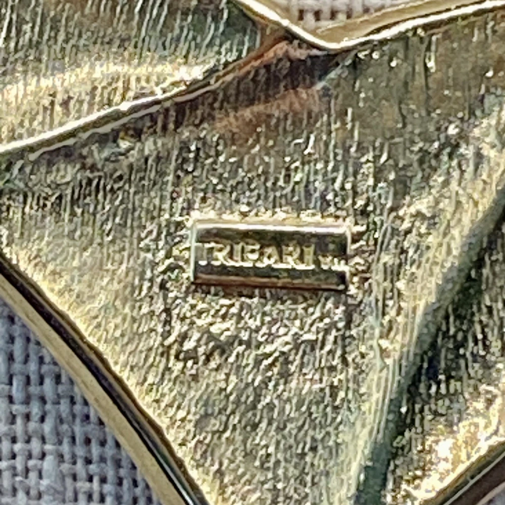 UPC: Does not apply Antique: No Country/Region of Manufacture: Unknown Original/Reproduction: Original Pendant Shape: Triangle Gemstone Clarity Grade: Eye Clean Color: Gold Cream Gray Green Country of Manufacture: United States Metal: Gold tone Brand: Trifari Department: Unisex Adults Era: Undated Signed: Yes Theme: Art, Beauty, Family & Friends, Travel & Places Closure: Spring Ring Handmade: No Number of Gemstones: 0 Material: Metal Style: Chain Base Metal: Unknown gtin13: Does not apply Customized: No Jewelry Department: Fashion Main Stone: No Stone Necklace Length: 18 in Vintage: Yes Cut Grade: Excellent Country of Origin: Unknown Occasion: Anniversary, Birthday, Christening, Christmas, Confirmation/Communion, Engagement, Father's Day, Graduation, Mother's Day, Valentine's Day, Wedding Number of Diamonds: 0 Type: Necklace Pendant/Locket Type: Bar