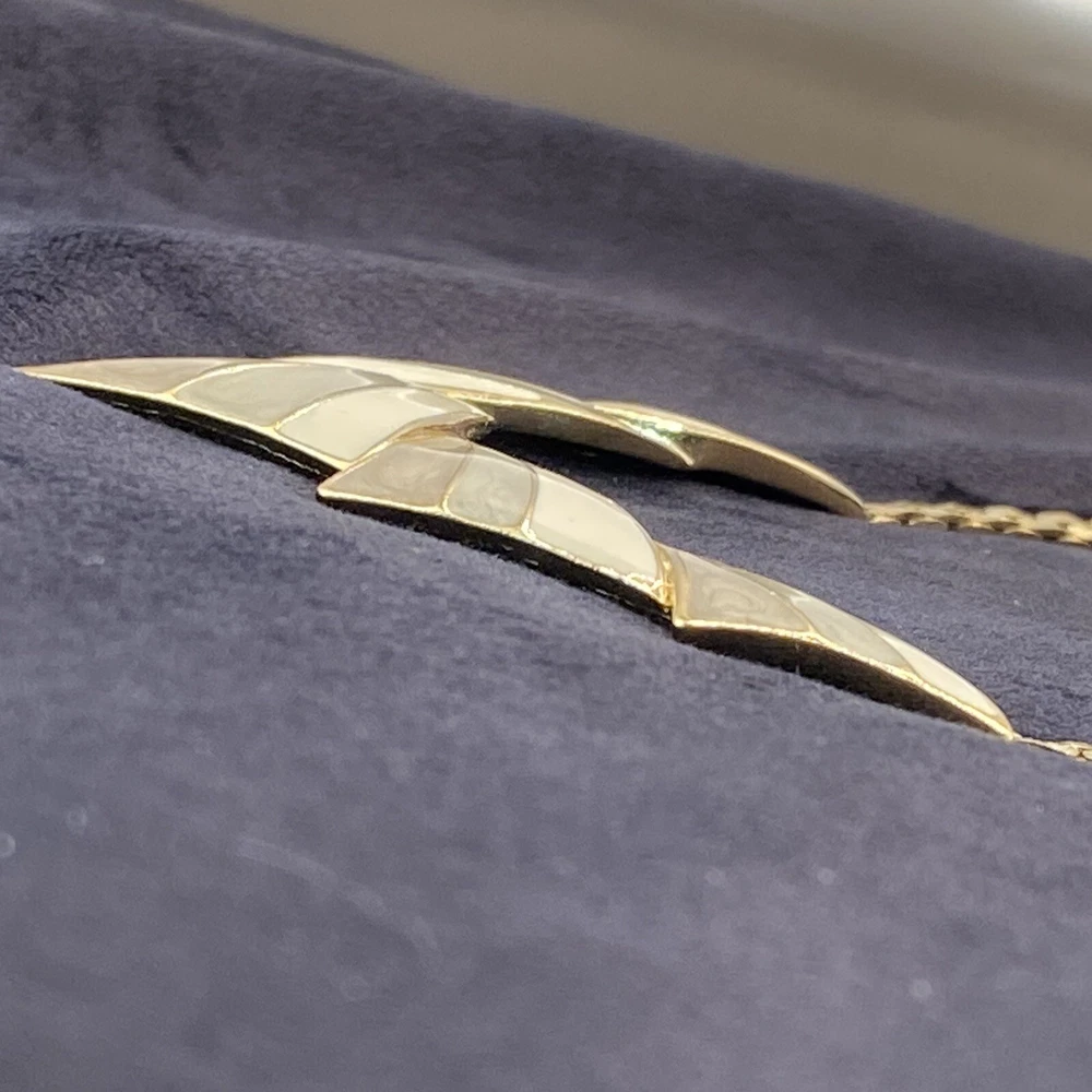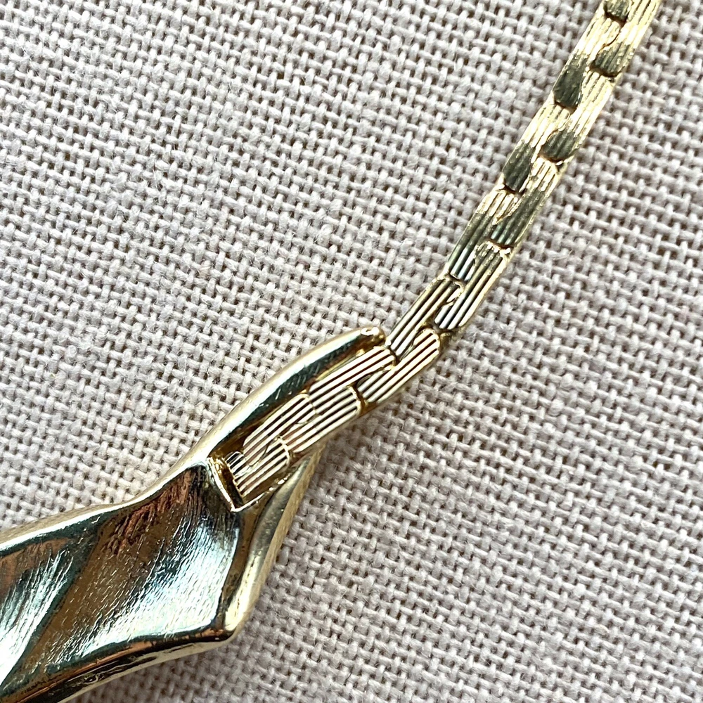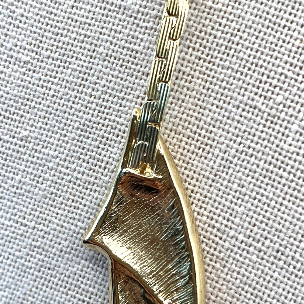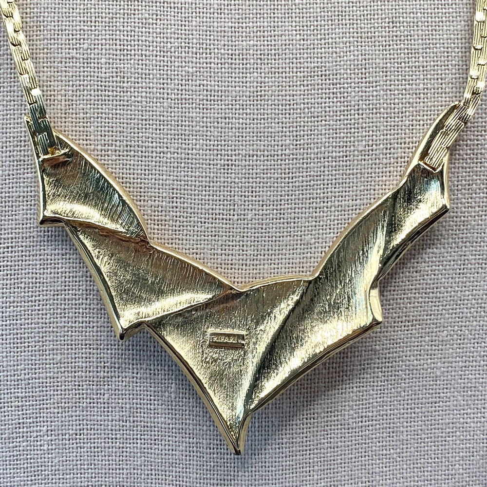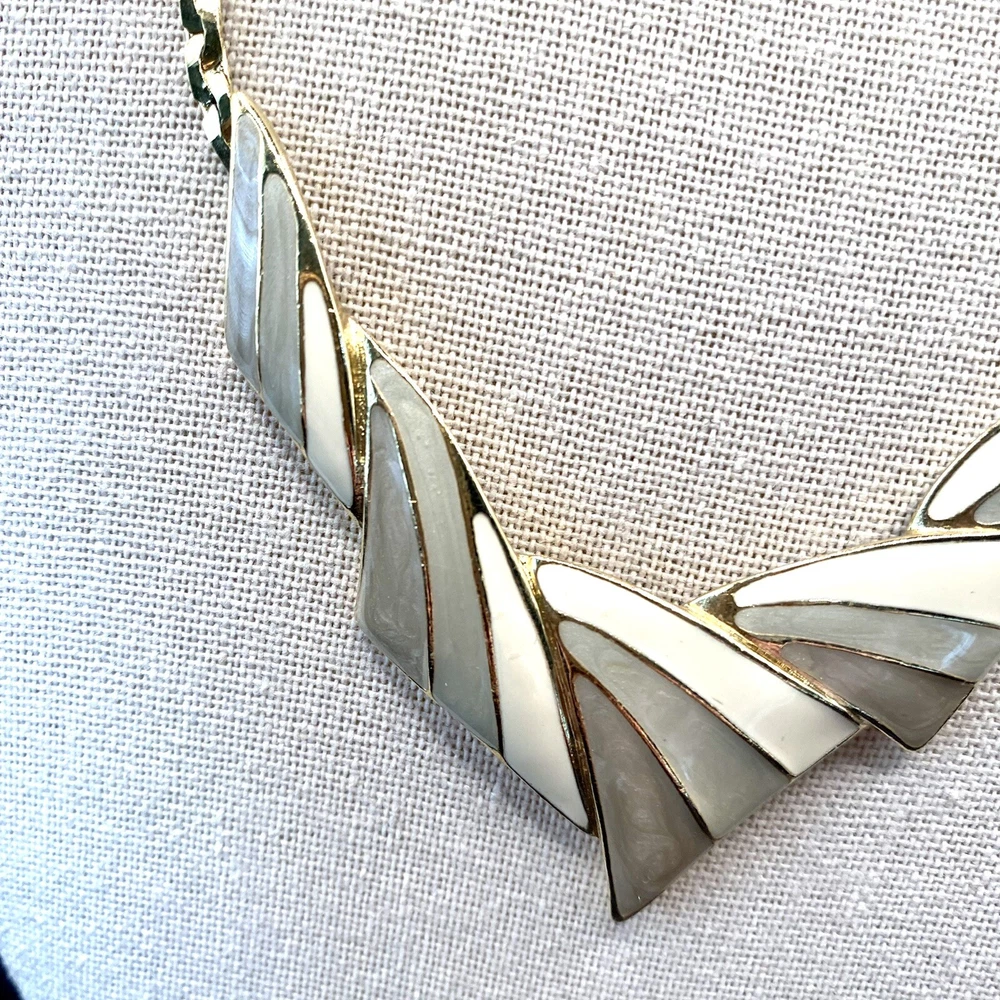UPC: Does not apply Antique: No Country/Region of Manufacture: Unknown Original/Reproduction: Original Pendant Shape: Triangle Gemstone Clarity Grade: Eye Clean Color: Gold Cream Gray Green Country of Manufacture: United States Metal: Gold tone Brand: Trifari Department: Unisex Adults Era: Undated Signed: Yes Theme: Art, Beauty, Family & Friends, Travel & Places Closure: Spring Ring Handmade: No Number of Gemstones: 0 Material: Metal Style: Chain Base Metal: Unknown gtin13: Does not apply Customized: No Jewelry Department: Fashion Main Stone: No Stone Necklace Length: 18 in Vintage: Yes Cut Grade: Excellent Country of Origin: Unknown Occasion: Anniversary, Birthday, Christening, Christmas, Confirmation/Communion, Engagement, Father's Day, Graduation, Mother's Day, Valentine's Day, Wedding Number of Diamonds: 0 Type: Necklace Pendant/Locket Type: Bar