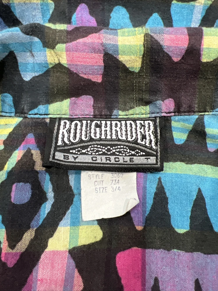 RoughRider By Circle T Plaid Western Rodeo Cowgirl Peek a boo Button Down Size 3/4 Measurements laying flat: Shoulder to shoulder: 16” Bust: 18” Sleeve length: 23” Shoulder to hem: 22” #R55