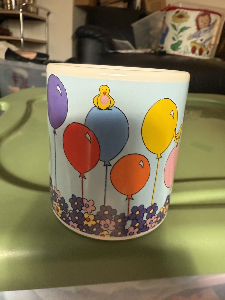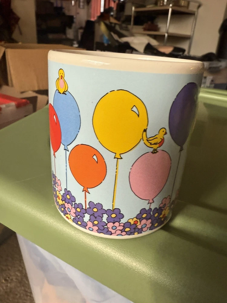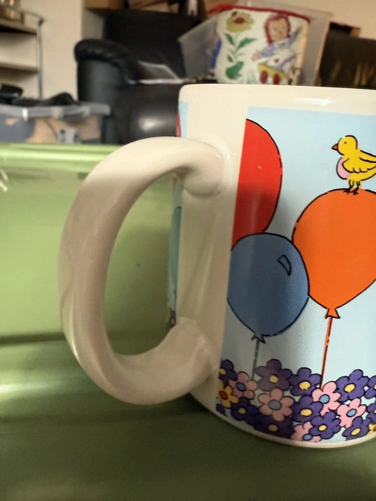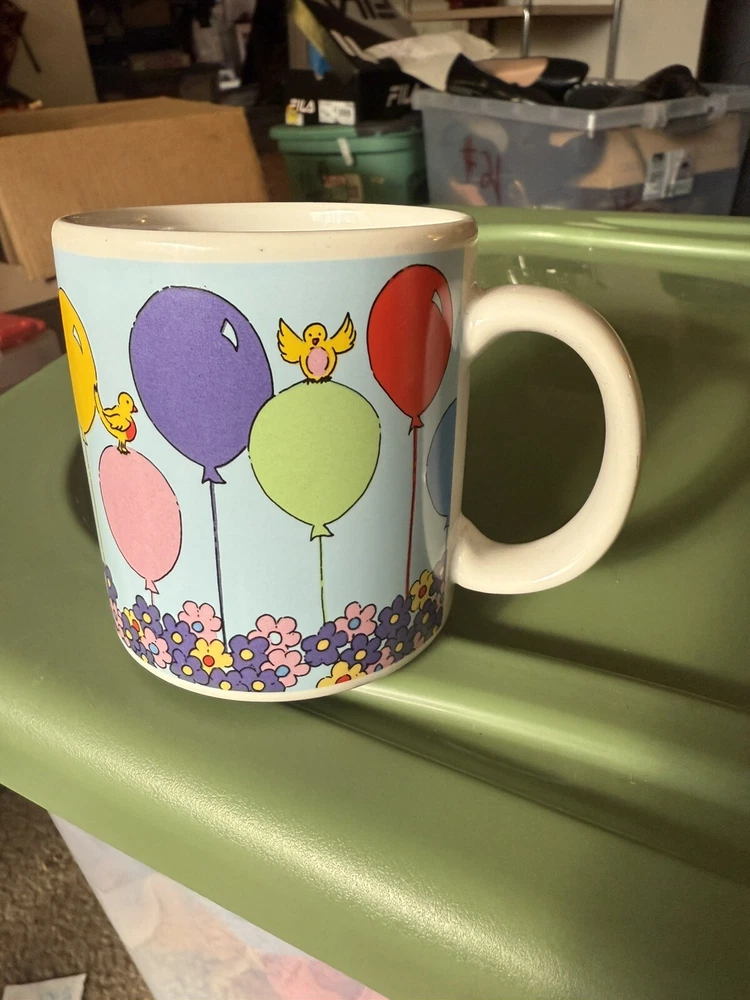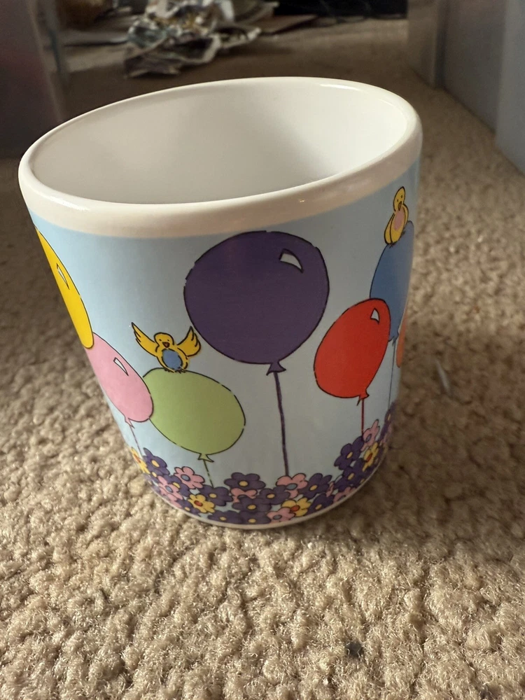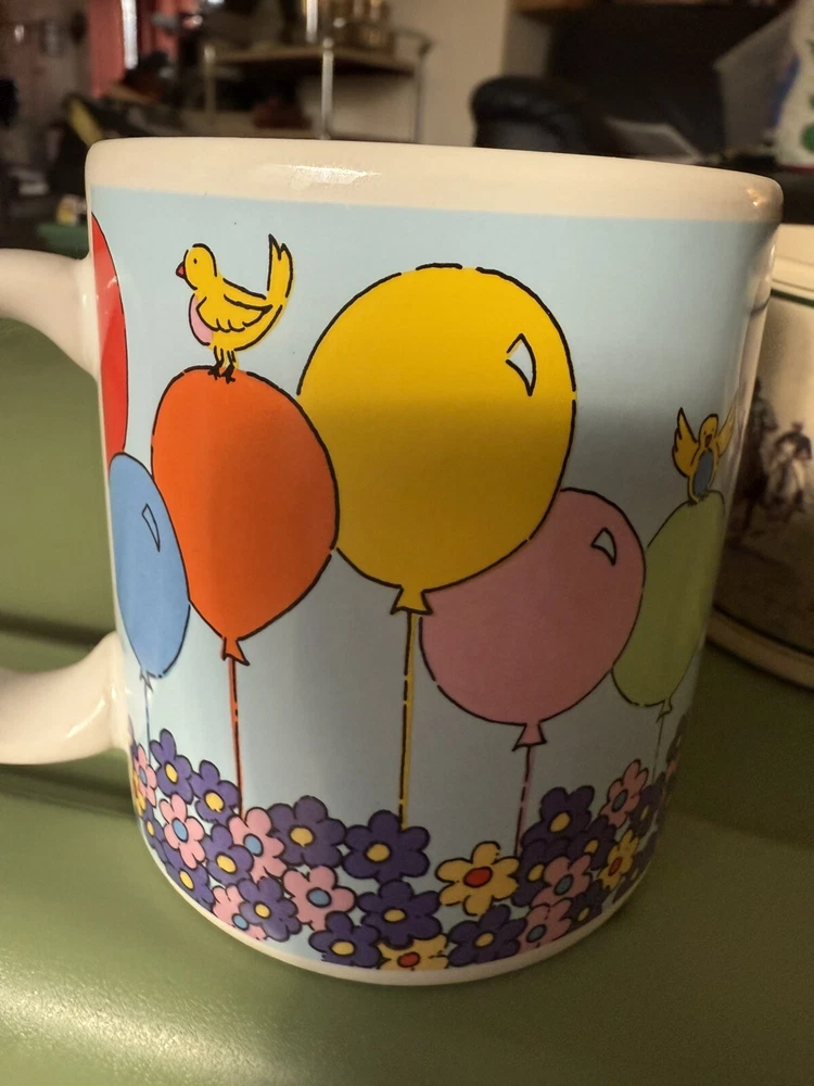 In great condition, no chips or cracks. Please see all photos as they are part of my description for the product. Please message me with any questions as I do not accept returns on this item. Celebrate your birthday with a touch of vintage charm using the Russ Berrie & Co Happy Birthday Mug. This colorful ceramic cup features a playful balloons pattern, along with florals and birds, that brings a cheerful vibe to your beverage experience. It's a versatile 14oz mug that's perfect for enjoying hot or cold drinks, making it a delightful addition to any birthday celebration.
