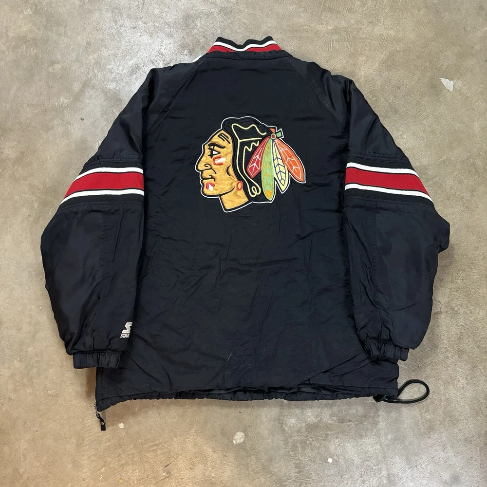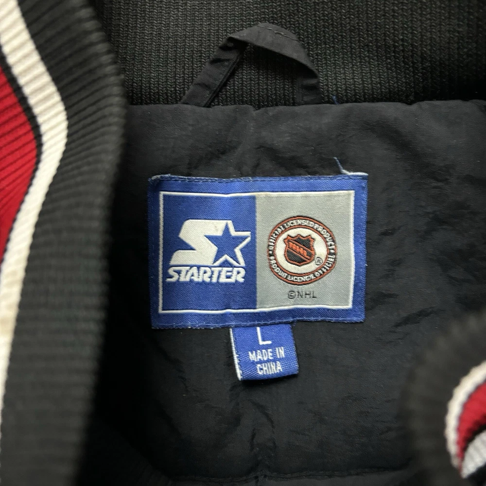 Size: L Product: Jacket Seller Notes: “great” Pre & Post Season: Regular Season Country/Region of Manufacture: China Team: Chicago Blackhawks Brand: Starter Sport: Hockey Color: Black, Red, White League: National Hockey League (NHL) Officially Licensed: Yes Gender: Men