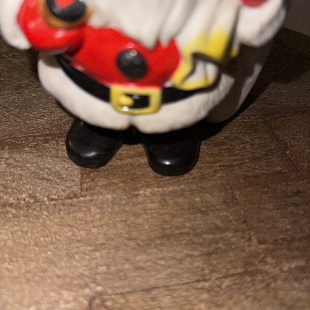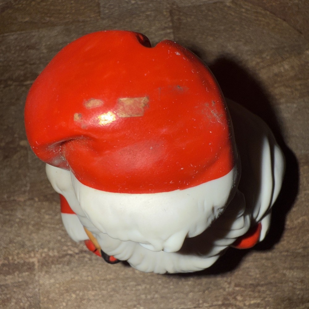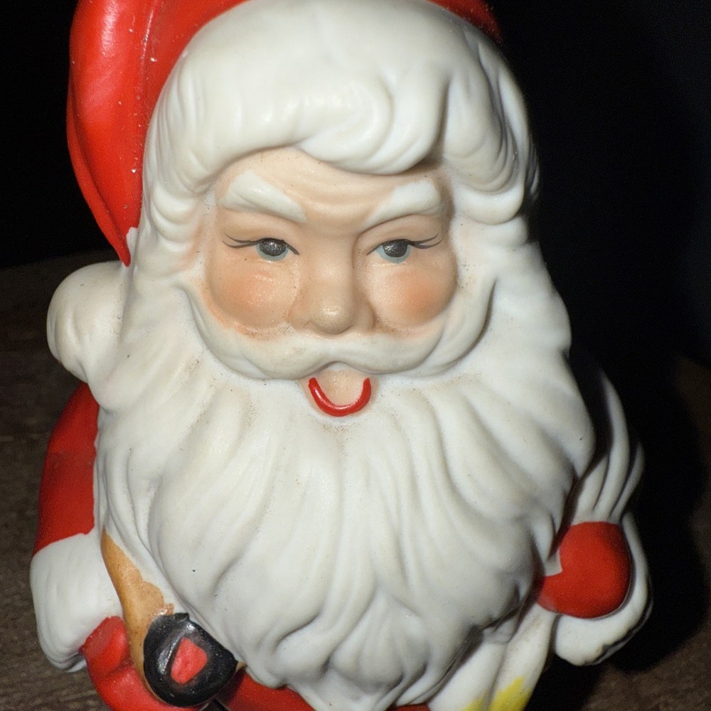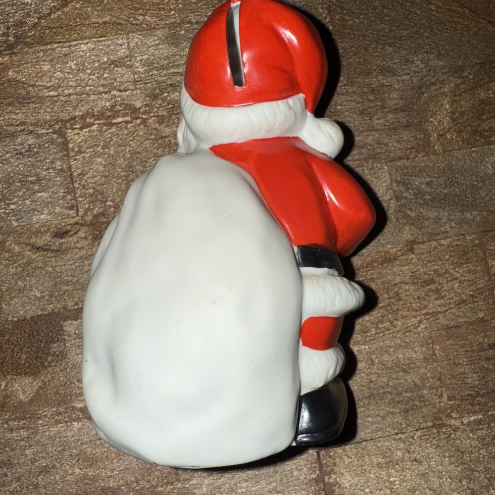 The product is a vintage Santa Claus coin bank from the 80's by Enesco. This ceramic Christmas holiday collectible features a festive Santa Claus design, perfect for collectors or holiday enthusiasts. The Enesco collection is known for its high-quality ceramic and porcelain figurines, making this a charming addition to any Christmas decor.