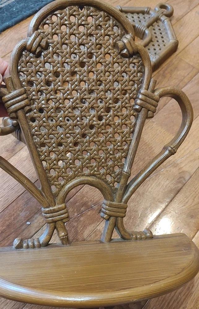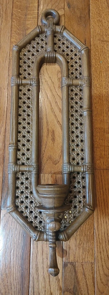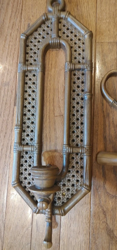 Vtg Set of 3, 2 Burwood Homco Faux Rattan Boho Wall Sconces Hanging Candle Holders and matching shelf, sconces are 21"x6", shelf is 15"x10" shelf has scratching on shelf base, shown in pictures, overall good condition, please view all photos, thank you.