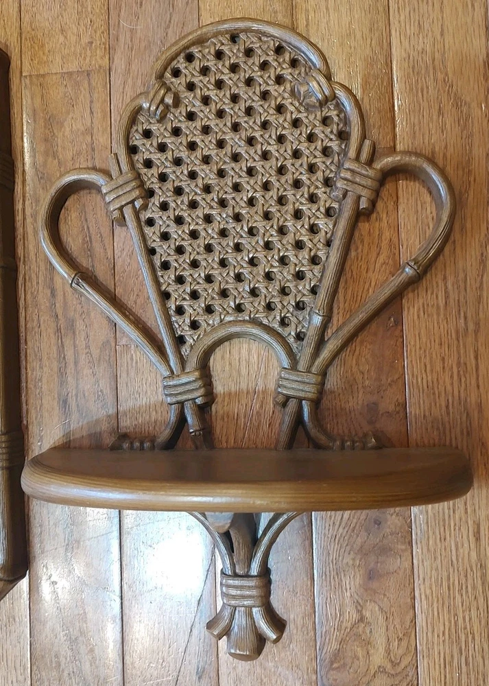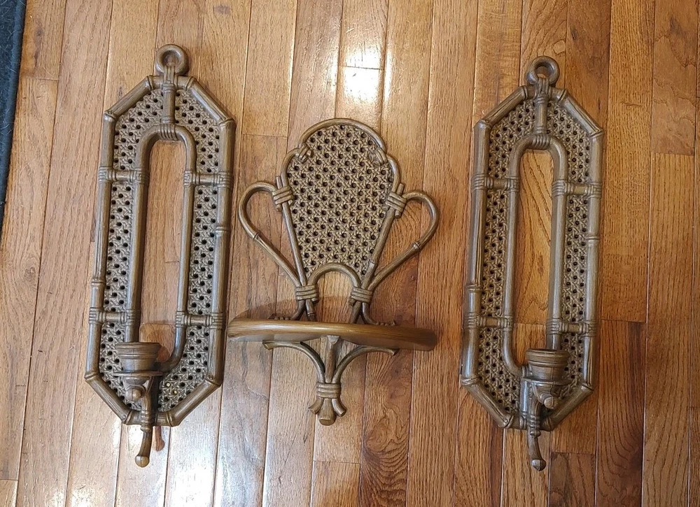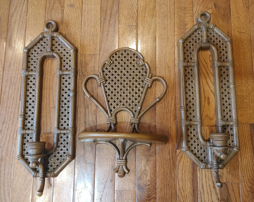Color: Brown Style: Bohemian Item Width: 6 in Item Height: 21 in Brand: Homco Occasion: All Occasions Theme: Periods & Styles Finish: Wood Effect Number in Pack: 3 Material: Plastic Size: Medium Room: Any Room Type: 2 Sconces & Shelf Country/Region of Manufacture: United States Time Period Manufactured: 1980-1989 Suitable For: Wall Item Length: 6 in Handmade: No Modified Item: No Era: Late 20th Century (1970-1999) Packaging: Unboxed Shape: Rectangle Pattern: Rattan Antique: No