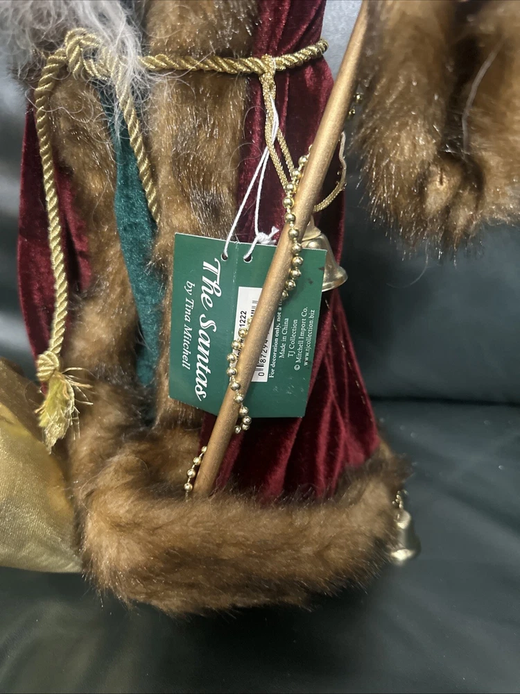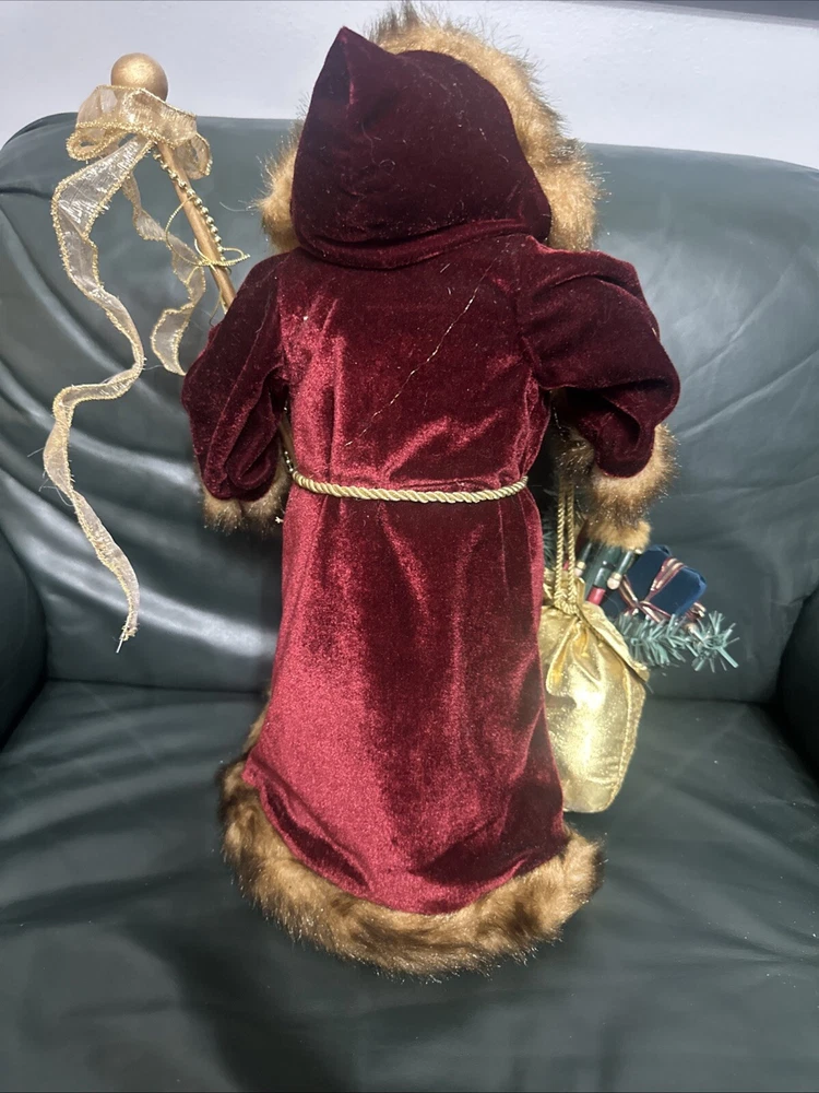 This large, handmade Southwest Ethnic Santa figure features a unique 3D effect and textured finish. The Santa Claus character is depicted in a figural style with a real fur beard and a dreamcatcher. The item is hand-painted and made of mixed materials including wood, plastic, and fabric. It is designed with an ethnic theme and is part of the Southwest Frontiersman collection, showcasing art, wildlife, and seasonal elements.
