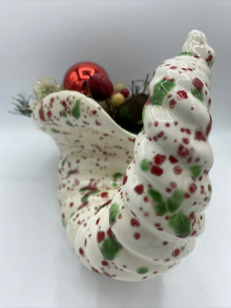 Centerpiece measures approx. 14"x8" and is filled with vintage glass ornaments and floral picks, Taper candle holders measure 5"x4". Both items have age related crazing and a few chis on the glaze . Please see photos, I tried to get pictures of all imperfections. Hassle fee returns