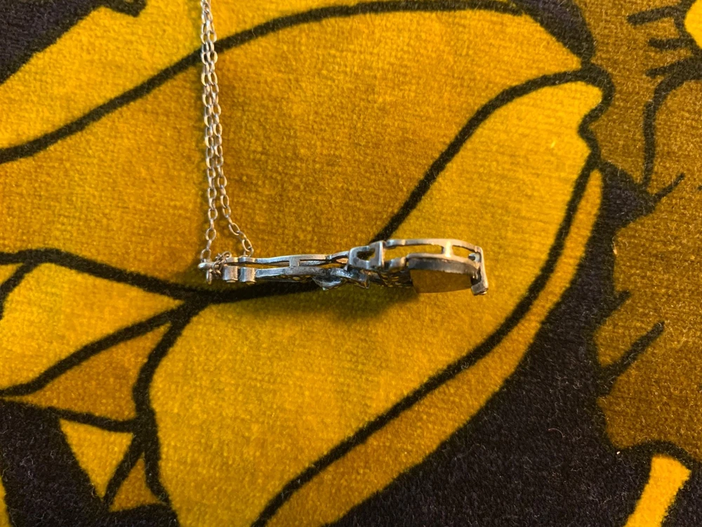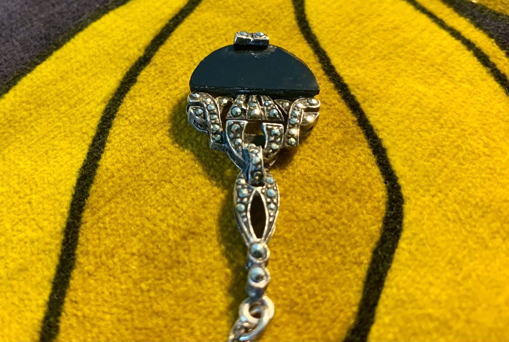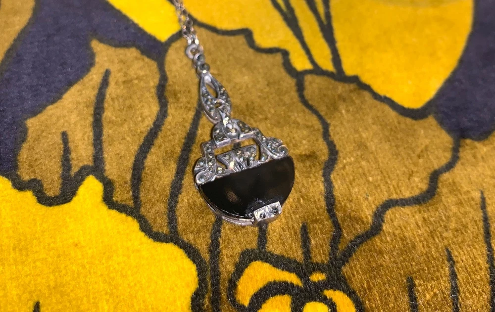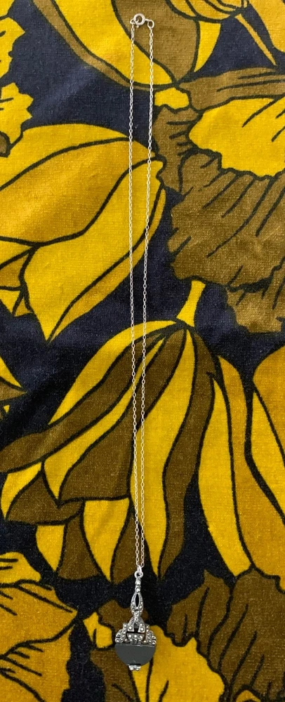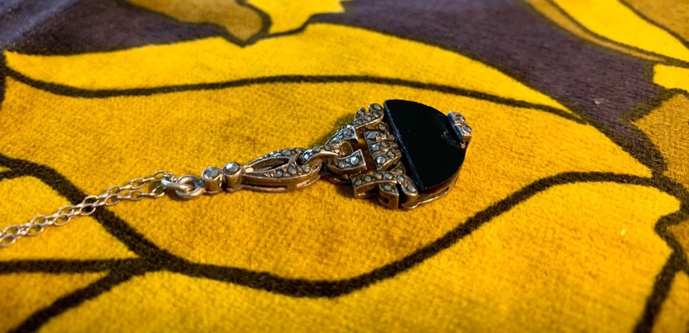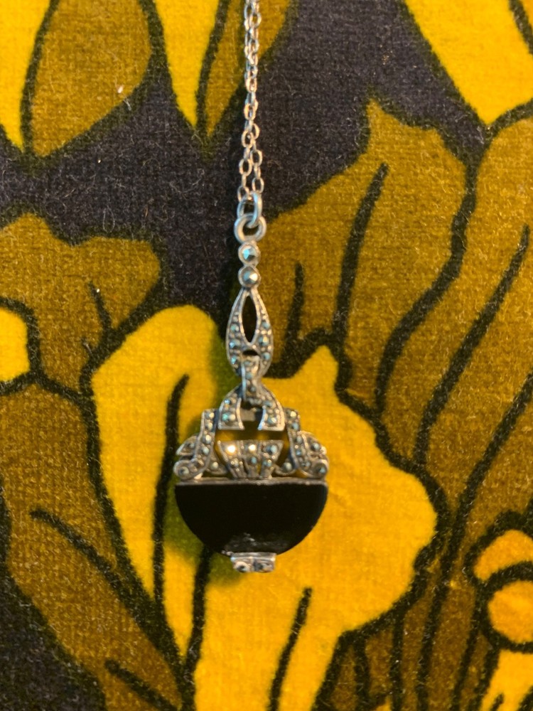 A striking vintage necklace featuring a beautifully detailed Art Deco–inspired pendant with genuine black onyx and marcasite set in silver-tone, likely sterling silver, consistent with similar age pieces. The elegant design evokes the 1920s–40s era with delicate milgrain and filigree elements, all in very good vintage condition. Material: Chain is s terling silver, pendant no mark but likely silver too. Gemstones: Black onyx (or black glass) with marcasite accents Pendant size: Approx. 1.25" (including bail) Chain length: ~18" sterling silver fine link chain Closure: Spring ring Era: Art Deco or Mid-century vintage Art Deco revival styling Condition: Very good vintage condition; light patina consistent with age A timeless, collectible piece, perfect for vintage jewelry lovers or Gatsby-inspired styling.