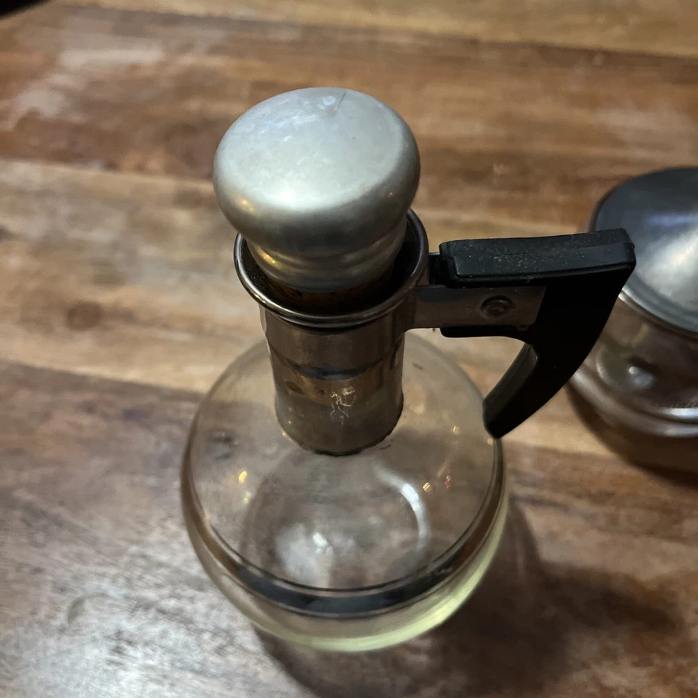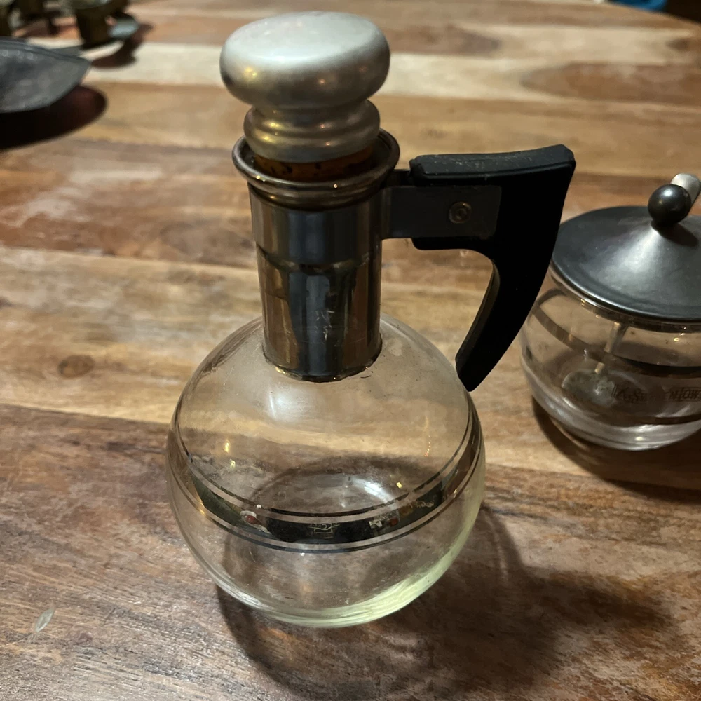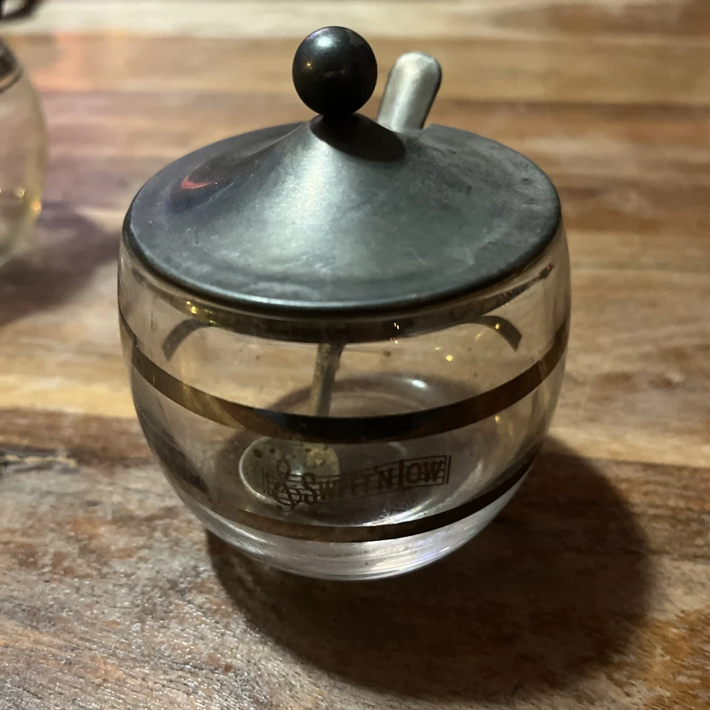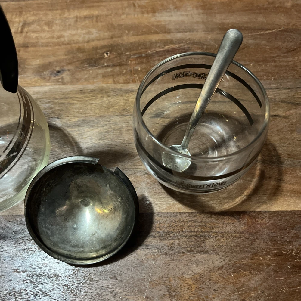 Elevate your kitchen decor with this vintage Sweet 'N Low sugar holder, complete with a spoon and carafe decanter. The retro design exudes a Mid-Century Modern charm, perfect for collectors and those who appreciate the aesthetic of past eras. Crafted in the 1960s and originating from the United States, this original piece showcases a delightful multi-color palette that will add a pop of color to any display. Whether it's for practical use or as a decorative item, this Corning Ware/Sweet-n-Low holder is a nostalgic nod to the food and beverage theme of the past. Carafe 6 inches tall about 3” wide Sweet n low container about 3 inches tall 3 inches in diameter