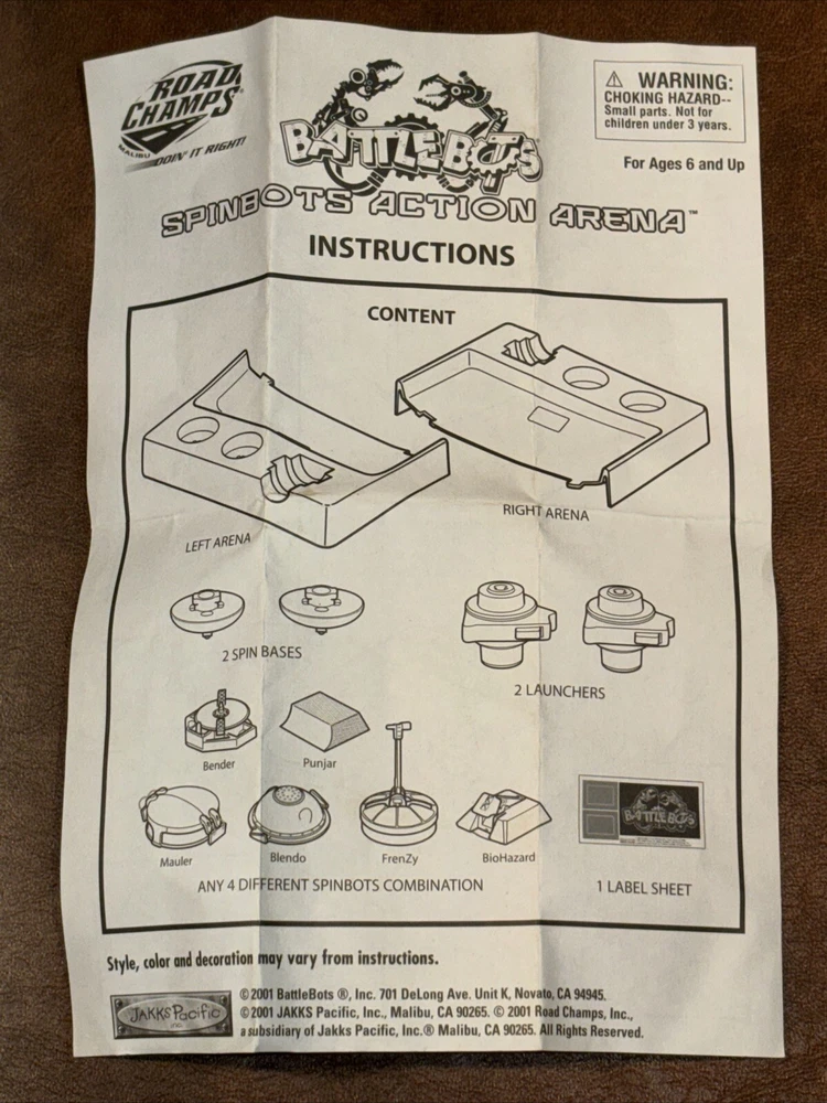 In pre owned very good condition with very light signs of ware. Signs of play ware to the battlebot arena with light dings and scratching to the battle area. (Pictured) All the battle bots and accessories are in very good to excellent condition with very light very minimal signs of play ware. Comes with a battle bot keychain in excellent condition with no signs of key chain ware or damage. All items are sold as pictured. This vintage toy from JAKKS Pacific is a must-have for any fan of BattleBots and Robots. The Action Figure type toy features a gray color BattleBots character and comes with a Spinbot arena. The toy is an original and was manufactured in China in 2001 during the 2000-2009 time period. The franchise is still popular today and this toy is a great addition to any collection. The material is ABS plastic and the toy is a Road Champs edition. Get your hands on this rare item before it's gone!
