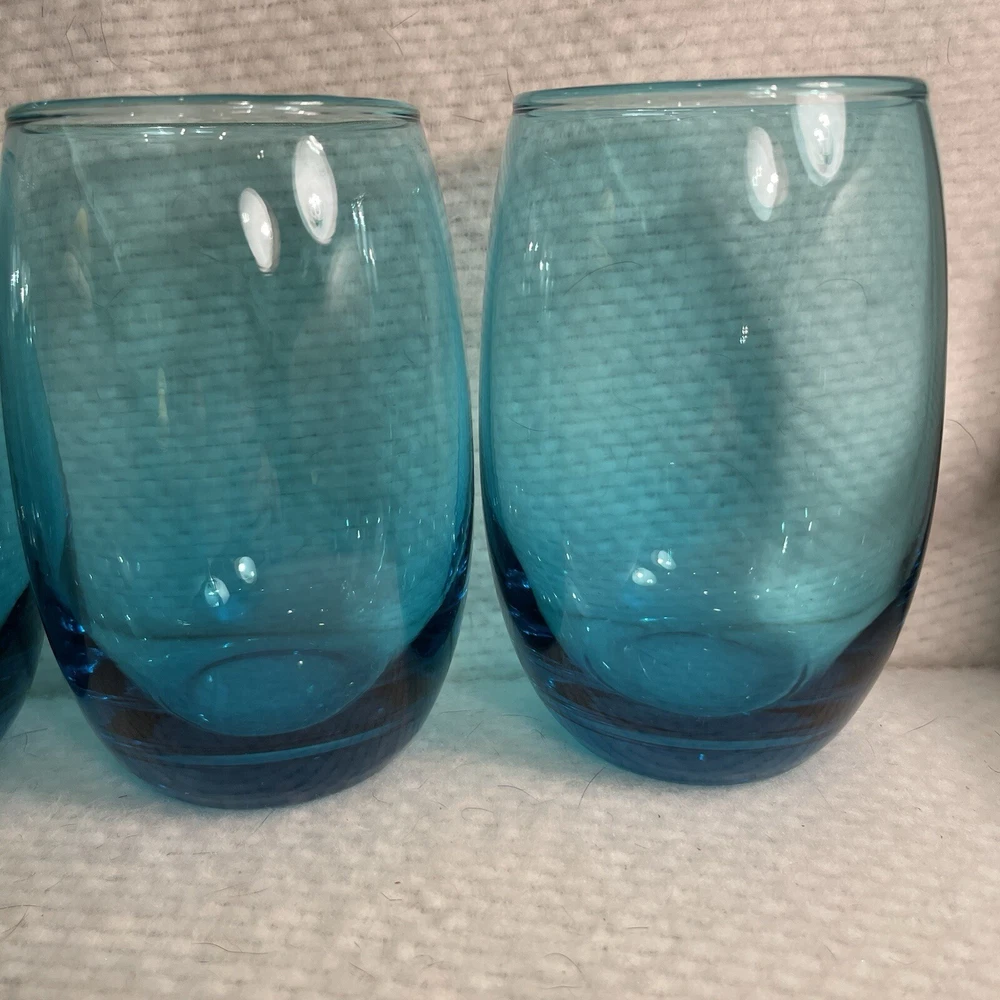 Add a touch of contemporary elegance to your drinkware collection with this vintage set of four stemless wine glasses. The glasses feature a solid turquoise color and a round shape with a diameter of 2.75 inches and a height of 5 inches. The glasses have a capacity of 16 ounces and come in a set of four, making them perfect for hosting a dinner party or a beach house getaway. Crafted from high-quality glass material, these wine glasses are both durable and stylish. The glasses are unmarked, adding to their contemporary appeal. The set is an original and is not a licensed reproduction. The glasses are both decorative and functional, making them a great addition to any home. Excellent condition. No chips or cracks.