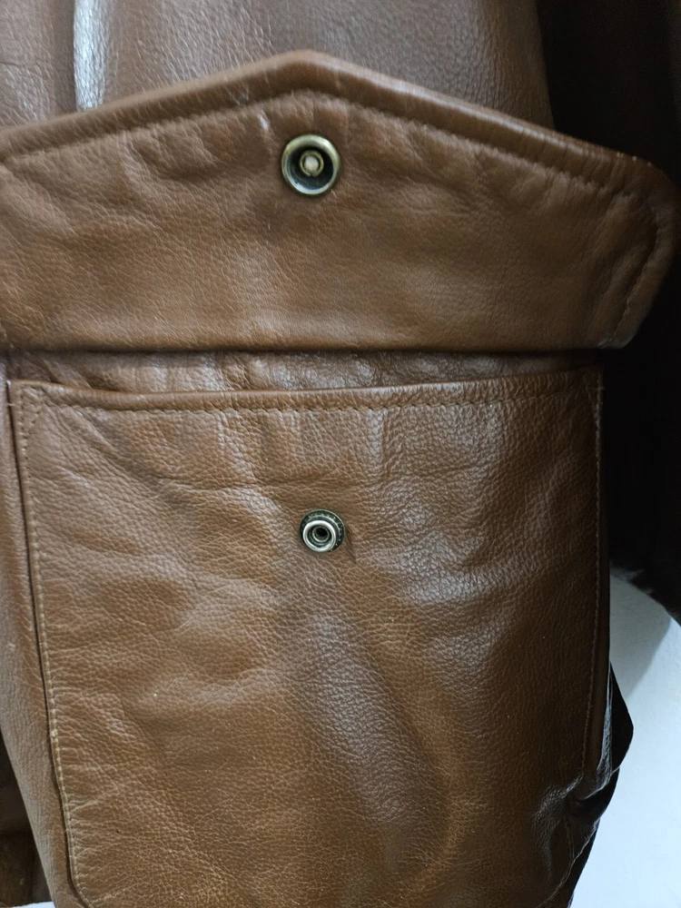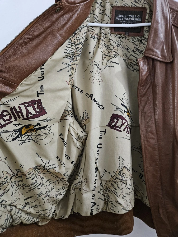 This is a vintage Type A-2 leather jacket in brown color made for the US Army Air Force. It is a mid-length bomber jacket made of leather with a polyester lining. The jacket has a spread collar, full zip closure, and accents such as pockets and a map lining. It is a 3XL regular fit jacket that is ideal for travel, riding, walking, or racing during the winter, fall, or spring seasons. The jacket has a classic, vintage look and is dry clean only. I tried to photograph any condition issues, I found the leather is looking really good overall please view photos for the best representation of condition