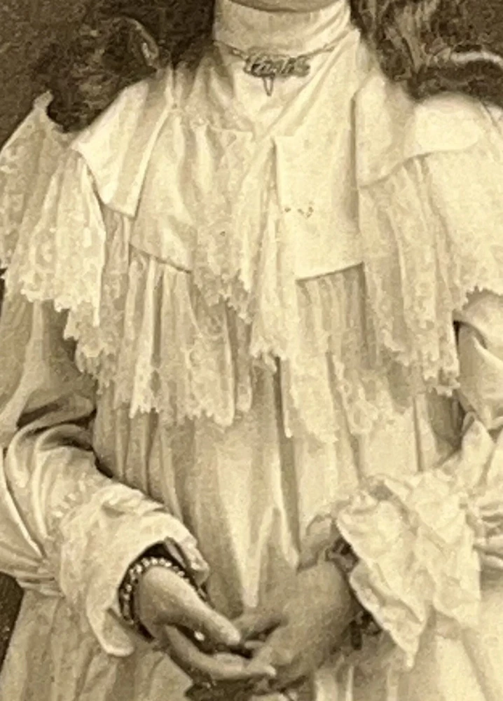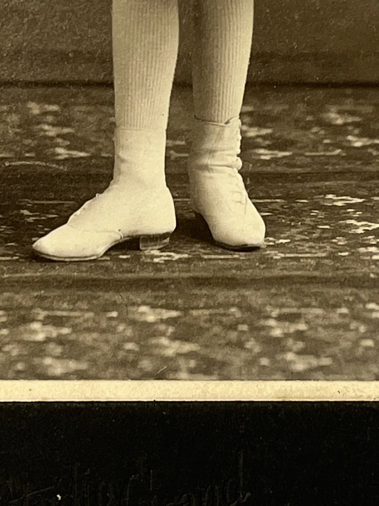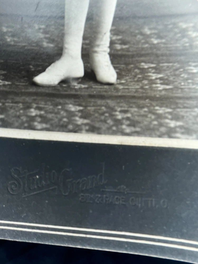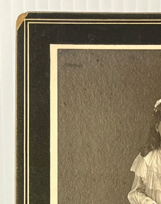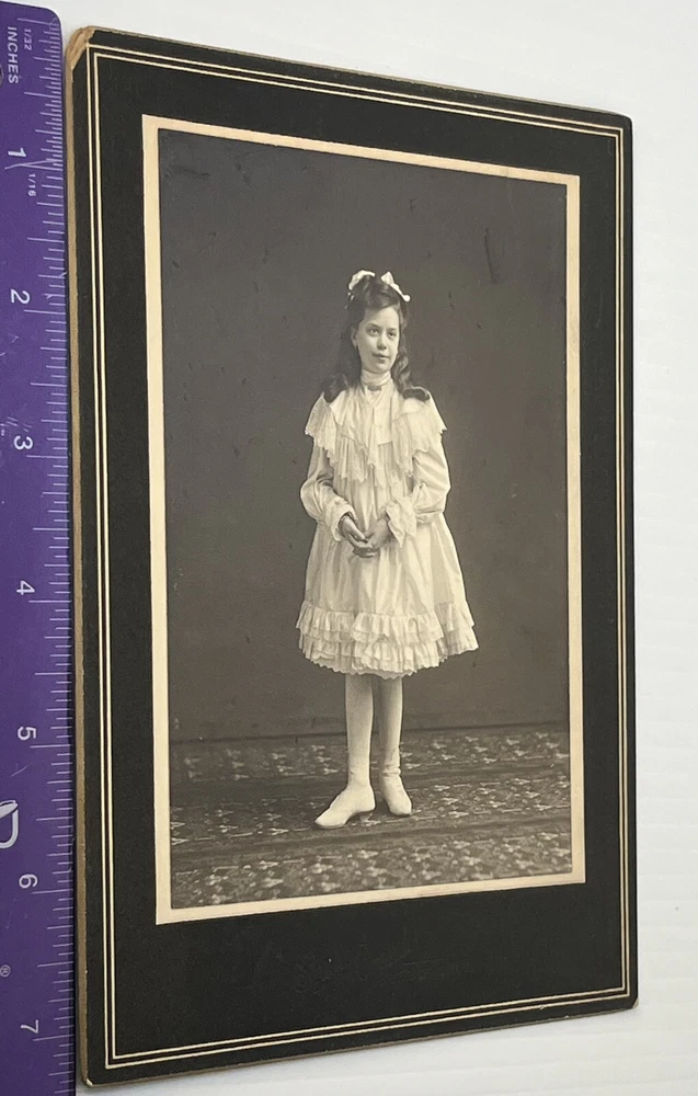 Victorian Cabinet card portrait of wealthy young girl in beautiful white frilled ruffle lace dress, stockings and high button shoes Adorned with jewelry, bracelets necklace and rings 6x4 inch Photograph on 7.5x5.5 inch board by Studio Grand, 8th & Race, Cincinnati Ohio Note: damage to upper left corner of board see photos Thank you