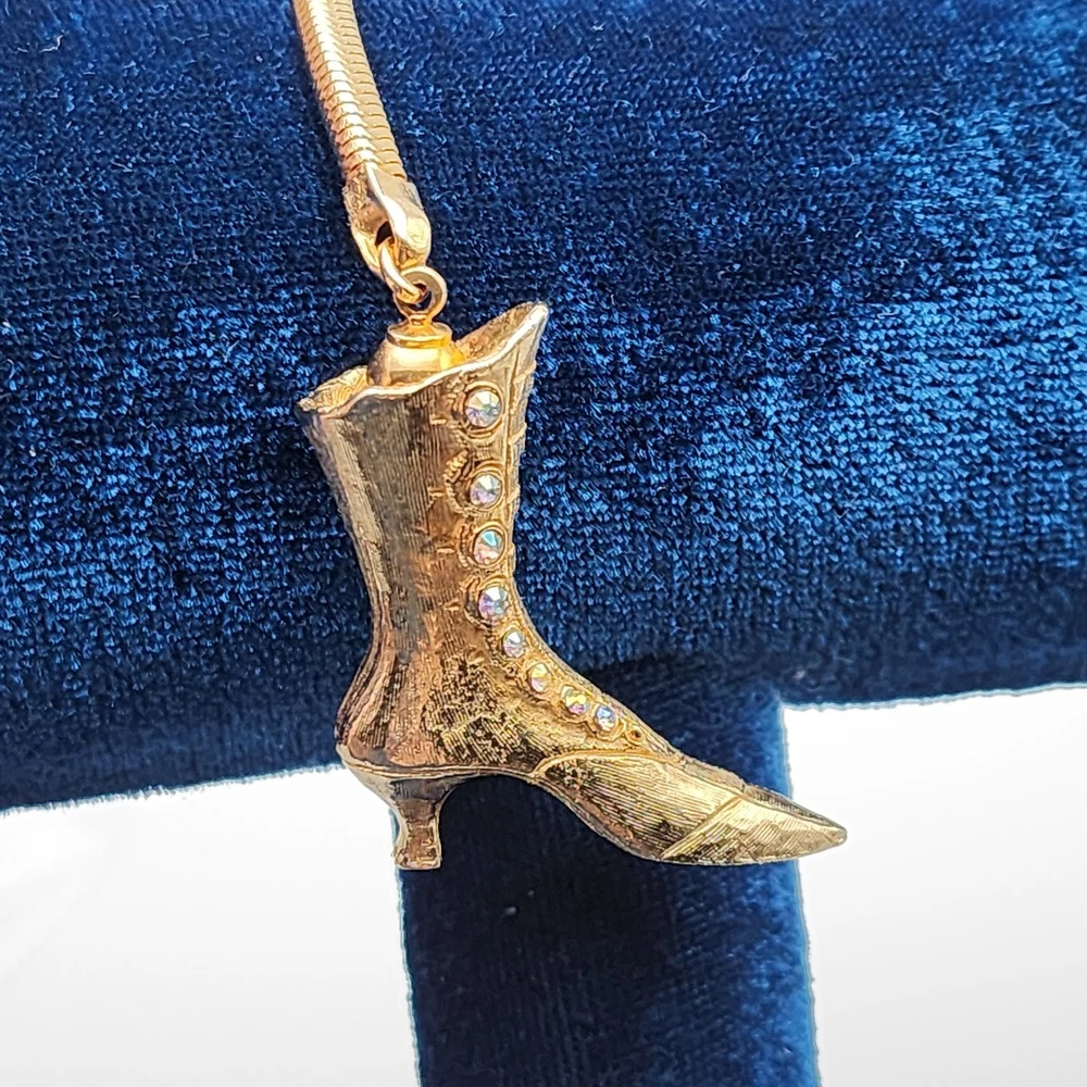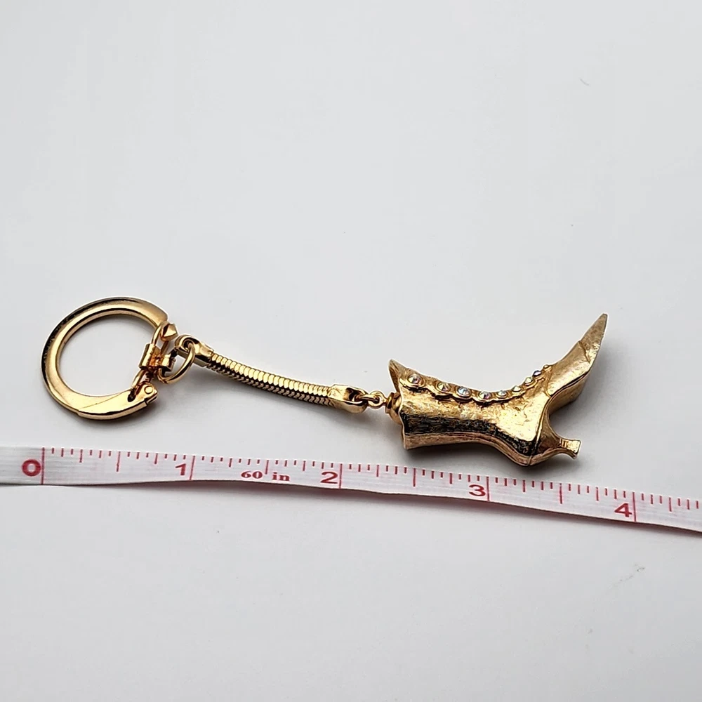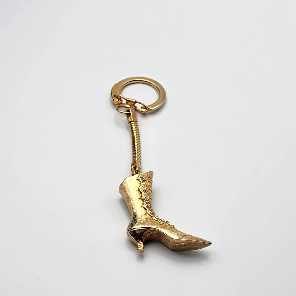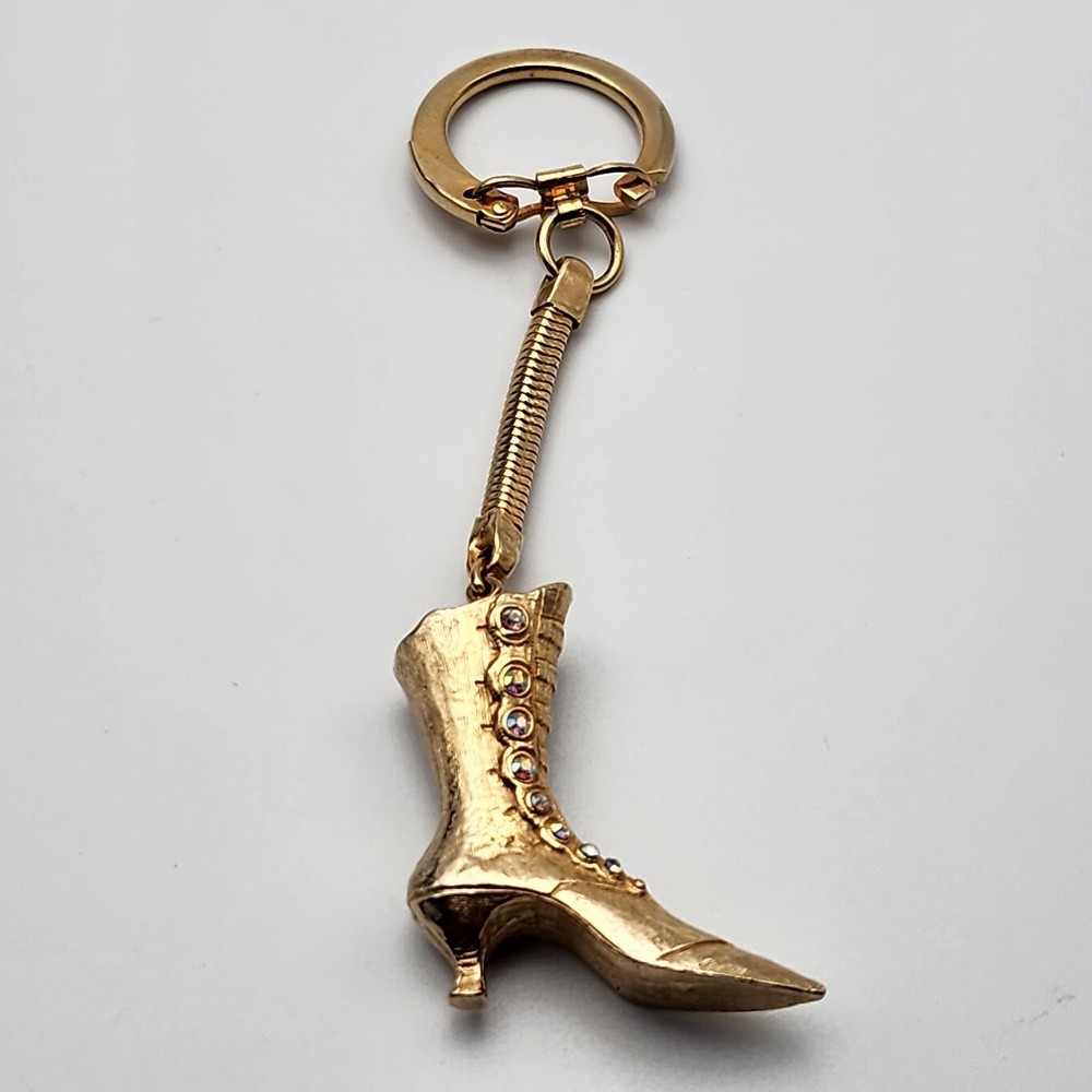 Vtg Victorian Ladies Boot Keychain AB Crystals Rhinestone Buttons Shoe Gold Tone