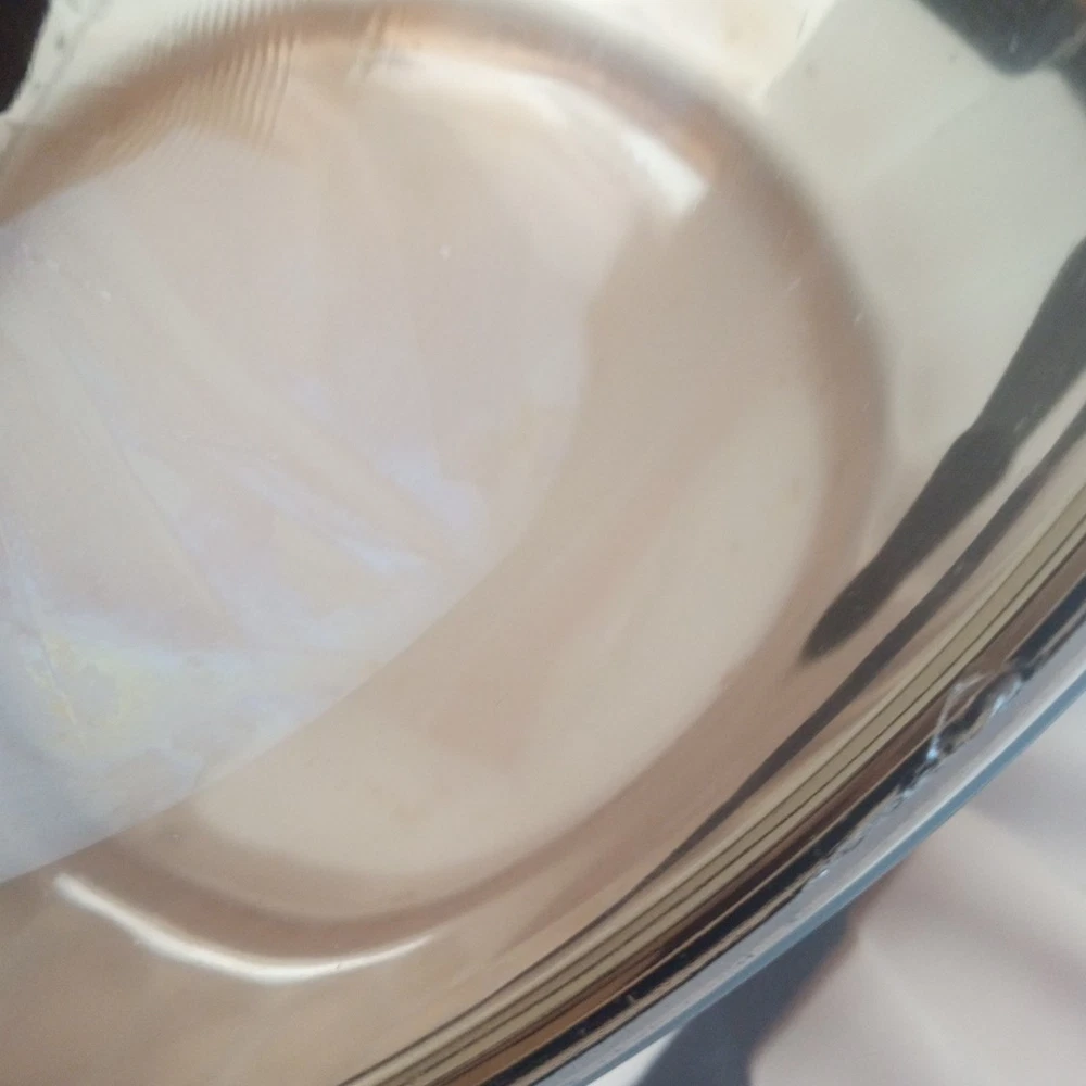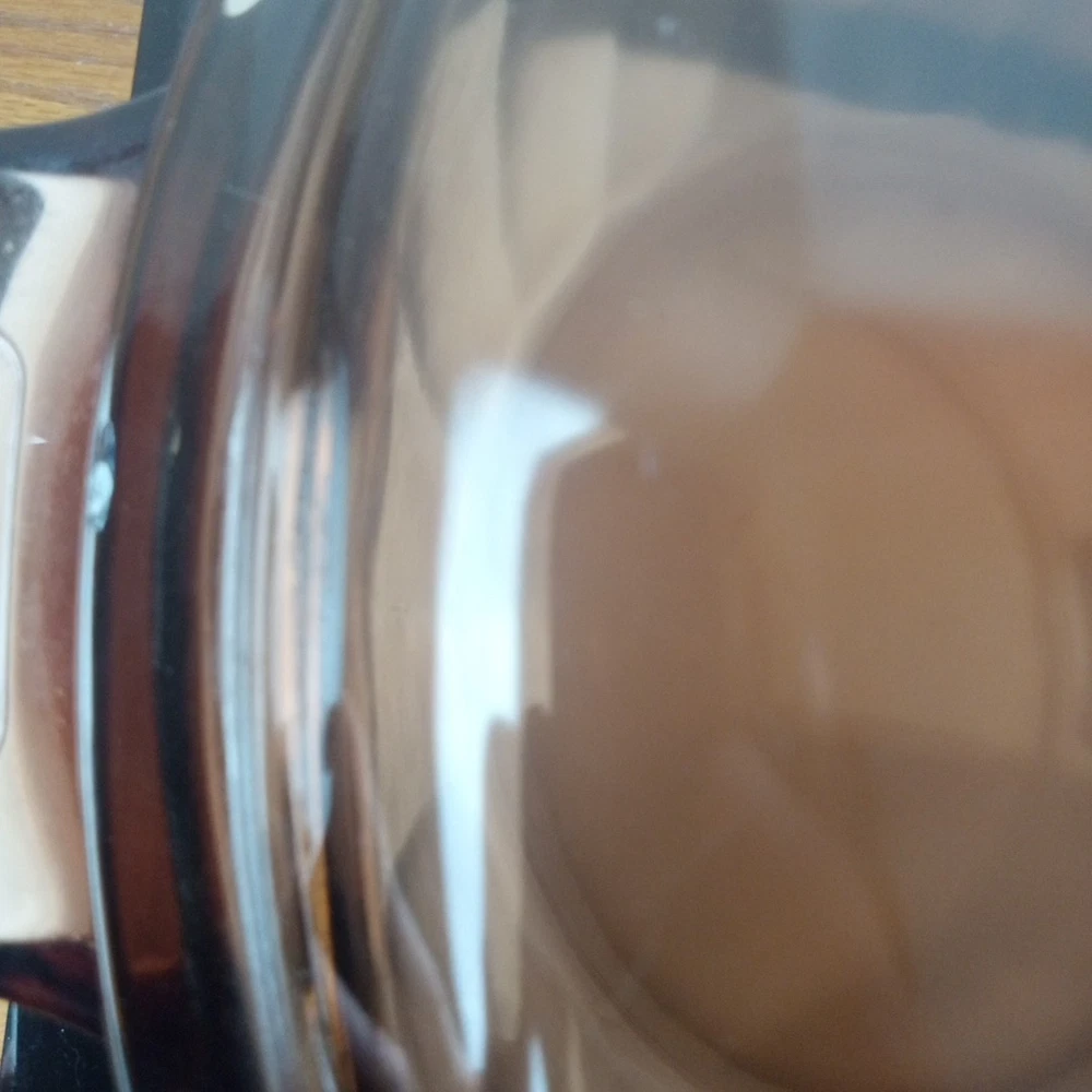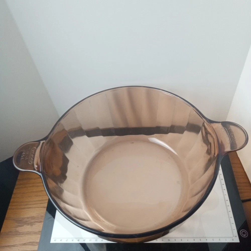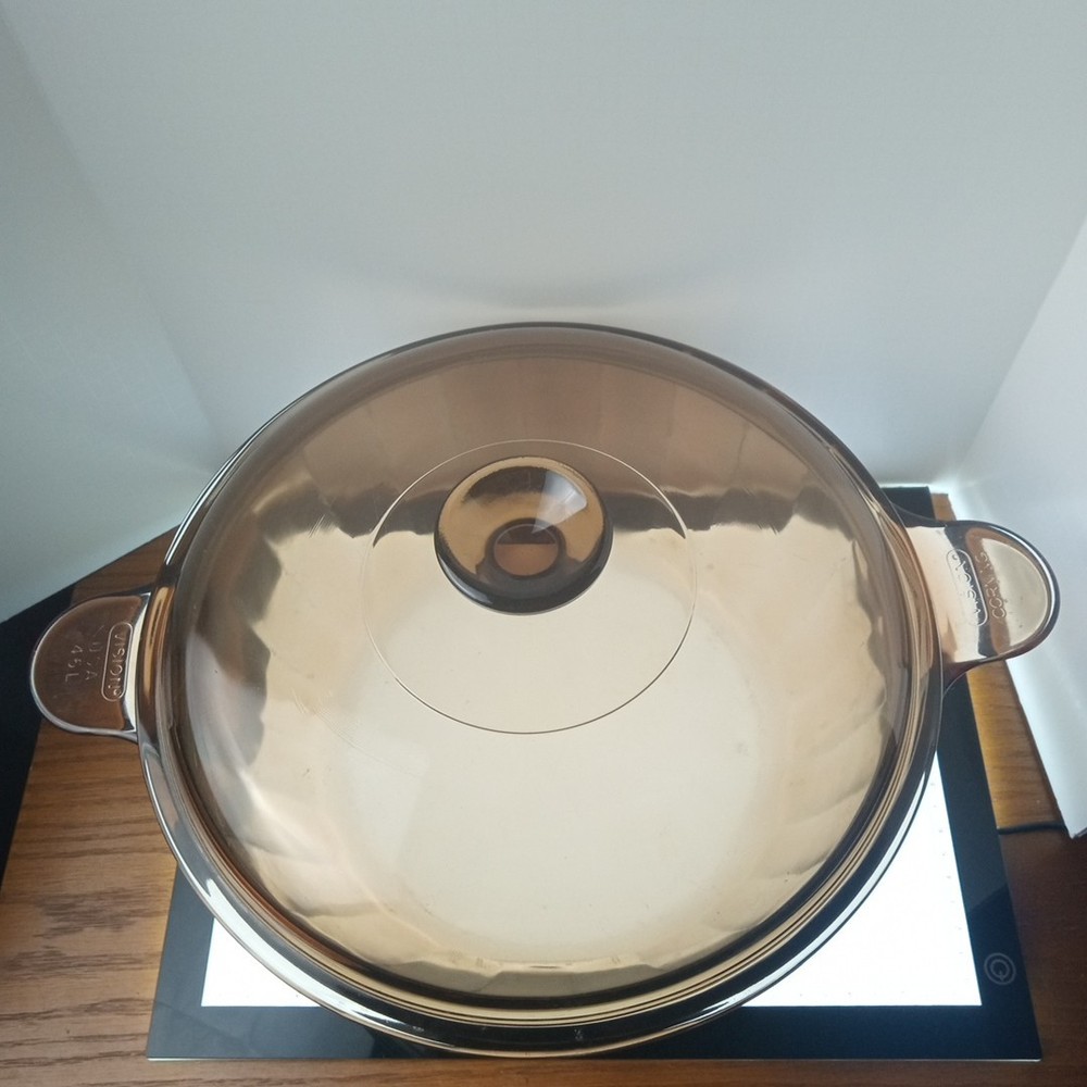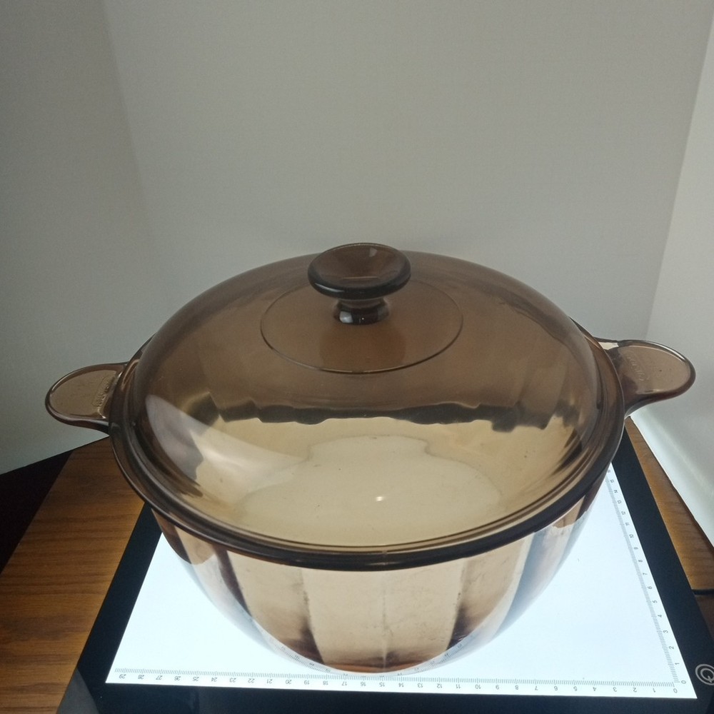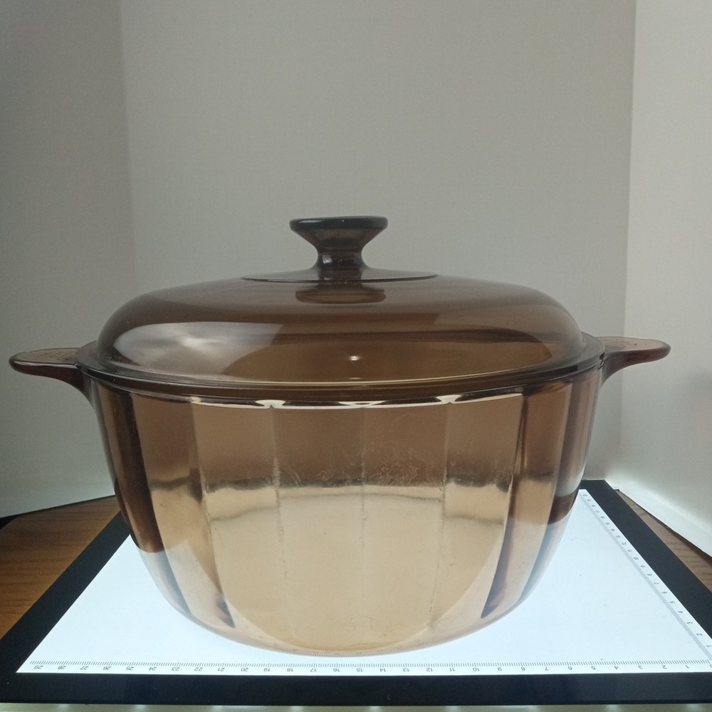 The product is a vintage CorningWare Pyrex 4.5L 5qt glass Dutch oven stock pot with a lid. This mid-century modern piece features a solid brown color and glossy finish, with a capacity of 4.5L. It is a pressed glass item with a non-stick surface coating, making it dishwasher safe and microwaveable. The Dutch oven is ideal for cooking on electric, gas, or microwave ovens, and is a collectible piece from the 1980s United States production.