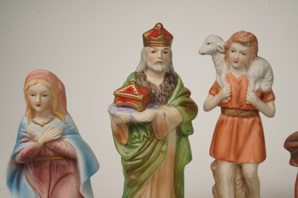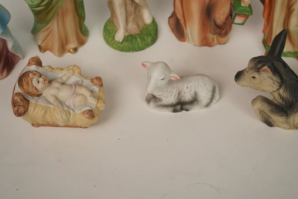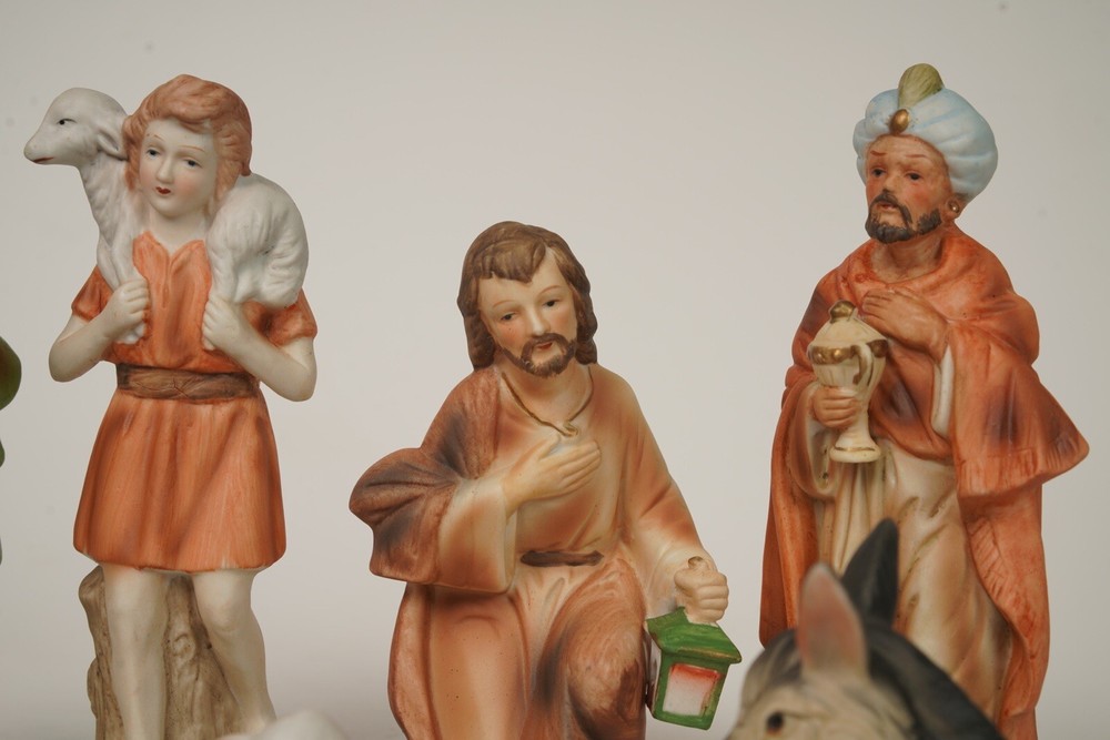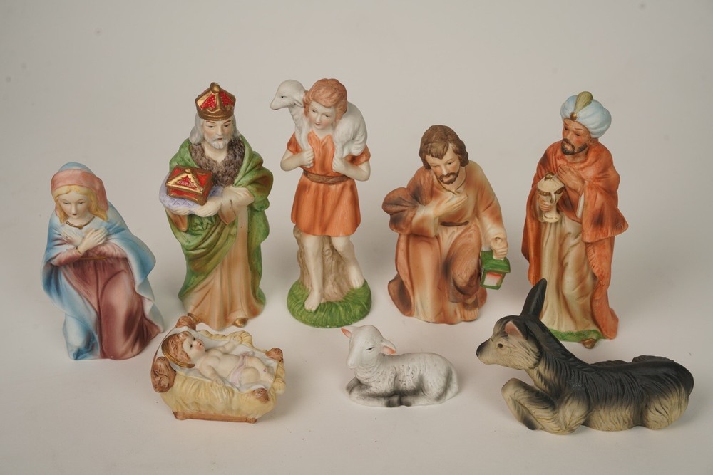 This listing includes 8 figurines and 1 stable only. The stable measures as 21"x8"x15". There is an optional broken 10th piece that only sent upon request. The 10th piece needs to be glued.