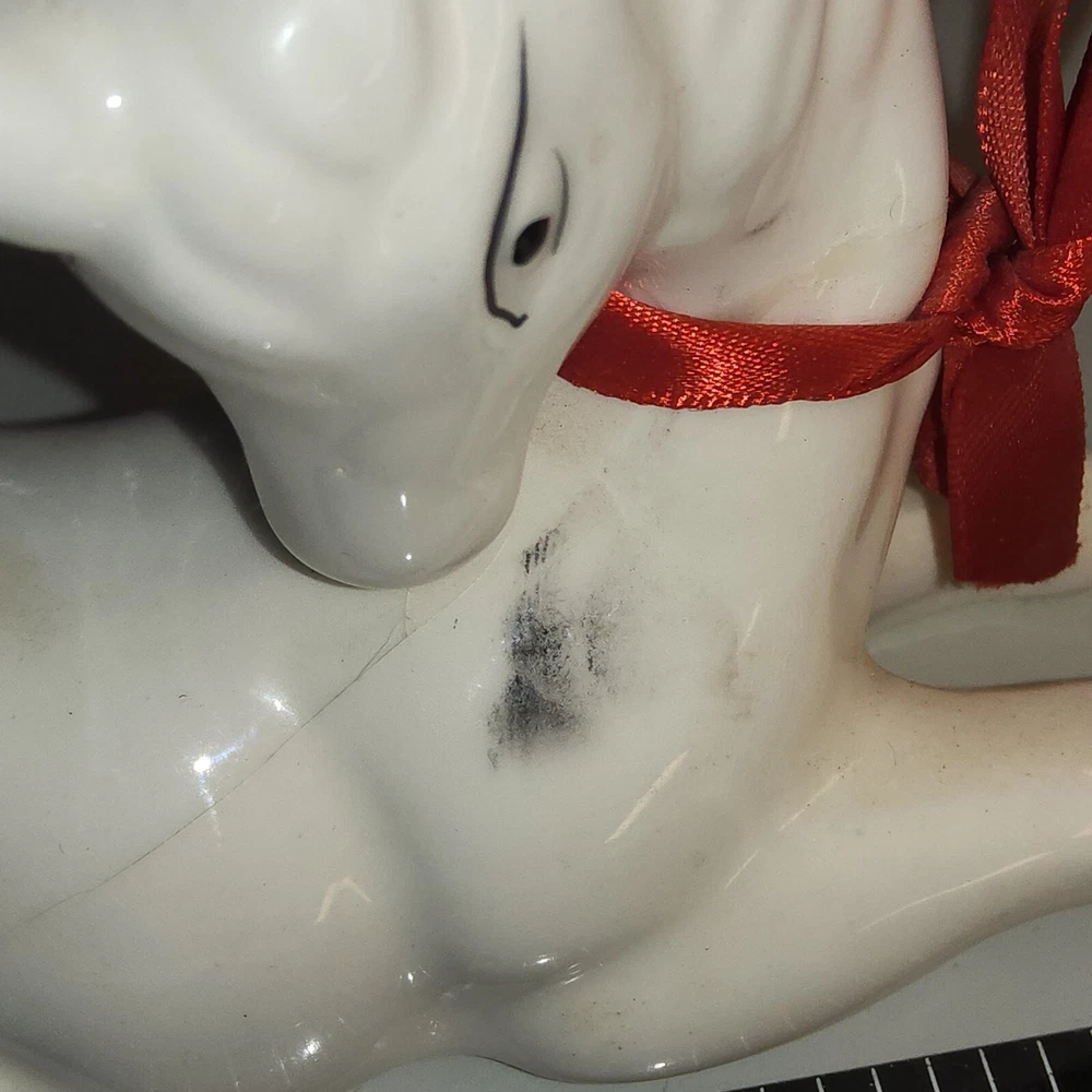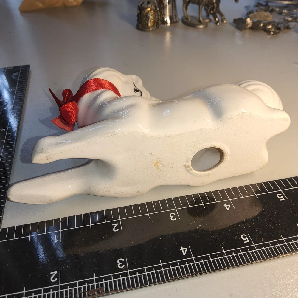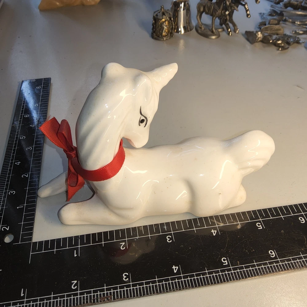 Vtg White Glazed stained Ceramic unicorn red bow Fawn Christmas Figurine Decor