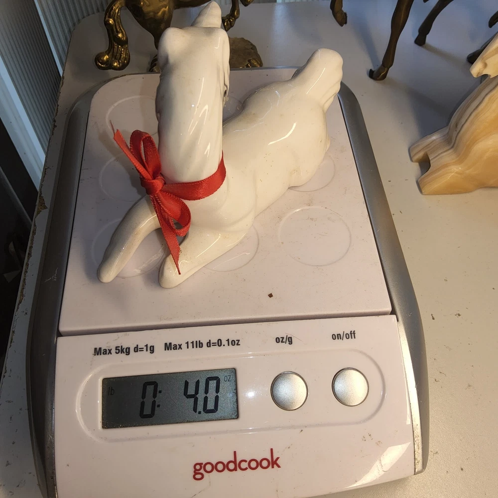 All unicorns in my listings are from 1980s. Maybe a few from 1970s. But definitely at least 37 years old. All came from same collector. Vtg White Glazed stained Ceramic unicorn red bow Fawn Christmas Figurine Decor Notice a dark stain by neck/bow. Didn't try to clean it so it may come off with rubbing alcohol perhaps. Looks like it has a hairline fracture on it as well but still solid. 6"w Please note condition before purchase. Always open to offers. Not attached to anything in shop. Here to keep product and revenue flowing,not hoarde. So feel free to write me with offers. I am very receptive. Please check out my laser cut art work available here as well. Not officially a "same day shipping" seller, but i live close to 2 post offices and make multiple trips daily. You'll more than likely to get your package out same day given enough handling time. If not, then 1st thing next morning. Unless you order on Saturday close to cut off time, then Monday morning. I won't apply to be 1 day processing seller because i can be downgraded if I'm not able to fulfill 1 day agreement for whatever reason. Just know, you can get that service from me. Unofficially. Thanks for shopping with TreasureSuite.