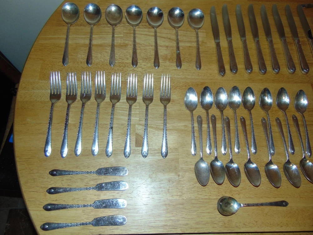 Vintage Wm. Rogers & Son IS "Exquisite" Silverware Flatware Set 1940 ~ 61 pcs. Set consist of 8 Knives, 8 Dinner Forks, 8 Salad Forks, 15 Teaspoons, 8 Butter Knives, 7 Soup Spoons, 1 Master Butter Knife, 1 Ladle, 3 Serving Spoons, 1 Serving Fork and 1 Sugar Spoon. Set weighs 5 lbs. 4 oz. and could use polishing. Low opening bid and no reserve. Buyer to pay shipping.