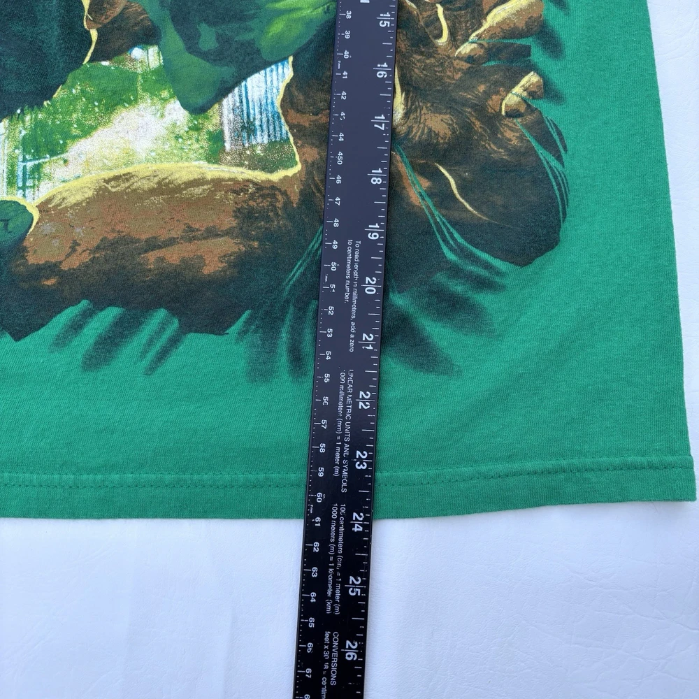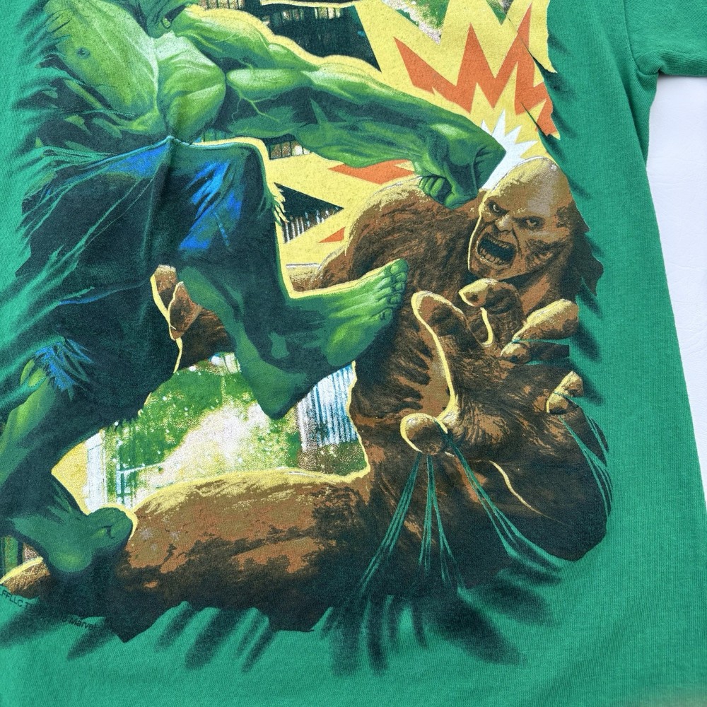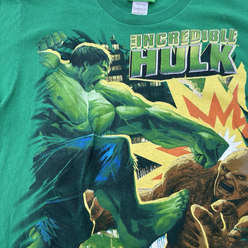 This vintage Y2K Incredible Hulk Marvel shirt in green, youth size large, features a big print of The Hulk, perfect for fans of the superhero. The pullover shirt with a crew neck and band collar is made from a blended fabric, making it lightweight and suitable for all seasons. Machine washable and featuring easy care, this shirt is a great addition to any casual outfit, whether it's for school or just hanging out. A must-have for young fans of Marvel's iconic character.