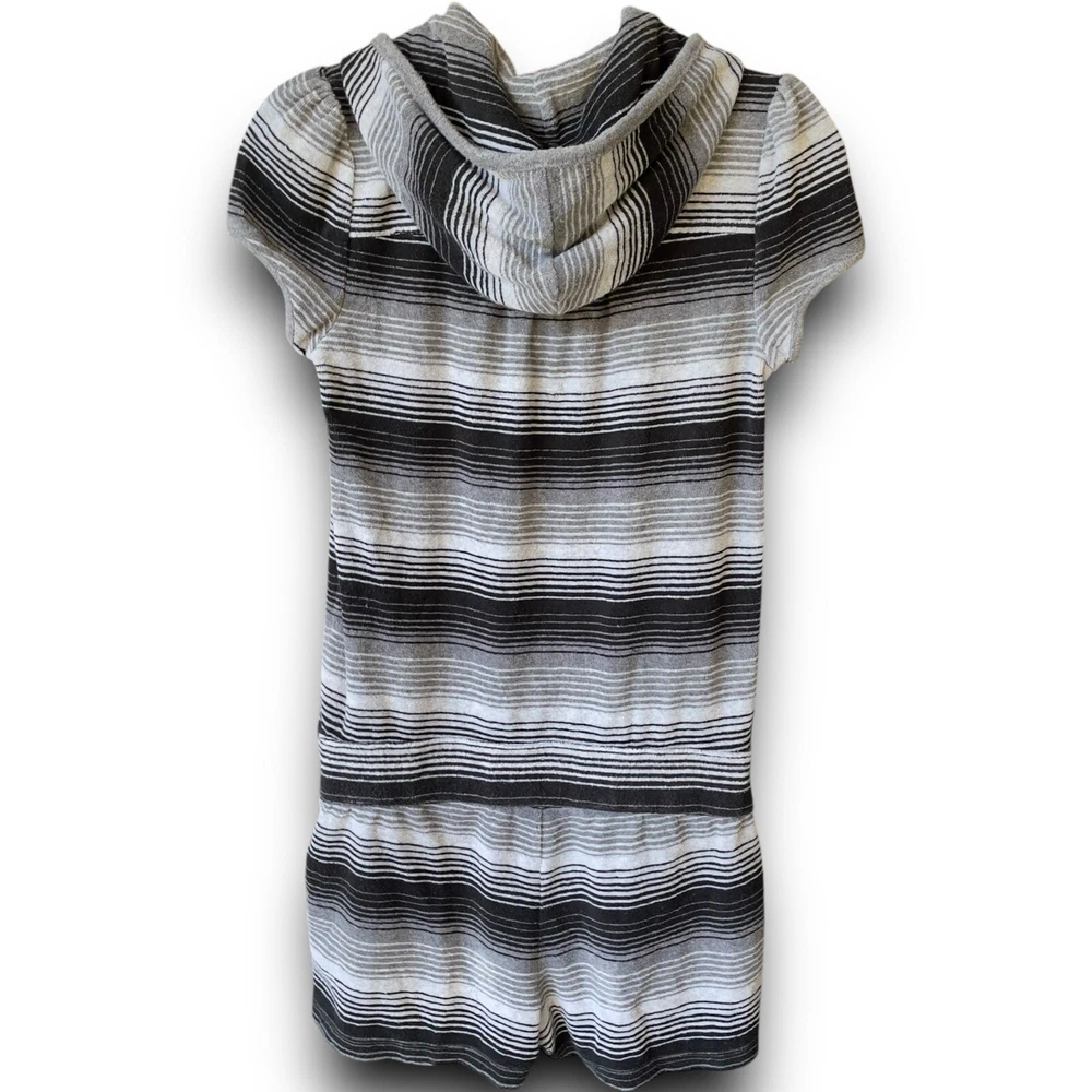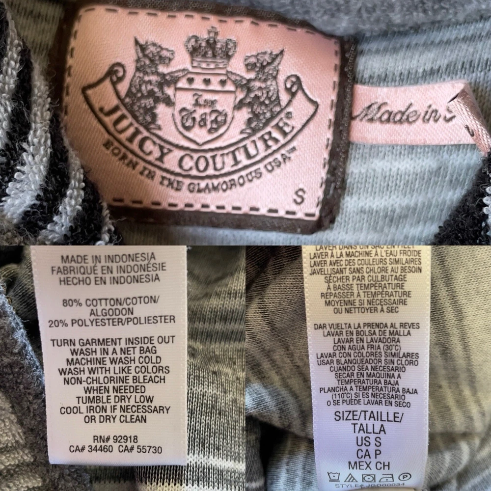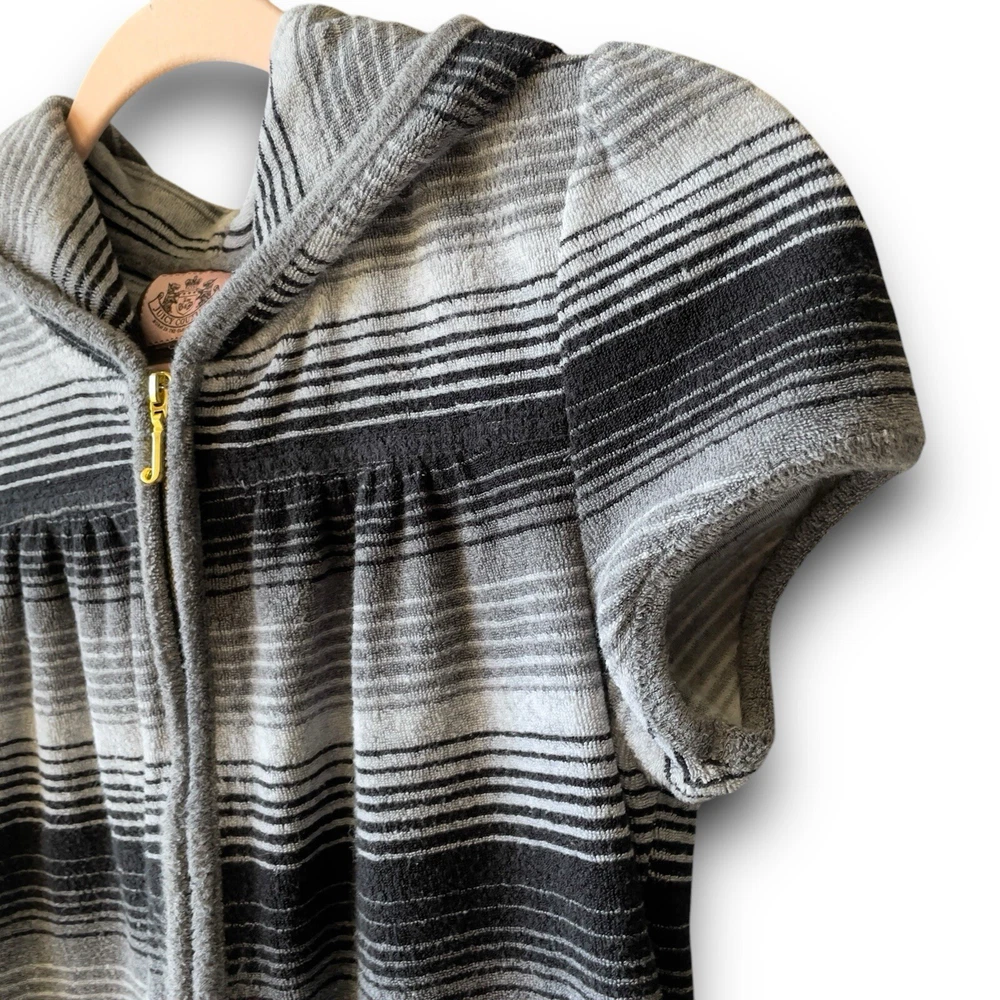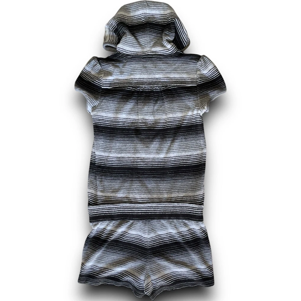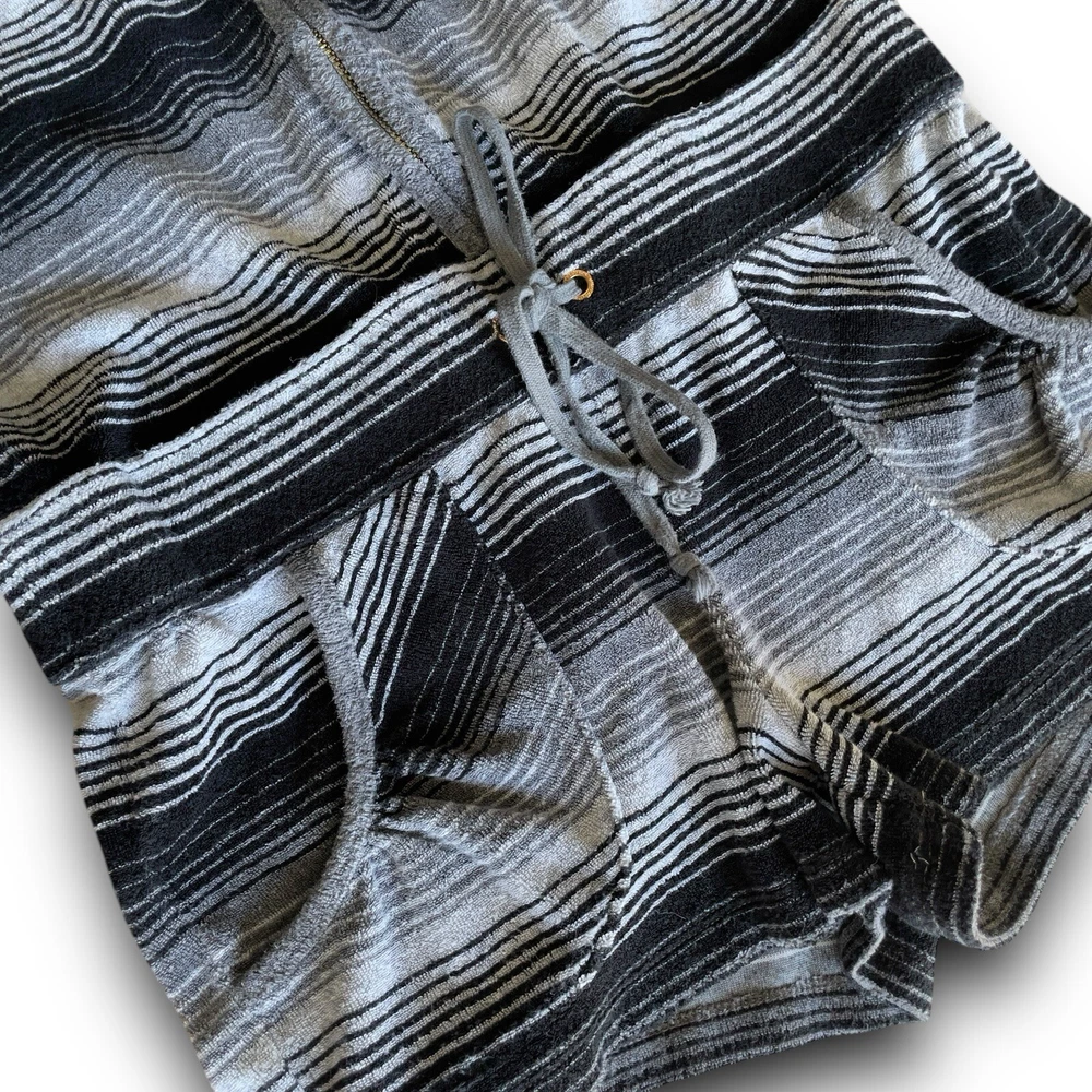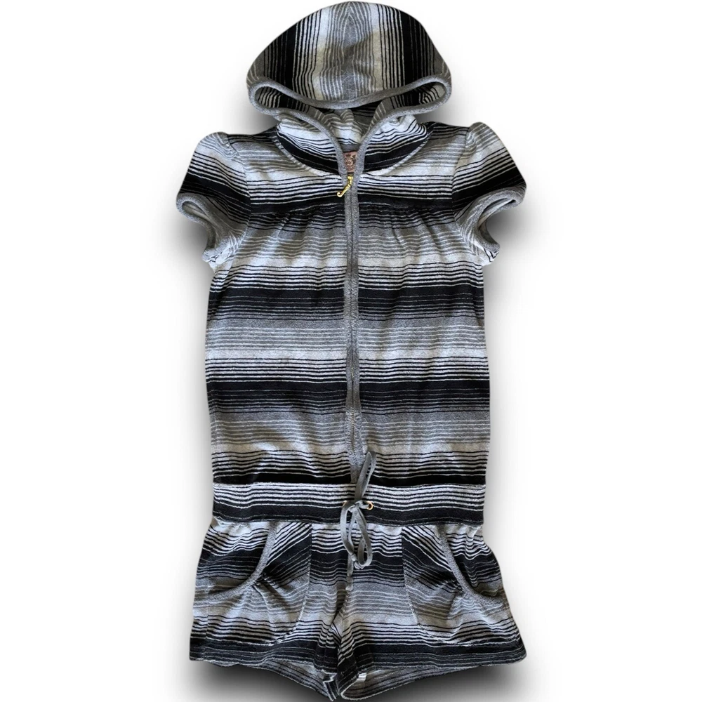 80% cotton 20% poly | made in indonesia Obvi statement piece vintage y2k early 2000s juicy couture short jumpsuit plush French terry cloth one piece romper featuring allover black grey color striped graphic print with stretchy elastic waistband drawstring, two front pockets, adorable puff short sleeves and iconic comfy hoodie with gold hardware zip up front closure with gold ‘J’ pull tag 👑✨this rare hard to find unique collectors gem is in a size small, in excellent pre owned vintage condition. Laid flat measurements: chest 15” length 30.5”
