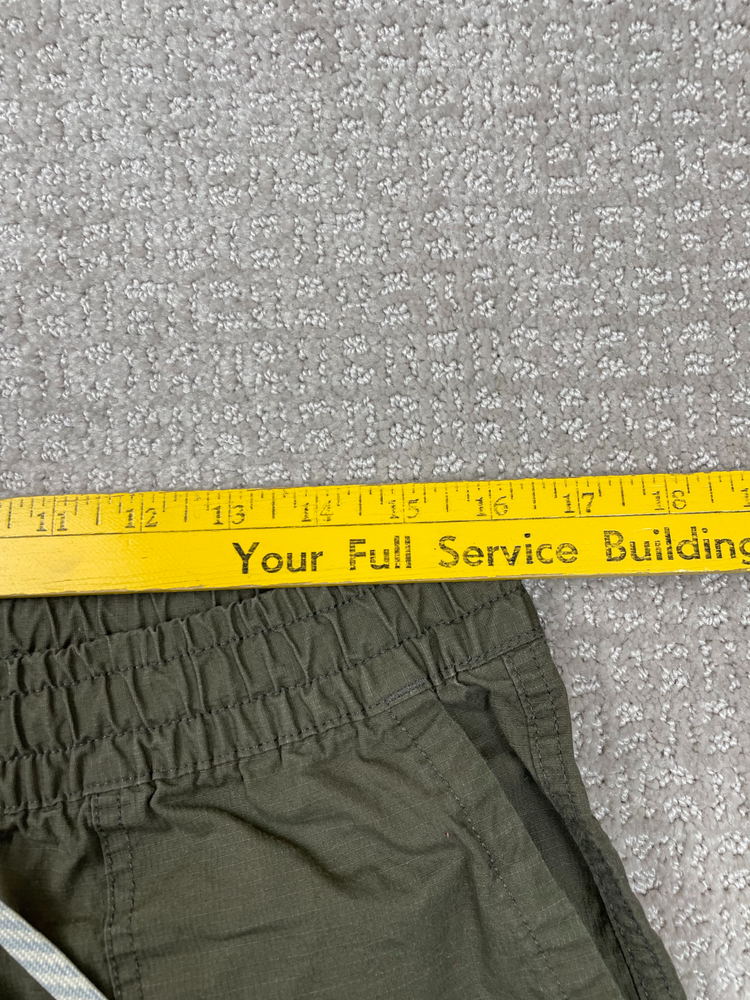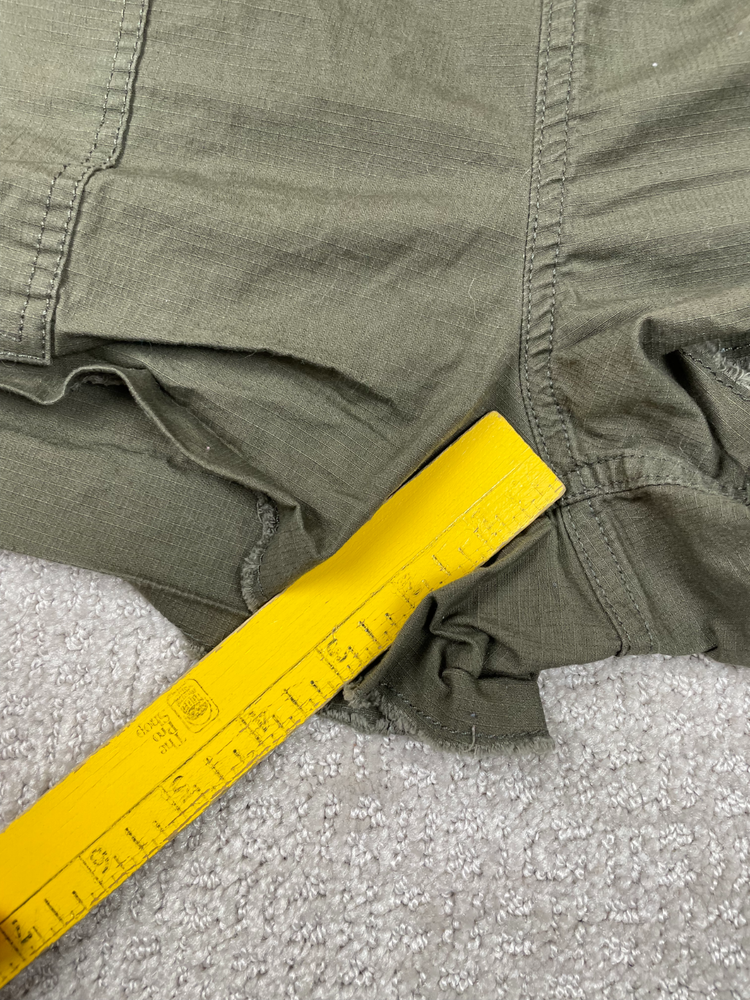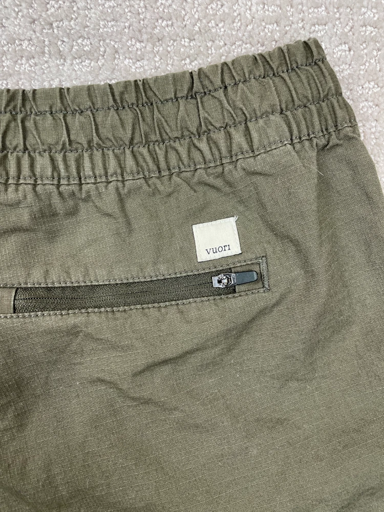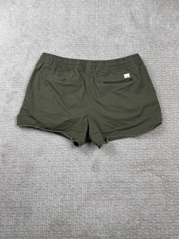 The Vuori Women's Shorts in size M feature a 3" inseam and a durable green ripstop material with a frayed hem. These athletic shorts are designed for active occasions and are machine washable for easy care. With a drawstring closure and pockets, they provide a comfortable fit for women looking to workout or run in style during the summer and spring seasons. Made by the brand Vuori, these shorts offer a regular fit and are perfect for those seeking high-quality activewear.
