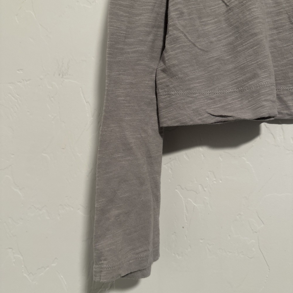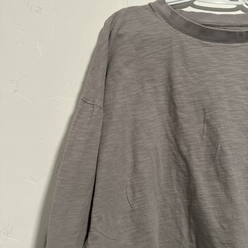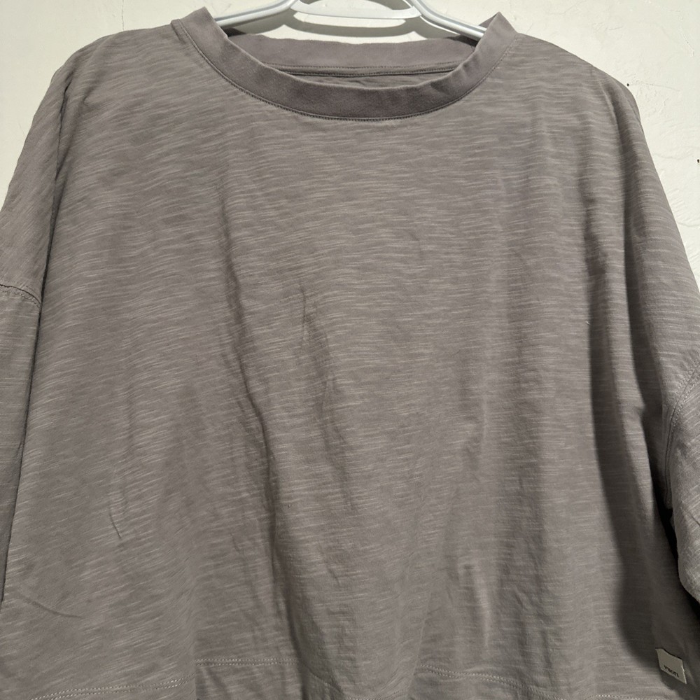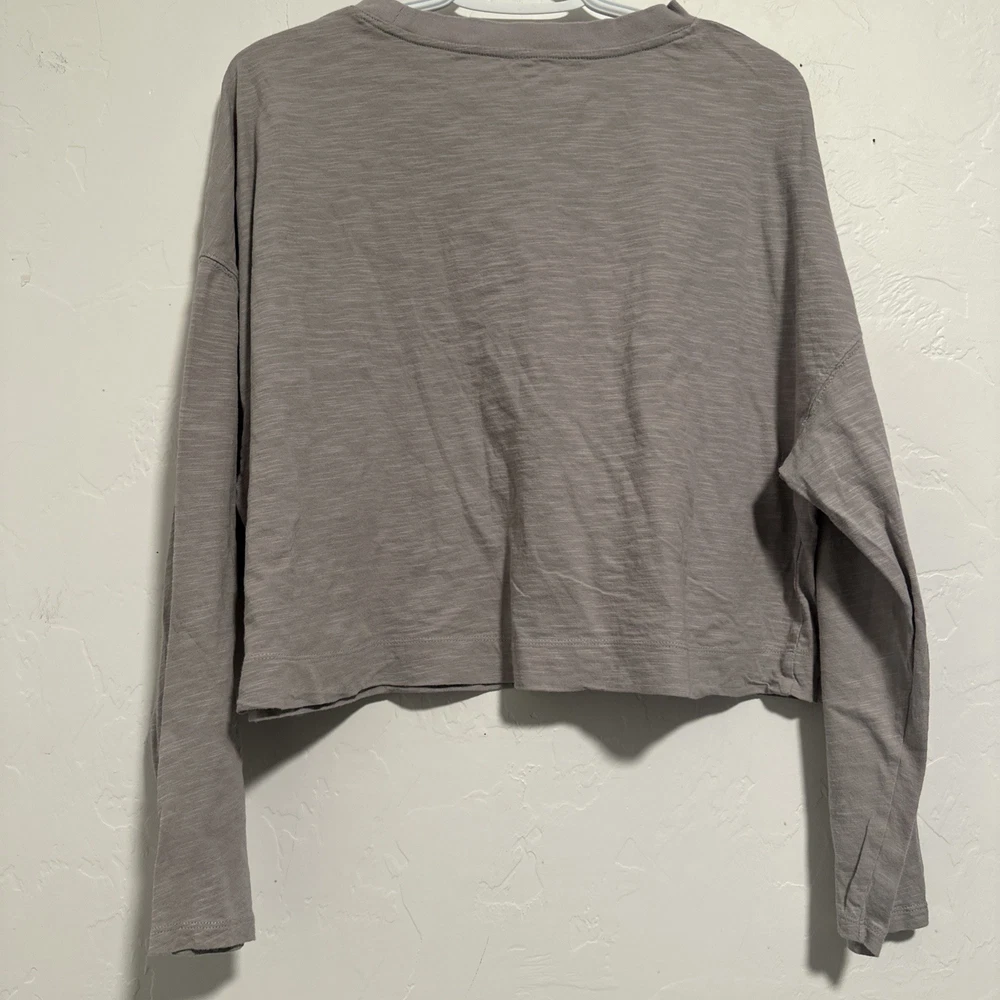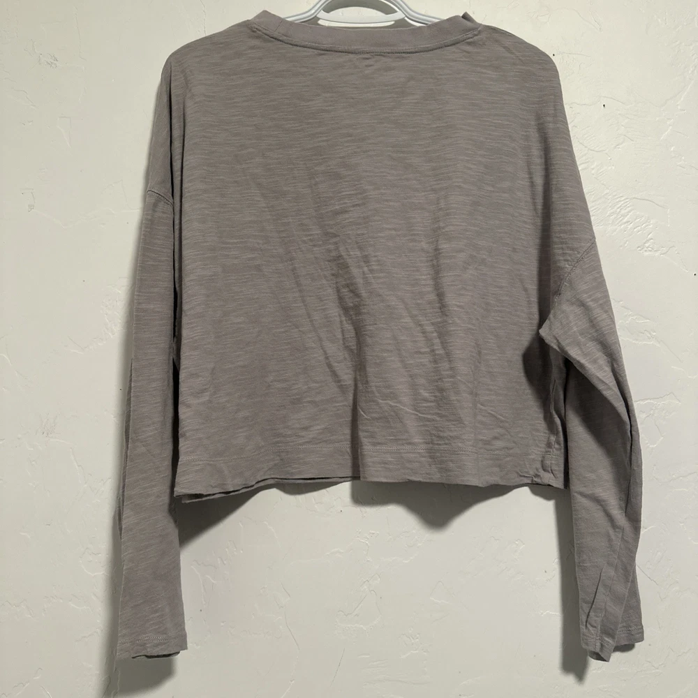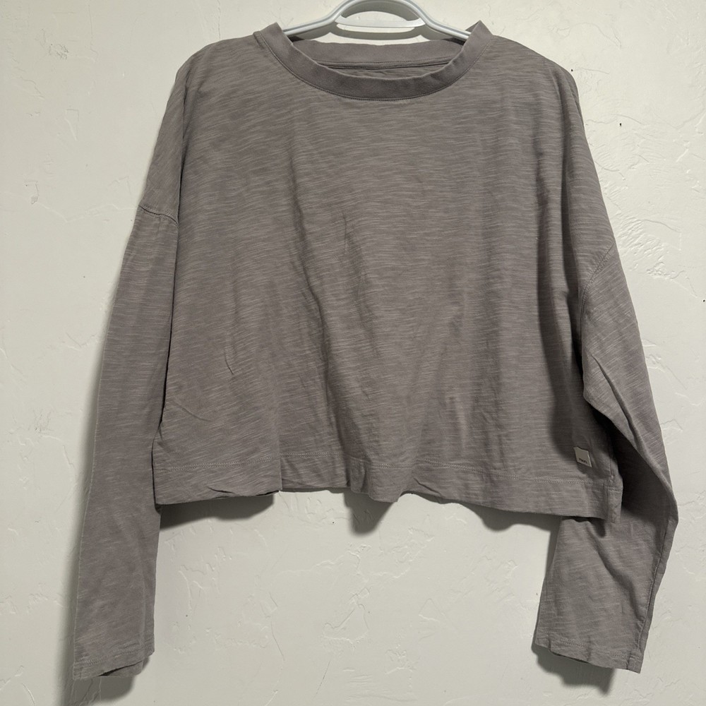 Style: Cropped Occasion: Activewear Color: Gray Fabric Wash: Light Performance/Activity: Gym & Training, Yoga, Running & Jogging Product Line: Super Soft Brand: Vuori Material: Cotton Blend Vintage: No Size: L Closure: Pullover Size Type: Regular Neckline: Crew Neck Fit: Relaxed Features: Stretch, Lightweight, Breathable Sleeve Length: Long Sleeve Department: Women Pattern: Solid Type: Polo