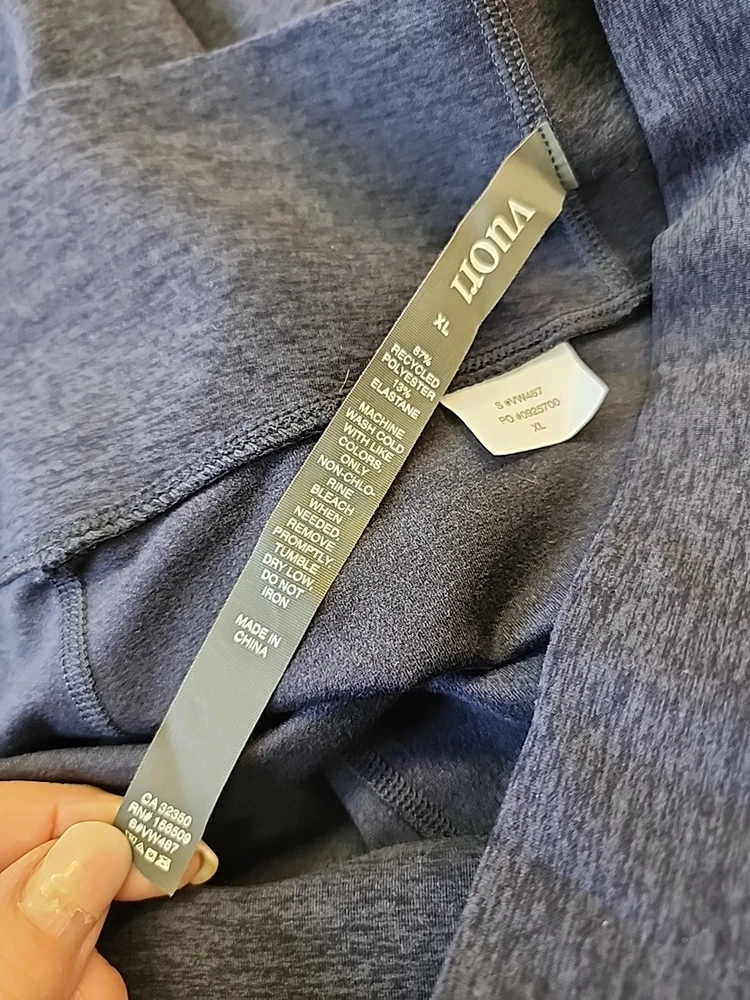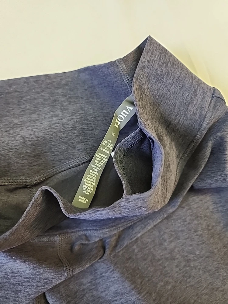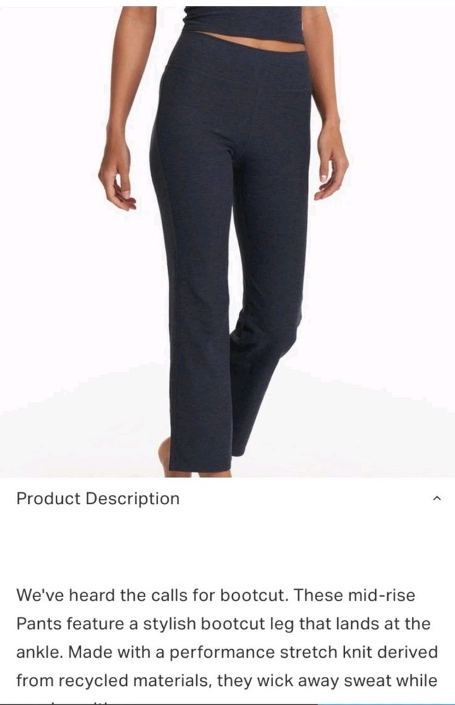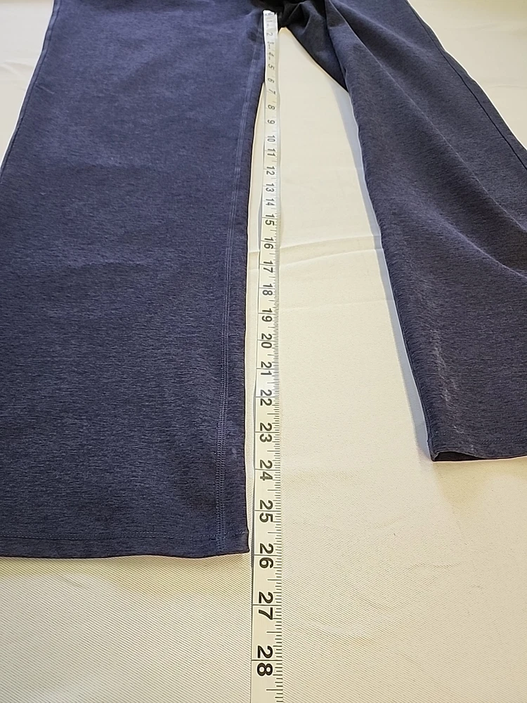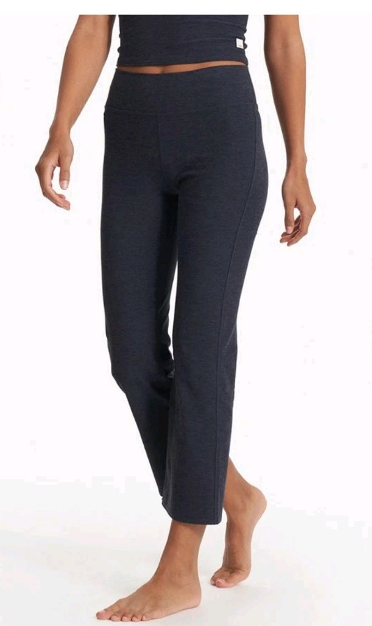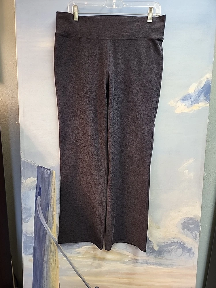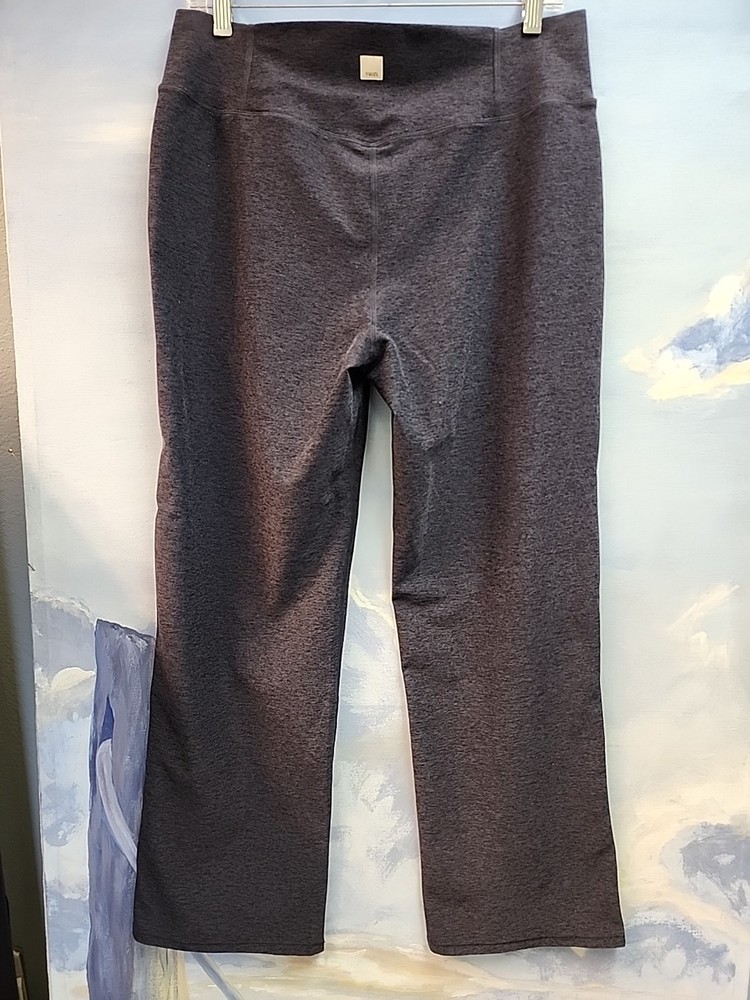 This is a pair of women's Vuori bootcut pants in size XL, featuring a dark heathered gray color and a slim fit. The pants have a pull-on style with a mid-rise waist size of 31 inches and an inseam of 26 inches. Made of polyester and spandex blended fabric, these ankle-length pants offer comfort and stretch with a pocket for convenience. Suitable for activewear purposes such as gym training, walking, and running, these pants are machine washable and designed for all seasons.