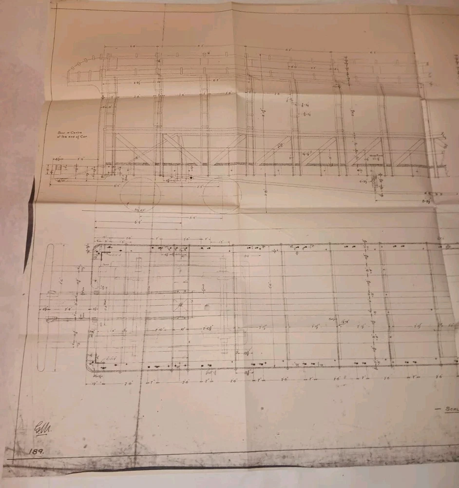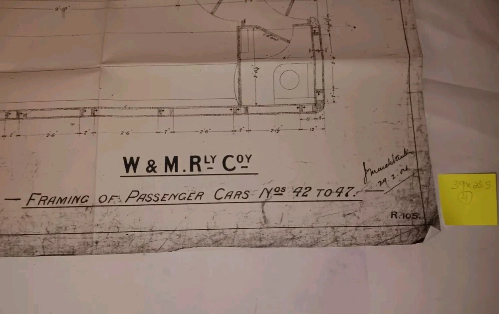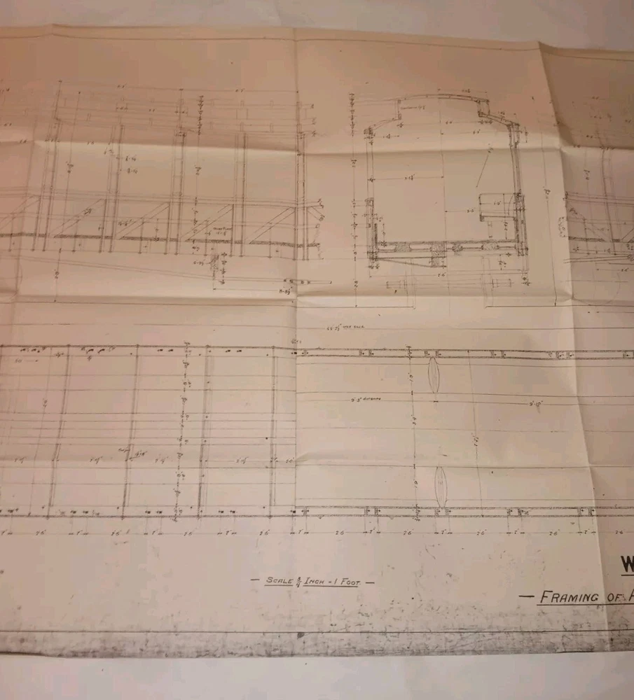 This is an original vintage W &M Railway Passenger Car Framing Train Blueprint that measures 39"x25". It has some folds and minor wrinkles and a few small short tears on edges. There is some minor yellowing near folds I will have several other original vintage Railroad Train Blueprint it's posted.