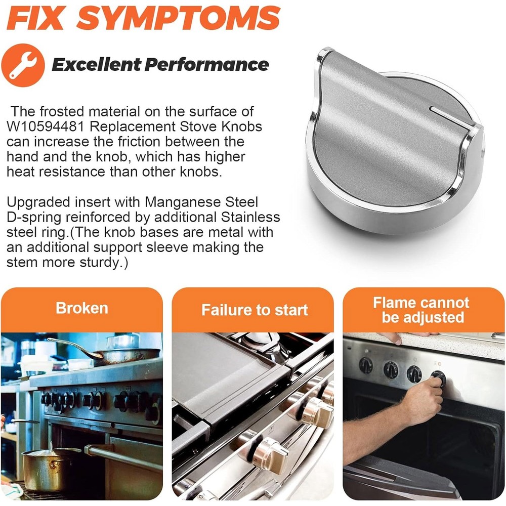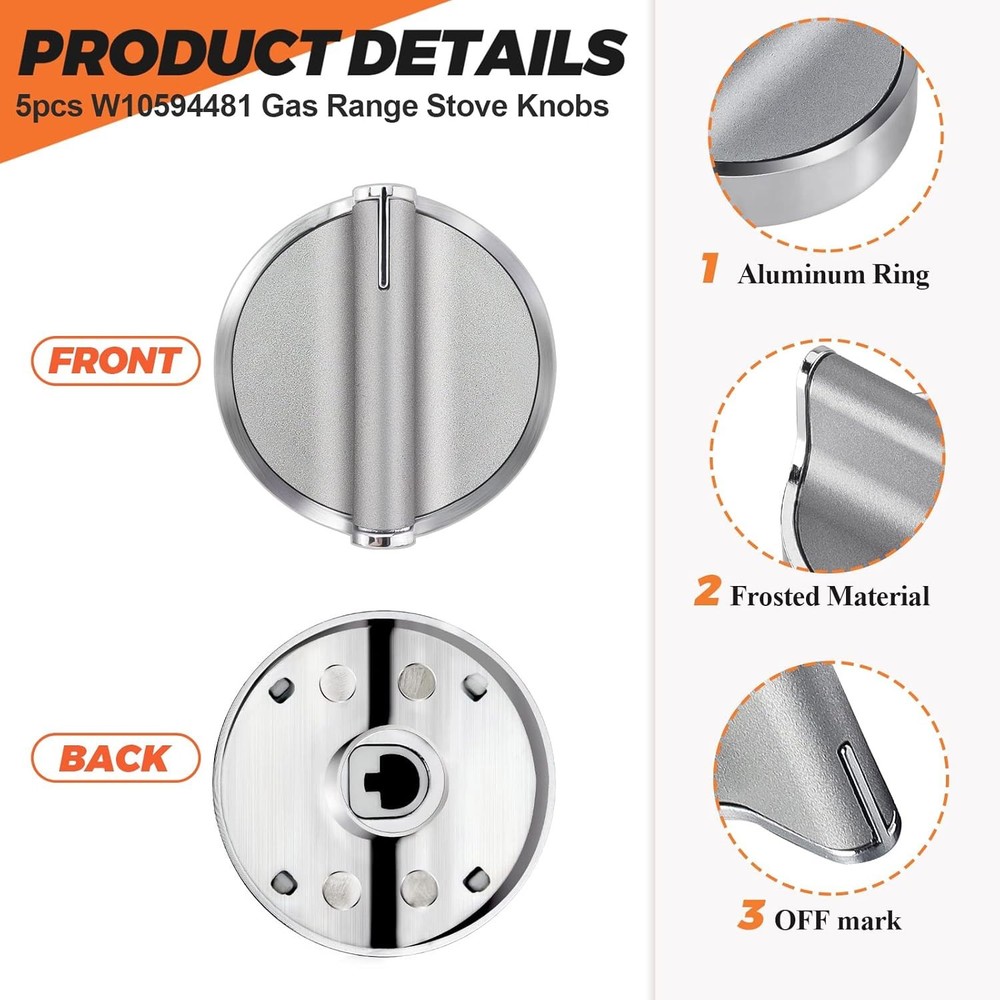 Description: 【UPGRADE DESIGN】 The premium whirlpool gas stove knobs replacement W10594481 designed with stainless steel Stem is reinforced with aluminum ring, The surface of knobs is made of frosted material, which has higher heat resistance than other knobs. 【 PERFECT FIT】 Our W10594481 for whirlpool gas stove knobs replacements with a 0.18in "D" axis, 90 Degrees to The Rotating Surface. Replaces Part: W10594481,3281332 WPW10594481, AP6023301, PS11756643, EAP10594481, B01KR8F5EU, WCG97US0DS00, WCG97US6DS00. ⚠️ Not for WCG97US0DS & models starting with WEG7 (Before use, please confirm the direction of your stove and insert the inner core. ) 【 BUY WITH CONFIDENCE】 We’re confident in the design and quality of whirlpool stove knobs replacements, For any reason you're not completely satisfied, you can ask for a replacement or full refund in 1 Year. If you are not sure whether our range knobs correctly fit your appliance, please feel free to contact us or ask a question through eBay. Package Included: 1/2/4/5 x Range Control Knob W10594481 Part Number W10594481 replaces WPW10594481, AP6023301, PS11756643, B01KR8F5EU. Color: Stainless Steel Model Number Description: Compatible with Whirlpool models starting with WCG97( Not for WCG97US0DS, not suitable for models starting with WEG7. ) - WCG97US0DS00 WCG97US6DS00 WCG51US0DB00 WCG51US0DS00 WCG51US0DW00 WCG55US0HB00 WCG55US0HS00 WCG55US0HW00 WCG75US0DB00 WCG75US0DS00 WCG51US6DB00 WCG51US6DS00 WCG51US6DW00. On Jan 7, 2026 at 00:27:42 PST, seller added the following information: