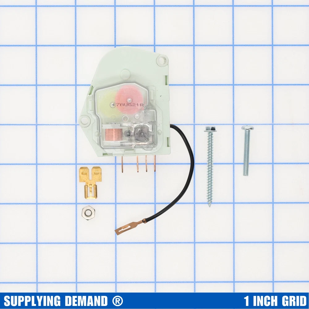 Defrost Timer assembly. Compatible with Whirlpool, Kenmore, and other brands. This is not a Whirlpool OEM product. The Whirlpool brand names and logos are the registered trademarks of their respective owners. Any use of the Whirlpool brand name or model designation for this product is made solely for purposes of demonstrating compatibility. "The trademarks, logos, and service marks (collectively the "Trademarks") displayed herein are registered and unregistered trademarks of , its affiliates, and others. Nothing contained herein should be construed as granting, by implication, estoppel, or otherwise, any license or right to use any trademark displayed herein without the written permission of or such third party that may own the trademark displayed herein. Your misuse of the trademarks displayed herein, or any other content on this website, except as provided herein, is strictly prohibited." Alternate part numbers include AP5985208, 14210016, 2188372, 2188376, 4262692, 4318057, 482489, 548044, 56906, 790077, 850019, 850038, 850343, 850344, 850345, 850609, 850695, 850731, 850845, 850847, 850878, 850879, 851061, 851106, 851200, 851269, 851701, 851971, 943436, 945513, 945514, 978266, 978472, 989280, 989281, CC309, CC904, CC906, D70041-12, FSP482493, GP6, GP9, PS11723171, R0950217, W10740039, W10822278VP, Y0053736, Y0055525, Y0056627, Y0056768, Y0056906, and Y0311209. 120V | 50/60Hz | 8 Hour, 21 Minute | Includes flying lead and mounting screws | Fits model specific side-by-side refrigerators It is important to disconnect your appliance from the power supply before servicing. replacement parts are compatible with Major Brands, but you should always verify fitment with your specific model. We have included a video in the product gallery to help you find your model number and information in the description below. SD products come in packaging.
