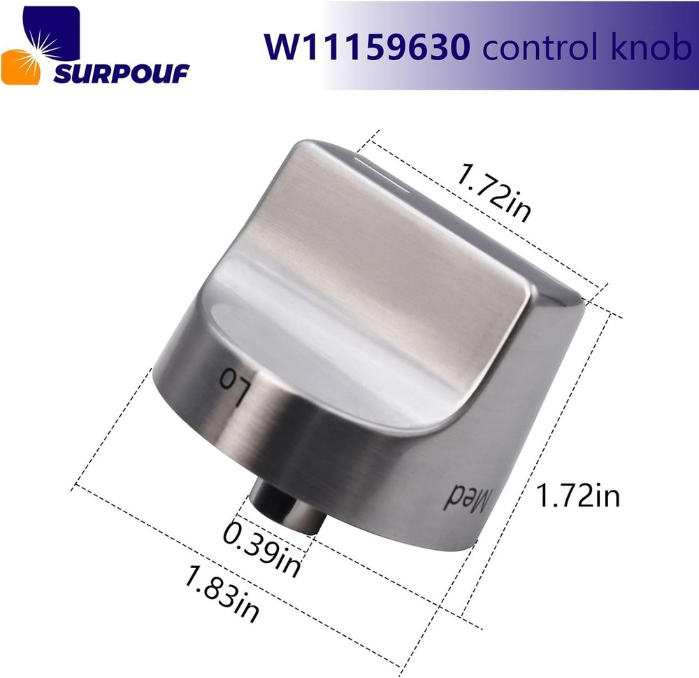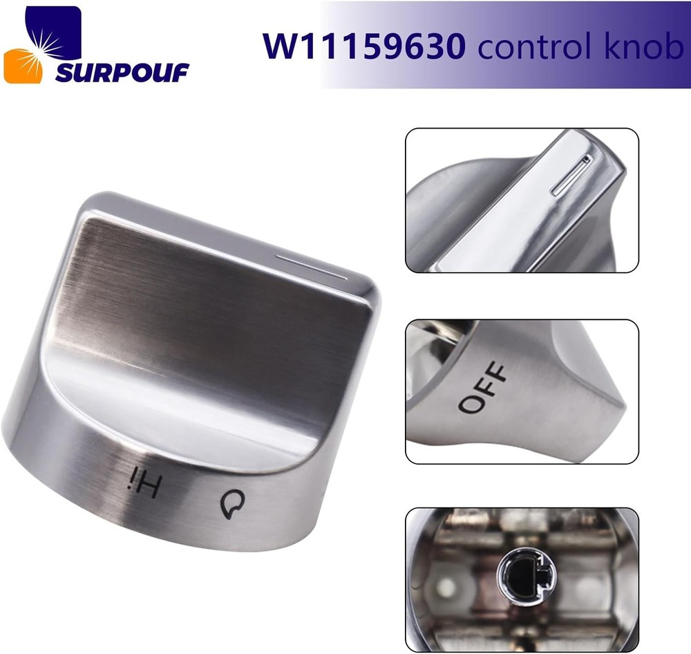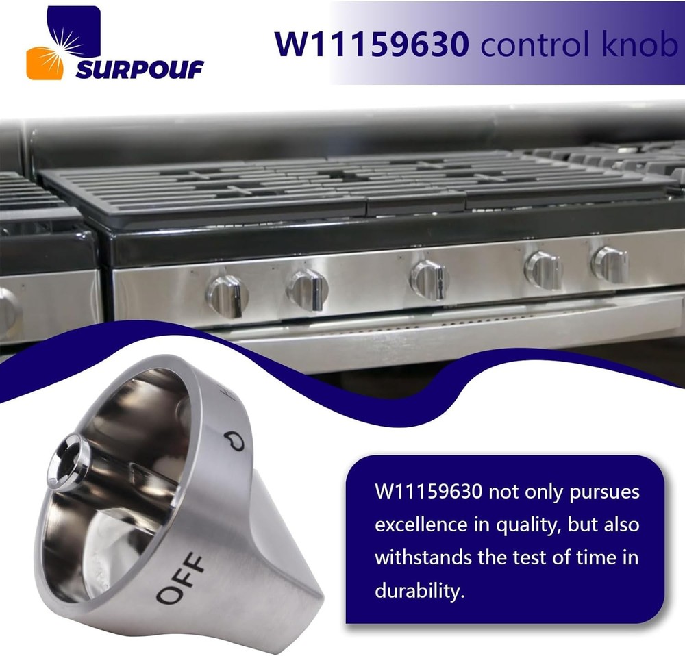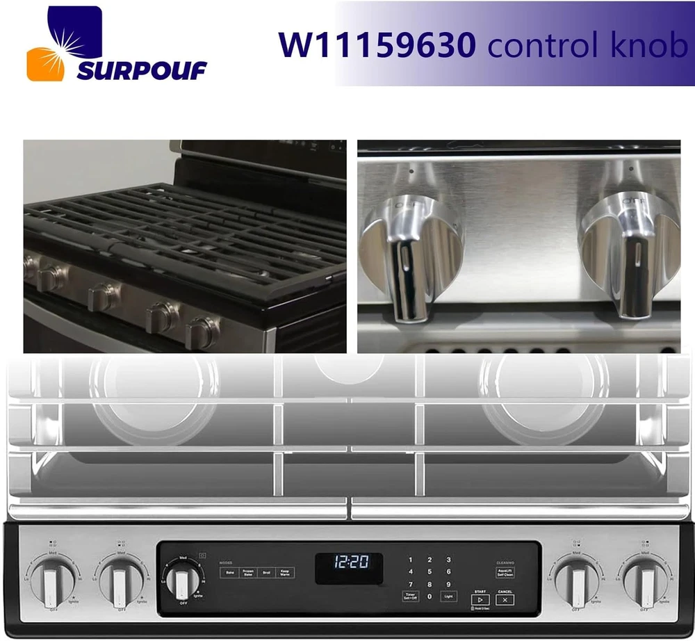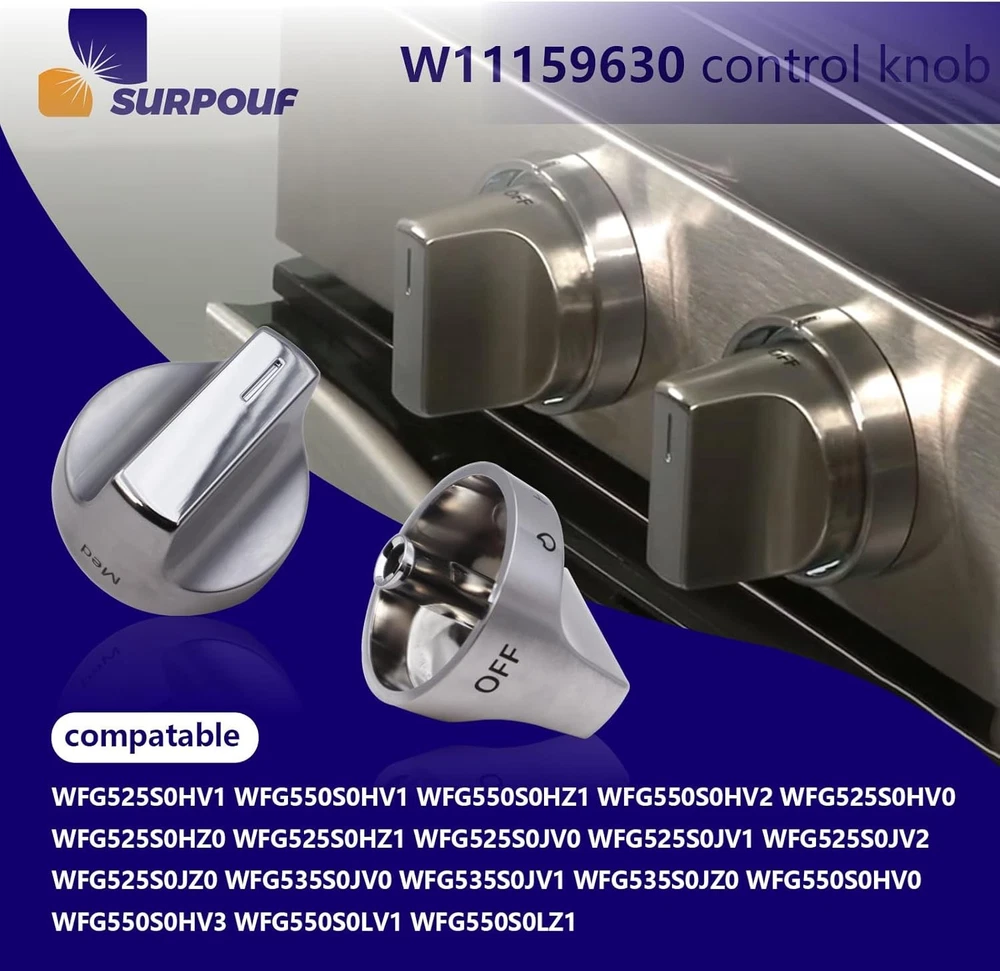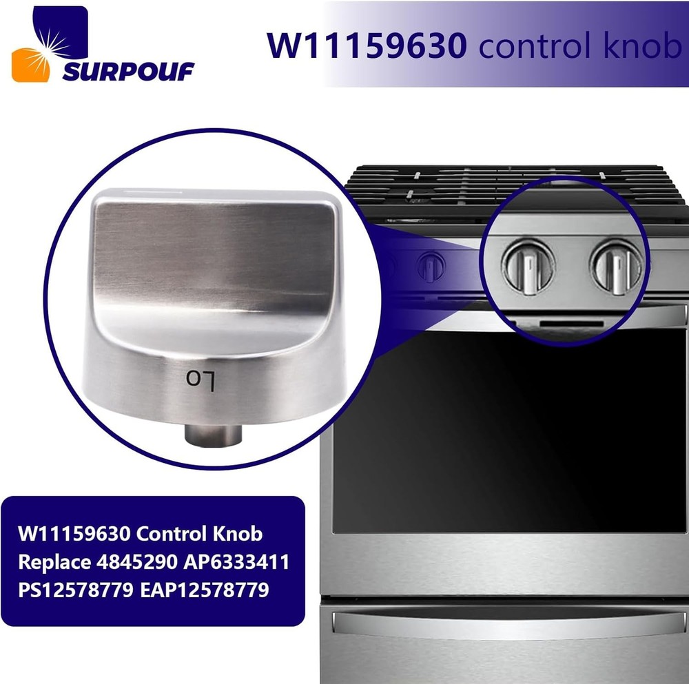 W11159630 W11023139 Surface Burner Knob w10850015 Control Knob This W11159630 knob is made of top-quality materials and is designed to perfectly match and use with your W11159630 gas Range model. Its bright silver finish adds a modern and elegant touch to your kitchen decor, while the brand logo ensures W11159630's quality and durability This W11023139 knob is easy to install and use, allowing you to fully control the gas stove settings, making your cooking experience smoother and more enjoyable Get W11159630 replacement knob now, upgrade your gas stove, and make your gas stove look like new! W11159630 Only compatable with Whirlpool:WFG525S0HV0 WFG525S0HZ0 WFG525S0HD0 WFG525S0HS0 WFG550S0HV0 WFG550S0HZ0 WFG525S0HV1 WFG525S0HS1 WFG550S0HV1 WFG550S0HZ1 WFG525S0HZ1 WFG525S0JS0 WFG525S0JS1 WFG525S0JS2 WFG525S0JV0 WFG525S0JZ0 WFG525S0JZ1 WFG525S0JZ2 WFG535S0JS0 WFG535S0JS1 WFG535S0JV0 WFG535S0JZ0 WFG535S0JZ1 WFG535S0LS1 WFG535S0LZ1 WFG550S0HZ2 WFG550S0HZ3 WFG550S0LZ1