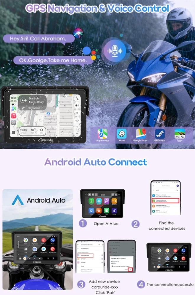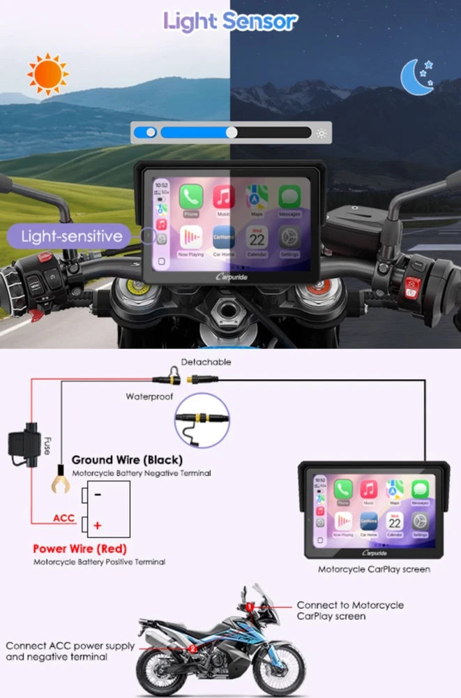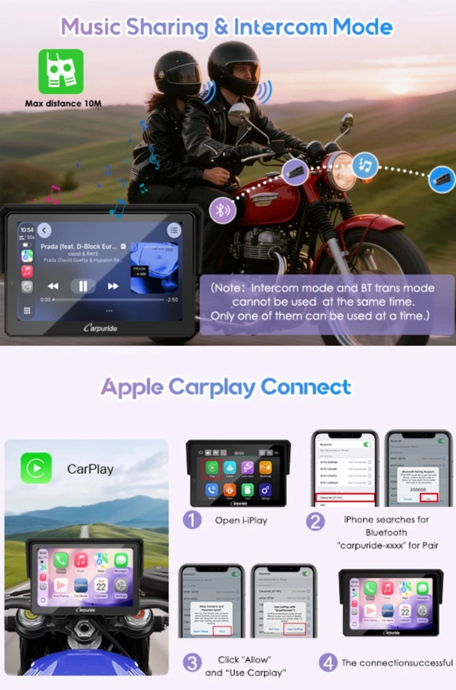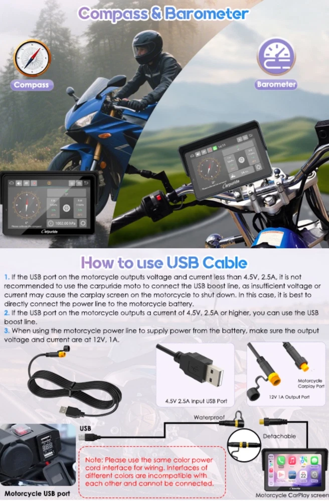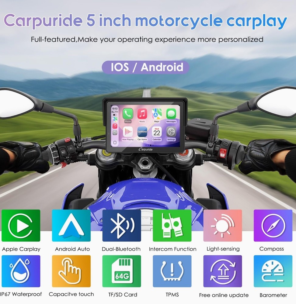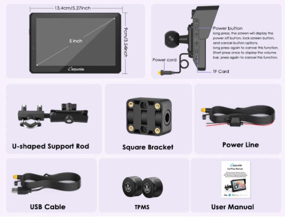 #2988 W502TPRO for Motorcycle CarPlay& Android Auto& TPMS& Dual Bluetooth - 5" Waterproof GPS Navigation Screen for Motorbike, Music Sharing, Intercom, EQ, Light Sensor, Compass, Barometer Brand Carpuride Vehicle Service Type moto Screen Size 5 Inches Special Feature 2 Tire Pressure Sensors, Dual Bluetooth, For Android Auto, For Appel Carplay, Waterproof Connectivity Technology Bluetooth Map Type Worldwide 【Built-in Motorcycle TPMS System】The motorcycle tire pressure monitoring system includes 2 tire sensors that display real-time tire pressure and temperature. This helps maintain safe tire pressures and can alert you if there are any problems. 【Wireless CarPlay & Android Auto for Motorcycles】The Carpuride W502TPro motorcycle CarPlay Screen offers CarPlay and Android Auto functionality. By wirelessly connecting your smartphone to your motorcycle's touchscreen via Bluetooth, you can easily access map navigation, phone calls, music playback, text messaging, and more with the assistance of Siri or Google Assistant. With hands-free control, you can stay focused on the road and ride safely. 【Dual Bluetooth - Audio & Transmission】The Carpuride W502T Pro motorcycle GPS CarPlay features built-in dual Bluetooth connectivity, allowing you to pair the CarPlay touchscreen with your smartphone and Bluetooth-enabled headset or helmet. You can make hands-free calls or enjoy your favorite music without removing your helmet. The convenience of dual Bluetooth seamless connection keeps your phone safely in your pocket while you enjoy a free and easy riding experience. 【Music Sharing & Intercom】The W502T Pro's upgraded dual Bluetooth technology allows two Bluetooth helmets to connect simultaneously to the CarPlay screen via its BT Trans function. This enables the rider and passenger on the same motorcycle to easily share music and use the intercom function without interrupting the ride. Whether enjoying music on a long journey or communicating instantly in complex road conditions, It adds endless fun and convenience to your ride 【Sensor Light & EQ Effect】The Carpuride sensor light is designed to protect your eyes while driving by automatically adjusting screen brightness based on surrounding light conditions. This ensures clear visibility of navigation and key information, enhancing comfort and reducing eye strain for safer long drives. The 502TPRO also includes a built-in EQ function, offering a variety of music styles and sound effects. 【Compass & Barometer】When riding outdoors, getting lost or not knowing the altitude is a common challenge. The W502T Pro Motorcycle CarPlay's compass that helps you stay on course and avoid losing your way. The barometer monitors altitude changes in real-time, especially useful when riding in mountainous areas, helping you better understand the environmental conditions. These features enhance your safety, making every adventure more secure and smooth. 【Single & Dual Connection Modes】In BT Trans mode, the W502T Pro CarPlay supports both single and dual connections, allowing you to pair Bluetooth headsets or helmets with ease, whether for solo use or sharing with a passenger. In CarPlay or Android Auto mode, only single connection is supported, enabling audio transmission from your smartphone to a helmet or headset for hands-free communication and music playback. 【Two Power Connection Options】Using the motorcycle power line to provide 12V and 1A to the battery. The motorcycle's USB port provides a current of 5V and 2.5A or higher, use the USB boost cable to directly connect the W502Tpro device to the motorcycle's USB port. The W502Tpro has built-in reverse protection for convenience. Even if the cable is connected incorrectly, the device will not be damaged. 【Two Power Connection Options】Using the motorcycle power line to provide 12V and 1A to the battery. The motorcycle's USB port provides a current of 5V and 2.5A or higher, use the USB boost cable to directly connect the W502Tpro device to the motorcycle's USB port. The W502Tpro has built-in reverse protection for convenience. Even if the cable is connected incorrectly, the device will not be damaged. 【Notice】When using the motorcycle power line to supply power to the battery, ensure that the output voltage and current are 12V, 1A. If the USB port on the motorcycle outputs voltage and current less than 5V, 2A, it is not recommended to use the Carpuride moto to connect the USB boost line, as insufficient voltage or current may cause the motorcycle carplay screen to automatically shut down. What's in the box car stereo