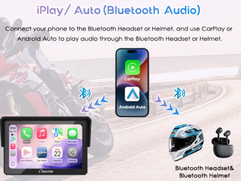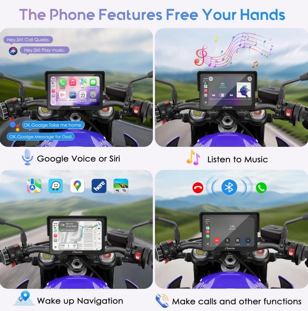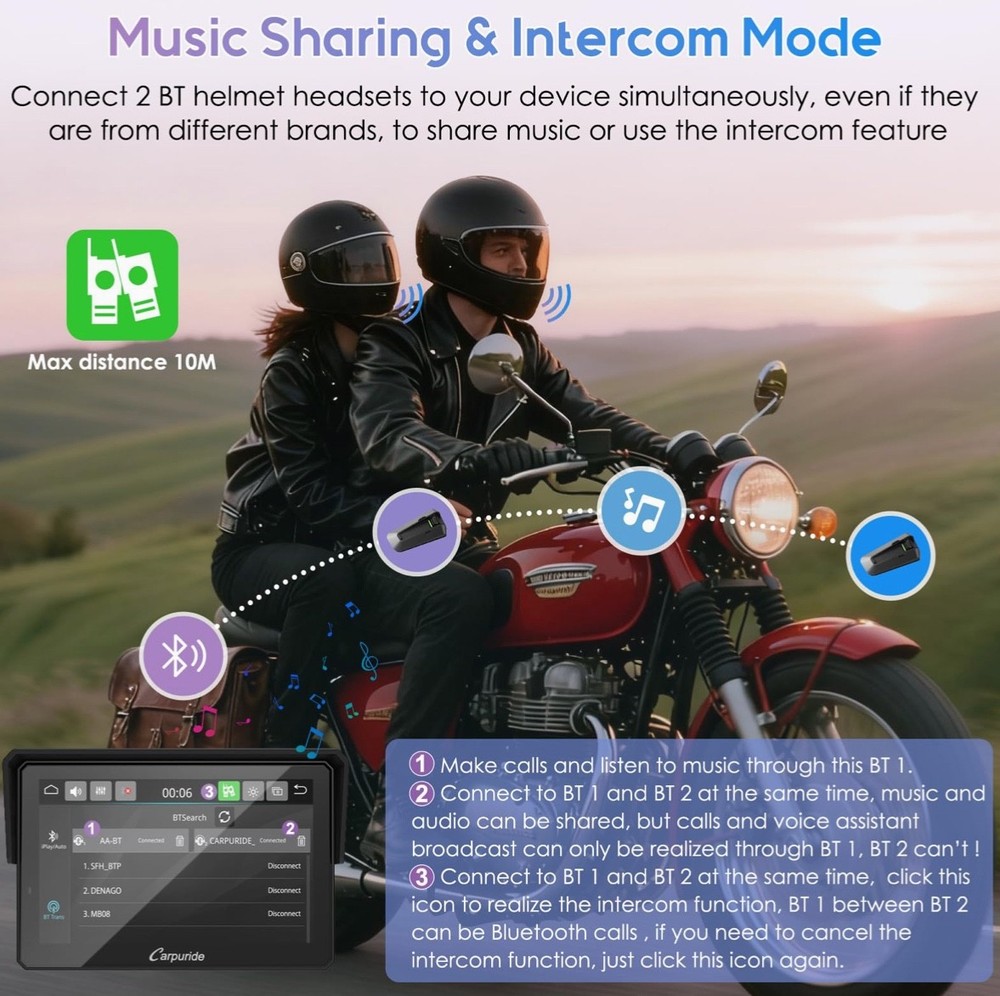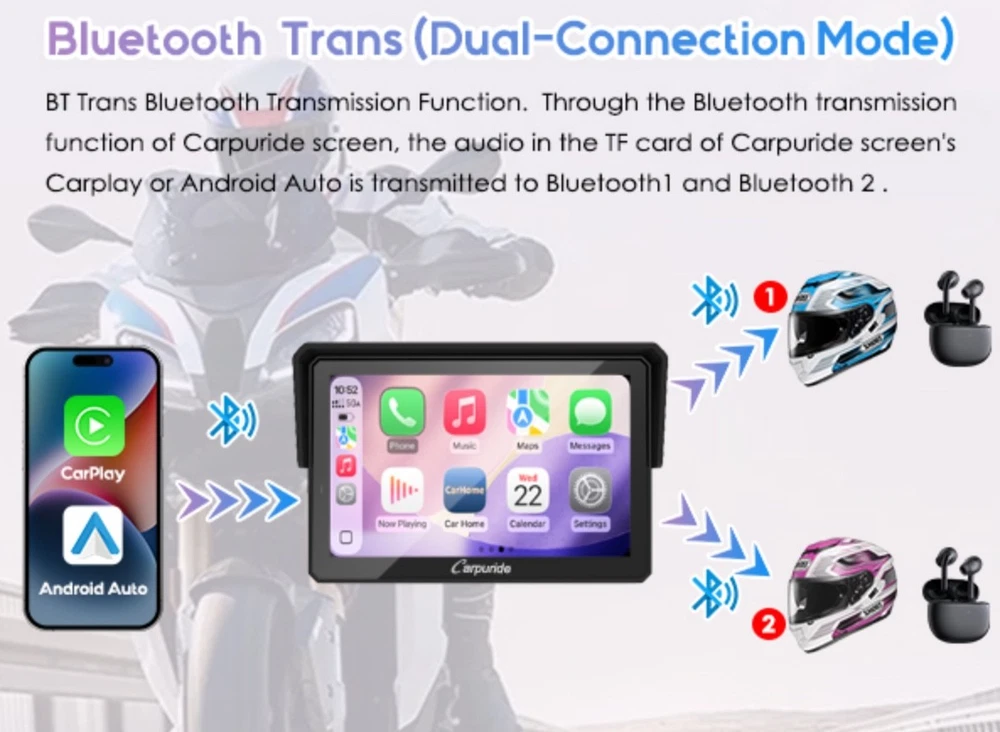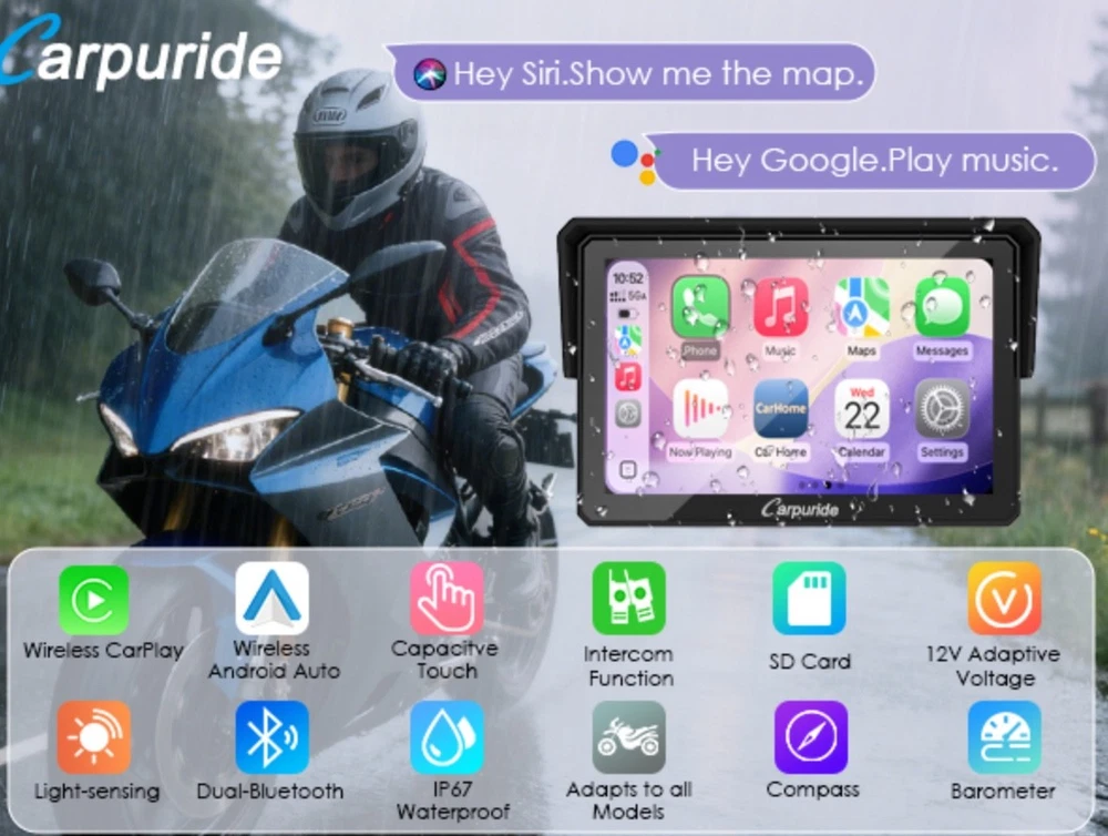 #2988 W502TPRO for Motorcycle CarPlay& Android Auto& TPMS& Dual Bluetooth - 5" Waterproof GPS Navigation Screen for Motorbike, Music Sharing, Intercom, EQ, Light Sensor, Compass, Barometer Brand Carpuride Vehicle Service Type moto Screen Size 5 Inches Special Feature 2 Tire Pressure Sensors, Dual Bluetooth, For Android Auto, For Appel Carplay, Waterproof Connectivity Technology Bluetooth Map Type Worldwide 【Built-in Motorcycle TPMS System】The motorcycle tire pressure monitoring system includes 2 tire sensors that display real-time tire pressure and temperature. This helps maintain safe tire pressures and can alert you if there are any problems. 【Wireless CarPlay & Android Auto for Motorcycles】The Carpuride W502TPro motorcycle CarPlay Screen offers CarPlay and Android Auto functionality. By wirelessly connecting your smartphone to your motorcycle's touchscreen via Bluetooth, you can easily access map navigation, phone calls, music playback, text messaging, and more with the assistance of Siri or Google Assistant. With hands-free control, you can stay focused on the road and ride safely. 【Dual Bluetooth - Audio & Transmission】The Carpuride W502T Pro motorcycle GPS CarPlay features built-in dual Bluetooth connectivity, allowing you to pair the CarPlay touchscreen with your smartphone and Bluetooth-enabled headset or helmet. You can make hands-free calls or enjoy your favorite music without removing your helmet. The convenience of dual Bluetooth seamless connection keeps your phone safely in your pocket while you enjoy a free and easy riding experience. 【Music Sharing & Intercom】The W502T Pro's upgraded dual Bluetooth technology allows two Bluetooth helmets to connect simultaneously to the CarPlay screen via its BT Trans function. This enables the rider and passenger on the same motorcycle to easily share music and use the intercom function without interrupting the ride. Whether enjoying music on a long journey or communicating instantly in complex road conditions, It adds endless fun and convenience to your ride 【Sensor Light & EQ Effect】The Carpuride sensor light is designed to protect your eyes while driving by automatically adjusting screen brightness based on surrounding light conditions. This ensures clear visibility of navigation and key information, enhancing comfort and reducing eye strain for safer long drives. The 502TPRO also includes a built-in EQ function, offering a variety of music styles and sound effects. 【Compass & Barometer】When riding outdoors, getting lost or not knowing the altitude is a common challenge. The W502T Pro Motorcycle CarPlay's compass that helps you stay on course and avoid losing your way. The barometer monitors altitude changes in real-time, especially useful when riding in mountainous areas, helping you better understand the environmental conditions. These features enhance your safety, making every adventure more secure and smooth. 【Single & Dual Connection Modes】In BT Trans mode, the W502T Pro CarPlay supports both single and dual connections, allowing you to pair Bluetooth headsets or helmets with ease, whether for solo use or sharing with a passenger. In CarPlay or Android Auto mode, only single connection is supported, enabling audio transmission from your smartphone to a helmet or headset for hands-free communication and music playback. 【Two Power Connection Options】Using the motorcycle power line to provide 12V and 1A to the battery. The motorcycle's USB port provides a current of 5V and 2.5A or higher, use the USB boost cable to directly connect the W502Tpro device to the motorcycle's USB port. The W502Tpro has built-in reverse protection for convenience. Even if the cable is connected incorrectly, the device will not be damaged. 【Two Power Connection Options】Using the motorcycle power line to provide 12V and 1A to the battery. The motorcycle's USB port provides a current of 5V and 2.5A or higher, use the USB boost cable to directly connect the W502Tpro device to the motorcycle's USB port. The W502Tpro has built-in reverse protection for convenience. Even if the cable is connected incorrectly, the device will not be damaged. 【Notice】When using the motorcycle power line to supply power to the battery, ensure that the output voltage and current are 12V, 1A. If the USB port on the motorcycle outputs voltage and current less than 5V, 2A, it is not recommended to use the Carpuride moto to connect the USB boost line, as insufficient voltage or current may cause the motorcycle carplay screen to automatically shut down. What's in the box car stereo