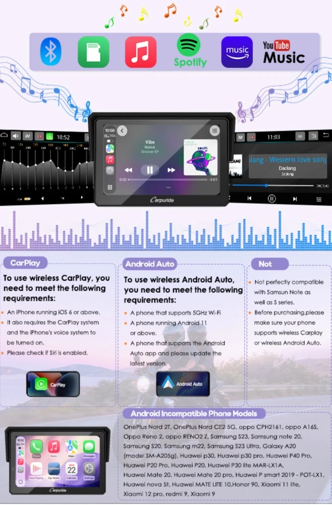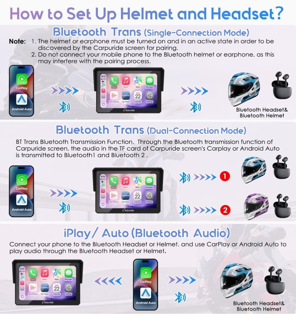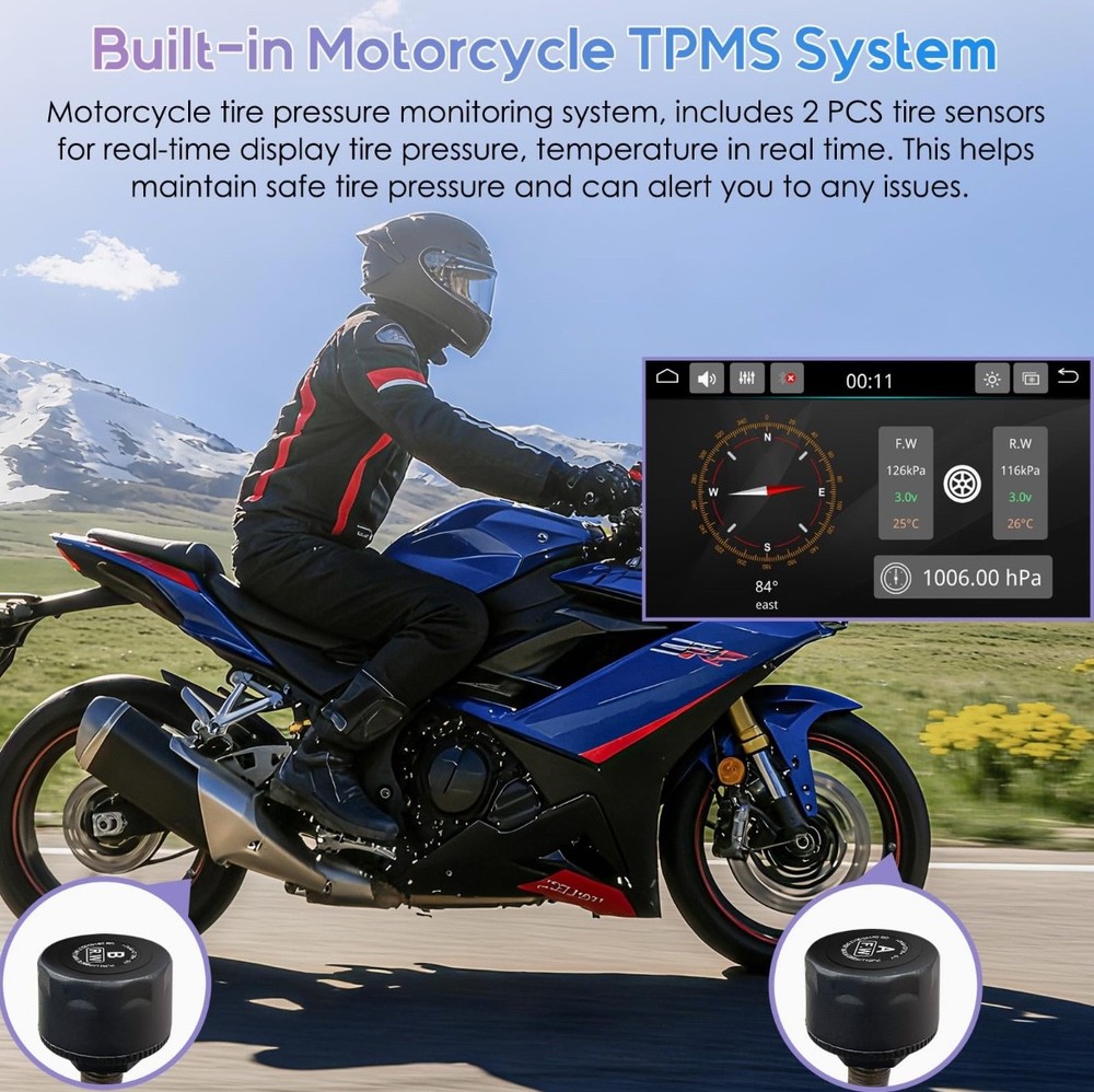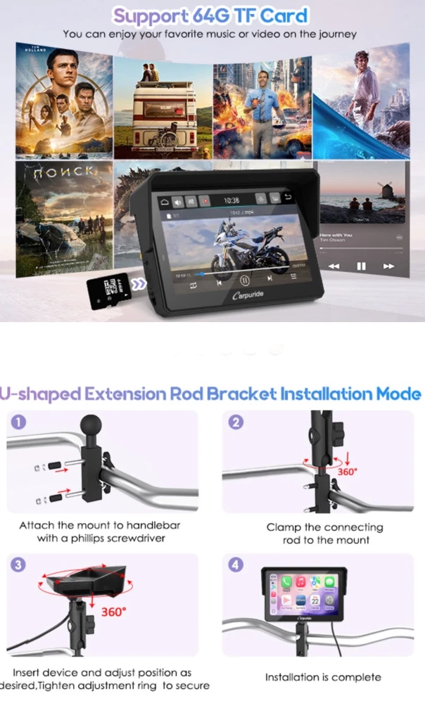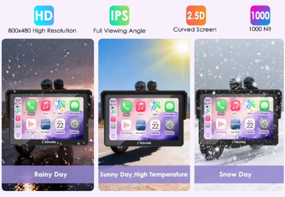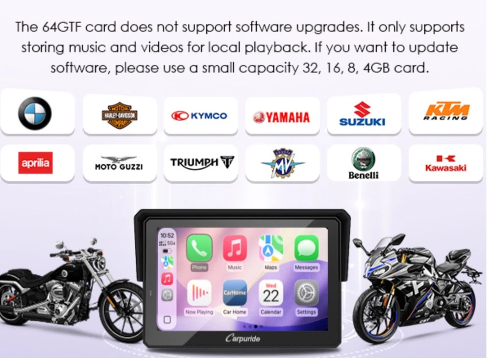 #2988 W502TPRO for Motorcycle CarPlay& Android Auto& TPMS& Dual Bluetooth - 5" Waterproof GPS Navigation Screen for Motorbike, Music Sharing, Intercom, EQ, Light Sensor, Compass, Barometer Brand Carpuride Vehicle Service Type moto Screen Size 5 Inches Special Feature 2 Tire Pressure Sensors, Dual Bluetooth, For Android Auto, For Appel Carplay, Waterproof Connectivity Technology Bluetooth Map Type Worldwide 【Built-in Motorcycle TPMS System】The motorcycle tire pressure monitoring system includes 2 tire sensors that display real-time tire pressure and temperature. This helps maintain safe tire pressures and can alert you if there are any problems. 【Wireless CarPlay & Android Auto for Motorcycles】The Carpuride W502TPro motorcycle CarPlay Screen offers CarPlay and Android Auto functionality. By wirelessly connecting your smartphone to your motorcycle's touchscreen via Bluetooth, you can easily access map navigation, phone calls, music playback, text messaging, and more with the assistance of Siri or Google Assistant. With hands-free control, you can stay focused on the road and ride safely. 【Dual Bluetooth - Audio & Transmission】The Carpuride W502T Pro motorcycle GPS CarPlay features built-in dual Bluetooth connectivity, allowing you to pair the CarPlay touchscreen with your smartphone and Bluetooth-enabled headset or helmet. You can make hands-free calls or enjoy your favorite music without removing your helmet. The convenience of dual Bluetooth seamless connection keeps your phone safely in your pocket while you enjoy a free and easy riding experience. 【Music Sharing & Intercom】The W502T Pro's upgraded dual Bluetooth technology allows two Bluetooth helmets to connect simultaneously to the CarPlay screen via its BT Trans function. This enables the rider and passenger on the same motorcycle to easily share music and use the intercom function without interrupting the ride. Whether enjoying music on a long journey or communicating instantly in complex road conditions, It adds endless fun and convenience to your ride 【Sensor Light & EQ Effect】The Carpuride sensor light is designed to protect your eyes while driving by automatically adjusting screen brightness based on surrounding light conditions. This ensures clear visibility of navigation and key information, enhancing comfort and reducing eye strain for safer long drives. The 502TPRO also includes a built-in EQ function, offering a variety of music styles and sound effects. 【Compass & Barometer】When riding outdoors, getting lost or not knowing the altitude is a common challenge. The W502T Pro Motorcycle CarPlay's compass that helps you stay on course and avoid losing your way. The barometer monitors altitude changes in real-time, especially useful when riding in mountainous areas, helping you better understand the environmental conditions. These features enhance your safety, making every adventure more secure and smooth. 【Single & Dual Connection Modes】In BT Trans mode, the W502T Pro CarPlay supports both single and dual connections, allowing you to pair Bluetooth headsets or helmets with ease, whether for solo use or sharing with a passenger. In CarPlay or Android Auto mode, only single connection is supported, enabling audio transmission from your smartphone to a helmet or headset for hands-free communication and music playback. 【Two Power Connection Options】Using the motorcycle power line to provide 12V and 1A to the battery. The motorcycle's USB port provides a current of 5V and 2.5A or higher, use the USB boost cable to directly connect the W502Tpro device to the motorcycle's USB port. The W502Tpro has built-in reverse protection for convenience. Even if the cable is connected incorrectly, the device will not be damaged. 【Two Power Connection Options】Using the motorcycle power line to provide 12V and 1A to the battery. The motorcycle's USB port provides a current of 5V and 2.5A or higher, use the USB boost cable to directly connect the W502Tpro device to the motorcycle's USB port. The W502Tpro has built-in reverse protection for convenience. Even if the cable is connected incorrectly, the device will not be damaged. 【Notice】When using the motorcycle power line to supply power to the battery, ensure that the output voltage and current are 12V, 1A. If the USB port on the motorcycle outputs voltage and current less than 5V, 2A, it is not recommended to use the Carpuride moto to connect the USB boost line, as insufficient voltage or current may cause the motorcycle carplay screen to automatically shut down. What's in the box car stereo