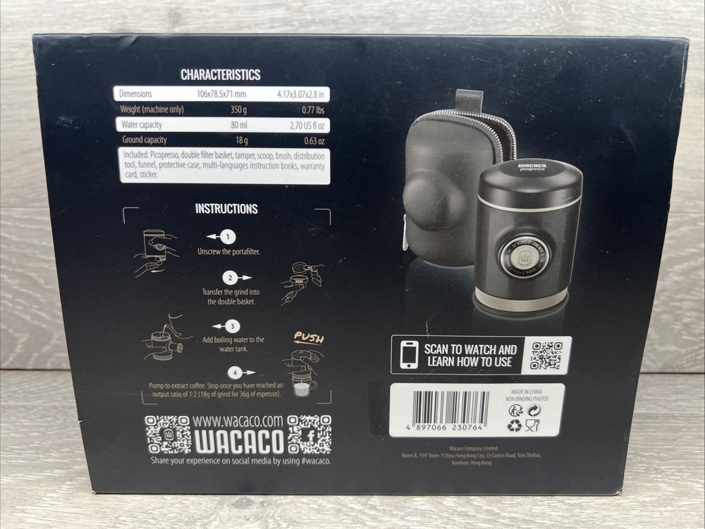 The WACACO Picopresso Portable Espresso Maker is a compact and portable espresso machine that allows you to make delicious espresso on-the-go. With a water tank capacity of 0.084 Qt and a grind coffee feature using a burr grinder, you can enjoy high-quality espresso made with ground coffee. This manual espresso maker, powered by a 18 bar pressure system, comes in a sleek black color and includes an analog control panel for easy operation. Perfect for coffee lovers looking for a convenient and easy way to enjoy their favorite espresso drinks wherever they are.