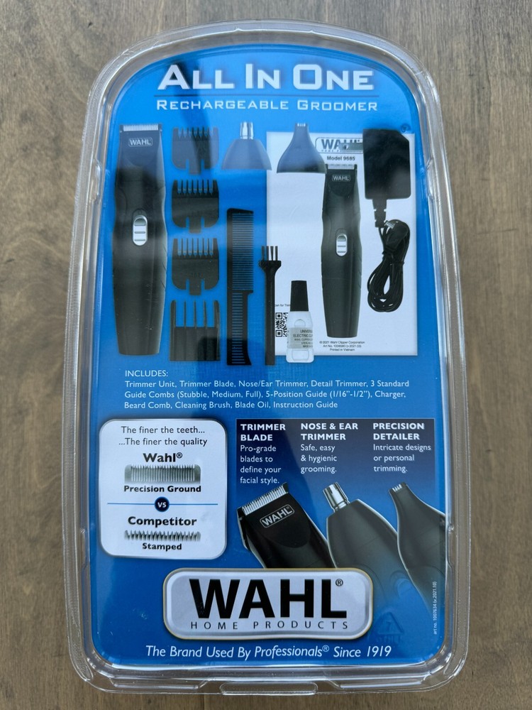 Wahl All in One Rechargeable Beard, Mustache Trimmer for Men with Rotary Nose Trimmer and Detail Heads, Black - 5644. Hygienic trimming for the ear and nose and three individual beard combs and a 5-position attachment to achieve various beard lengths from 1/16 to 1/2 inch. Trim, Groom and Detail with cordless convenience along with the All in One's sleek and powerful design for unbeatable results! Rechargeable cord/cordless beard trimmer for men, NiCad battery 3-standard guides, Stubble, Medium and Full Precision detail, intricate designs or personal trimming 5-position beard length guide comb for blending Self-Sharpening Pro-grade blades to define your facial style Nose & Ear trimmer for safe, easy and hygienic grooming Up to 80 minutes of run time We combine shipping on multiple listings purchased, so please visit my store for more great deals! Cyber Store Central | eBay Stores