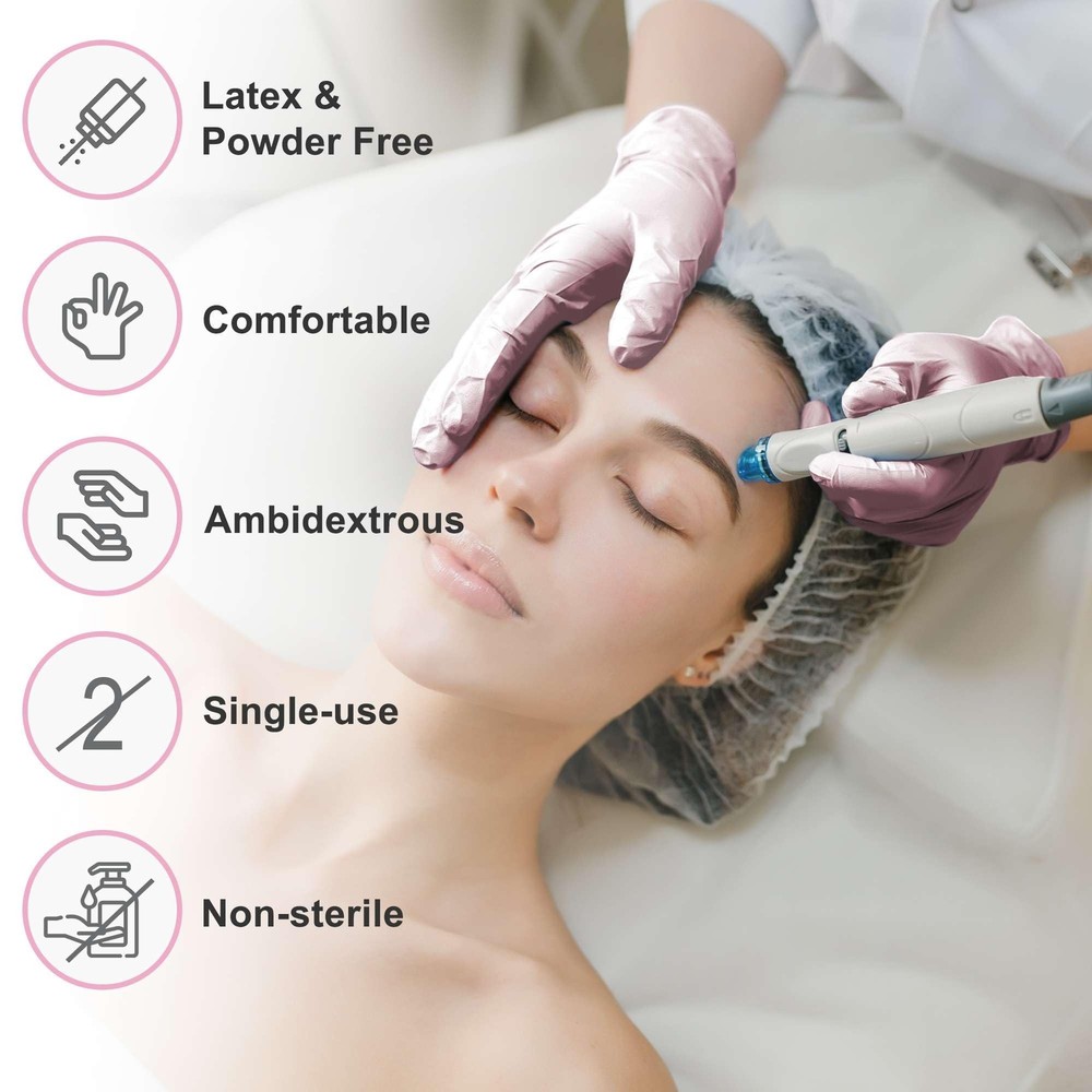WECARE Pink Disposable Nitrile Gloves - Powder and Latex Free - Non-Sterile - Food Safe - Buy Now with Fast Shipping! WECARE Pink Disposable Nitrile Gloves - Powder and Latex Free - Non-Sterile - Food Safe Product Details Department : Unisex Adult Date First Available : August 14, 2023 Manufacturer : WeCare Key Features Product Description WeCare Pearlescent Colored Nitrile Gloves are a stunning combination of style and functionality. Available in two mesmerizing pearlescent colors, chrome and shimmering pink, these gloves are designed to make a statement while providing exceptional protection and comfort. Crafted with utmost care, these nitrile gloves are latex-free, making them an ideal choice for individuals with latex allergies. Furthermore, they are powder-free, eliminating the risk of powder- related skin irritation and ensuring a clean and hassle-free experience. With WeCare Pearlescent Colored Nitrile Gloves, you can confidently perform your tasks without any concerns about skin sensitivities. These gloves are versatile and suitable for a wide range of applications and industries such as food handling, janitorial services, beauty services, and more. Their excellent puncture resistance and durability ensure prolonged use without compromising safety. Beyond their exceptional functionality, these gloves are a fashion- forward choice. The pearlescent chrome and shimmering pink colors add a touch of elegance and sophistication to your work attire. Whether you're working in a salon or in the kitchen, these gloves will set you apart with their unique and eye-catching appearance. WeCare understands the importance of a perfect fit, and these gloves are designed to provide just that. The ambidextrous design ensures that they can be worn on either hand comfortably, while the textured fingertips offer enhanced grip and control. These features allow for precise movements and dexterity, enabling you to carry out your tasks with utmost precision.