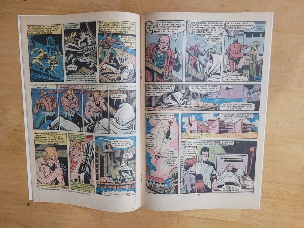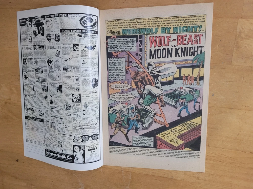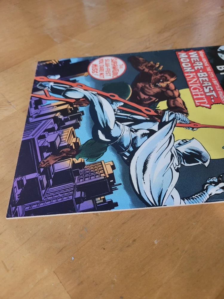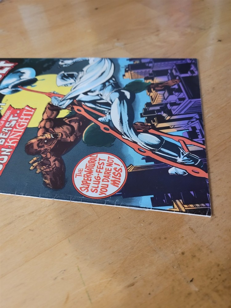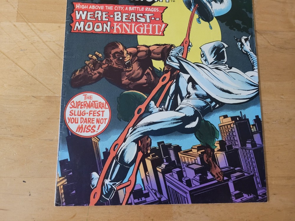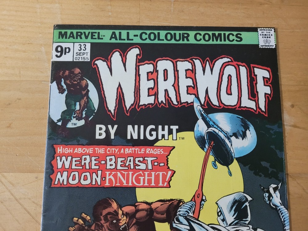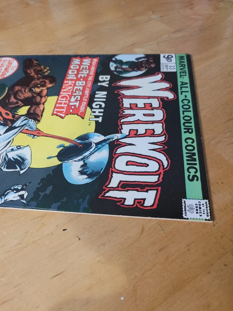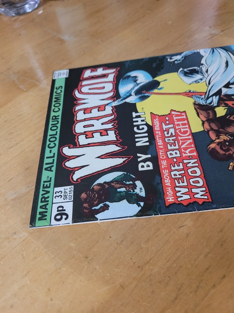 The product is a vintage comic book from the US Comics tradition, specifically issue #33 of the series "Werewolf by Night." This single issue features the characters of Werewolf (Jack Rusell) and Moon Knight, with artwork by Doug Moench and Don Perlin. Published in 1975 by Marvel Comics, this key issue is part of the Marvel Universe and is intended for a general audience. The story titled "Wolf-Beast vs Moon Knight" falls under the genres of superheroes and horror & sci-fi or suspense, making it a colorfully illustrated and engaging read for fans of the era. Hard to find UK printing. Many spine kinks. Returnable within 14 days, no partial credits given. Buyer pays return shipping.