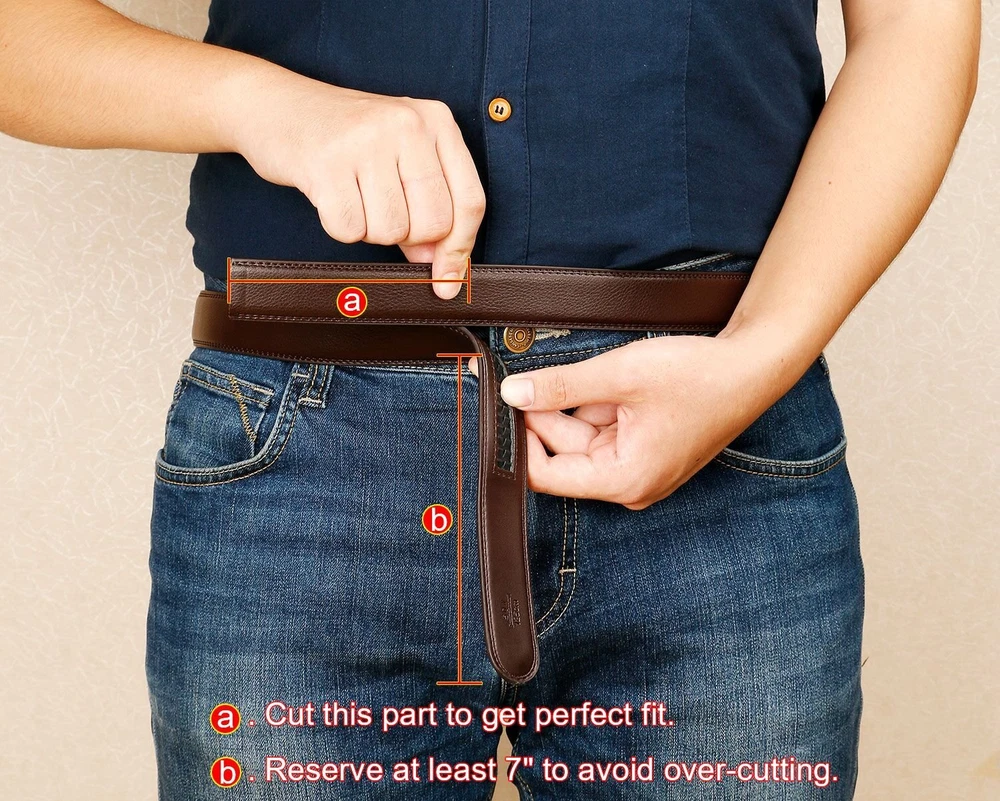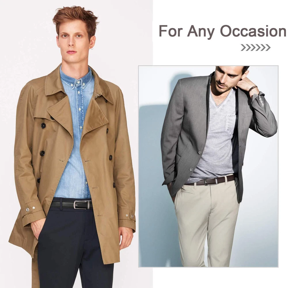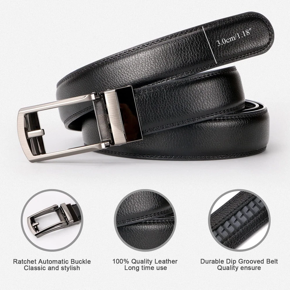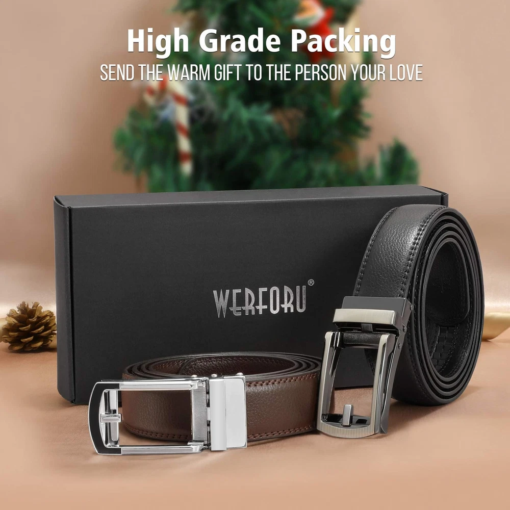 This is a new style decent quality leather ratchet dress belt, comfortable and easy to adjust if needed. A simple tug and click is all it takes.✦ WERFORU Package includes 2*ratchet belts, 1*screwdriver and 1*instruction. New Technology Buckle - New effortless solution with brand new innovation. How to use: Slide in the strap to tighten and the men leather belt auto locks. Lift the buckle and pull to release. Quite easy to tighten and release. Special designed for men in dress suit, uniform and jeans. Good Material to get Great Product - The Strap of this ratchelt belt for jeans is made of decent quality leather with texture, quite durable and sturdy beyond your imagination. The innovative new style buckle is made of Zinc Alloy, shiny and practical. The buckle will not fall off or get slipping after long time use. Only good materials can create a great product, you will like this belt for its quality. Fantastic Present Box - This fashion ratchet dress belt is enclosed in a sleek and modern box, which can offer you a quite good present-giving experience. It is a great present for men. Order With Grace - Our mission is for you to be satisfied with our men ratchet belts. These men ratchet belts fit most of size.S:45.28"(Suit Pant Size 21"-35"),M:51.18"(Suit Pant Size 28"-44"),L:57.09"(Suit Pant Size 44"-50")