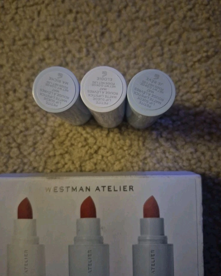 BRAND NEW IN BOX WESTMAN ATELIER PETITE LIP SUEDE MATTE LIPSTICK TRIO INCLUDES SHADES ELODIE, MA BICHE AND JE REVE BOX HAS SOME MARKS ON IT AS SEEN IN PICS 100% AUTHENTIC