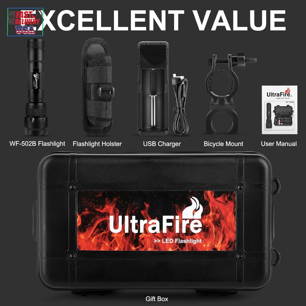 Store New Arrivals Add to Favorite View Feedback Contact WF-502B LED Tactical Flashlight, 5 Modes 1000 High Lumens Flashlight Torch with Duty Belt Flashlight Holster, UFB26, Bicycle Mount, USB Charger Description Item model number WF-502B Light Source Type LED Power Source Battery Powered Battery Cell Composition Lithium Ion Light Path Distance 200 Meters Warranty Type Money Back Guarantee Light Direction Uplight Batteries Included? Yes Special Features Long Range, High Power Batteries Required? Yes Product Dimensions 5.24"D x 1"W x 1.3"H Material Aluminum Number of Batteries 1 Product Specific batteries required. (included) Finish Type Black Included Components Light kit inlcuded, Bulb included Item Package Quantity 1 White Brightness 1000 Lumens Brightness 1000 Lumen Water Resistance Level Waterproof Item Weight 1.02 pounds Specific Uses Flashlight Battery Description Lithium-Ion Special Feature Long Range, High Power Part Number 502B-kit Color Black Batteries 1 Product Specific batteries required. (included) Voltage 3.7 Volts Recommended Uses For Product camping, hiking, hunting, cycling, outdoor activities Finish types Black ULTRA BRIGHT & LONG-LASTING: Experience the power of our ULTRAFIRE WF-502B Flashlight, fitted with a high-efficiency Ultrafire LED bulb that illuminates up to 1000 lumens, effortlessly lighting up objects up to 200 meters away. 5 VERSATILE MODES: Designed with your needs in mind, our tactical flashlight features five adaptable settings: High / Medium / Low / Strobe / SOS. Whether you're camping, hiking, hunting or simply require a reliable light source, we've got you covered! UNPARALLELED DURABILITY & WATERPROOF: Crafted from aerospace-grade aluminum alloy, our flashlight offers remarkable durability, resistance to pressure and wear. It's IPX-65 waterproof, meaning it can brave storms and heavy rain, always ready to work when you need it. FULL FLASHLIGHT KIT: Not just a flashlight, but a comprehensive kit including a Ultra Bright Professional Tactical LED Flashlight, Nylon flashlight holster, Ultrafire UFB26, Micro USB cable, Charger, Bicycle mount, and a Gift box case. Everything you need right out of the box! HASSLE-FREE: Any problems? Just feel free contact us! Providing the highest quality for all is our primary goal and our primary purpose. Get your tactical flashlight kit TODAY! Product Description ABOUT US We offer the best prices around on high quality products. Our E-store includes media such as books, movies, music and games while offering electronics, toys, sporting apparel, clothing, tools, general home, garden items and more. SHIPPING We are always working hard to ensure your package arrives as soon as possible. Please understand that some factors like weather, high postal traffic, and the performance of shipping companies are outside of our control. We offer free shipping to the lower 48 states and ship within 2 business days of payment, usually sooner. We do not accept P.O. Boxes. Please provide a physical address. For shipping outside of the continental USA, we only use eBay's Global Shipping Program.The item is shipped to KY and then sent to the rest of the world. International customers are responsible for all duties and taxes. Continue to check out in order to calculate costs for shipping the item to your country. Messages regarding eBay's Global Shipping Program MUST be directed at eBay EXCLUSIVELY. RETURNS We offer a 30-Day Return Policy on items which you are not completely satisfied with. You have the option for a full-refund or an exchange of the item. No returns are available on items shipped outside of the USA. PAYMENT We accept PayPal. CONTACT US This page content is yet to come Please ad us to your favorite seller and visit again later Thank You CUSTOMER SATISFACTION We try our very best to make sure every customer is completely satisfied. If there's a problem, message us! We're happy to help. WE ACCEPT Copyright © 2021 AutoDS. | All Rights Reserved