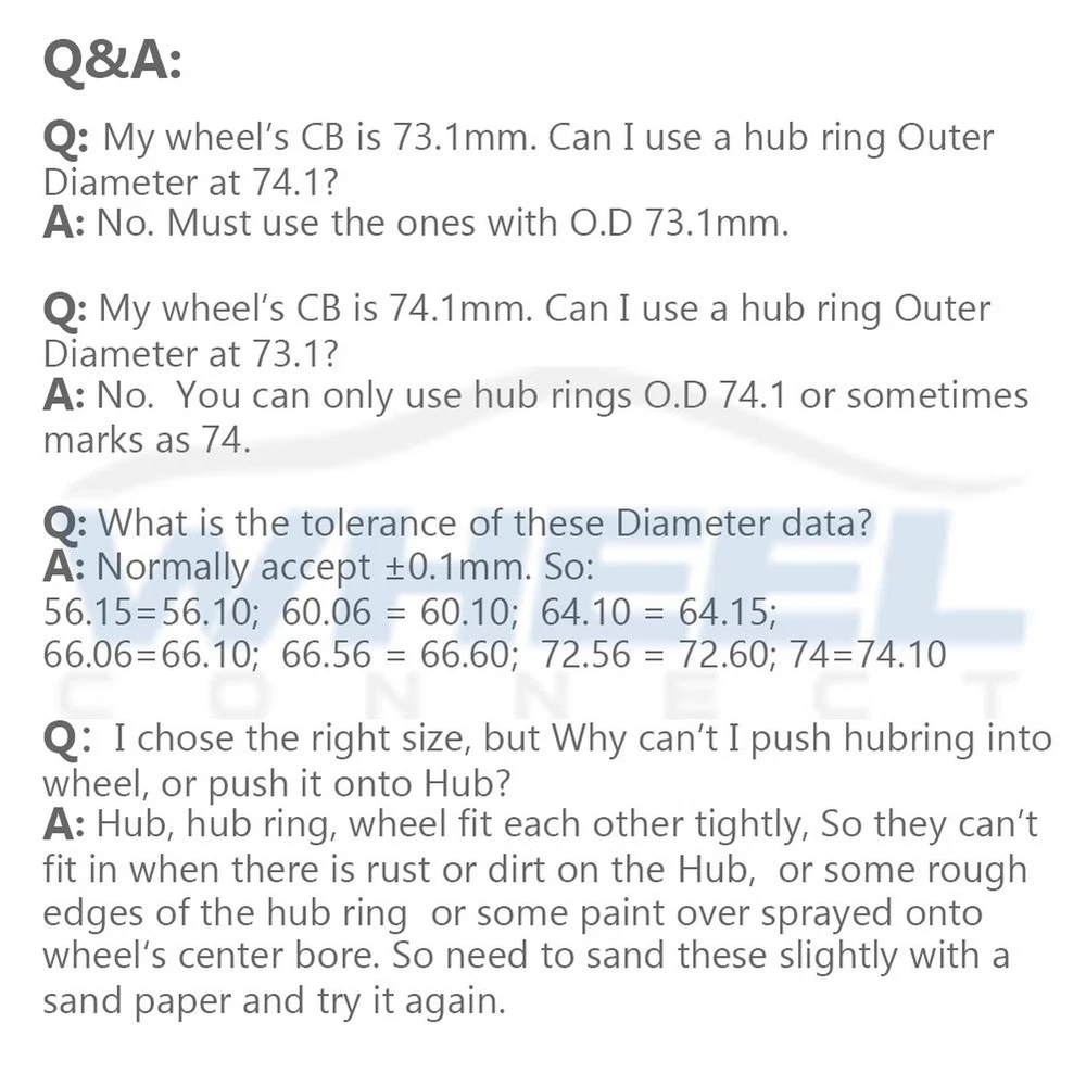 WHEEL CONNECT Hub Centric Rings,72.6 to 63.4, Aluminium Alloy Hubrings,63.4 to 72.56, Set of 4,O.D:72.6-I.D:63.4 mm. A Product Details Size: OD72.6--ID63.4mm Brand: WHEEL CONNECT MPN: HR7260-6340A UPC: 619011576901 EAN: 0619011576901 Manufacturer: Wheel connect Brand: WHEEL CONNECT Model: HR7260-6340A Item Weight: 4 ounces Product Dimensions: 3.15 x 1.57 x 3.15 inches Manufacturer Part Number: HR7260-6340A Date First Available: February 12, 2020 Outside Diameter (O.D.) 72.6 (72.56) mm. Must match wheel center bore. Inner Diameter (I.D.) 63.4 mm. Must match the vehicle hub bore. Select the correct size from the size list above and then click Buy Now. [BENEFITS] Hub Centric Rings will fix vibrations caused by aftermarket alloy wheels not centering correctly onto your vehicle's hub. Converts your aftermarket wheels from lug centrically installed to hub-centrically installed. Easy to Install. [QUALITY] These Hubrings are made of Aluminium Alloy, Nice looking, corrosion resistant , heat resistant and durable. [SERVICE AND QULITY ASSURANCE] WHEEL CONNECT is a Canadian brand, designed and serviced in Canada.