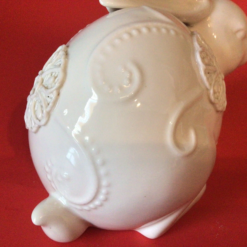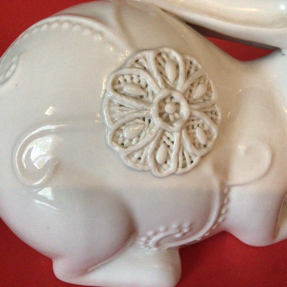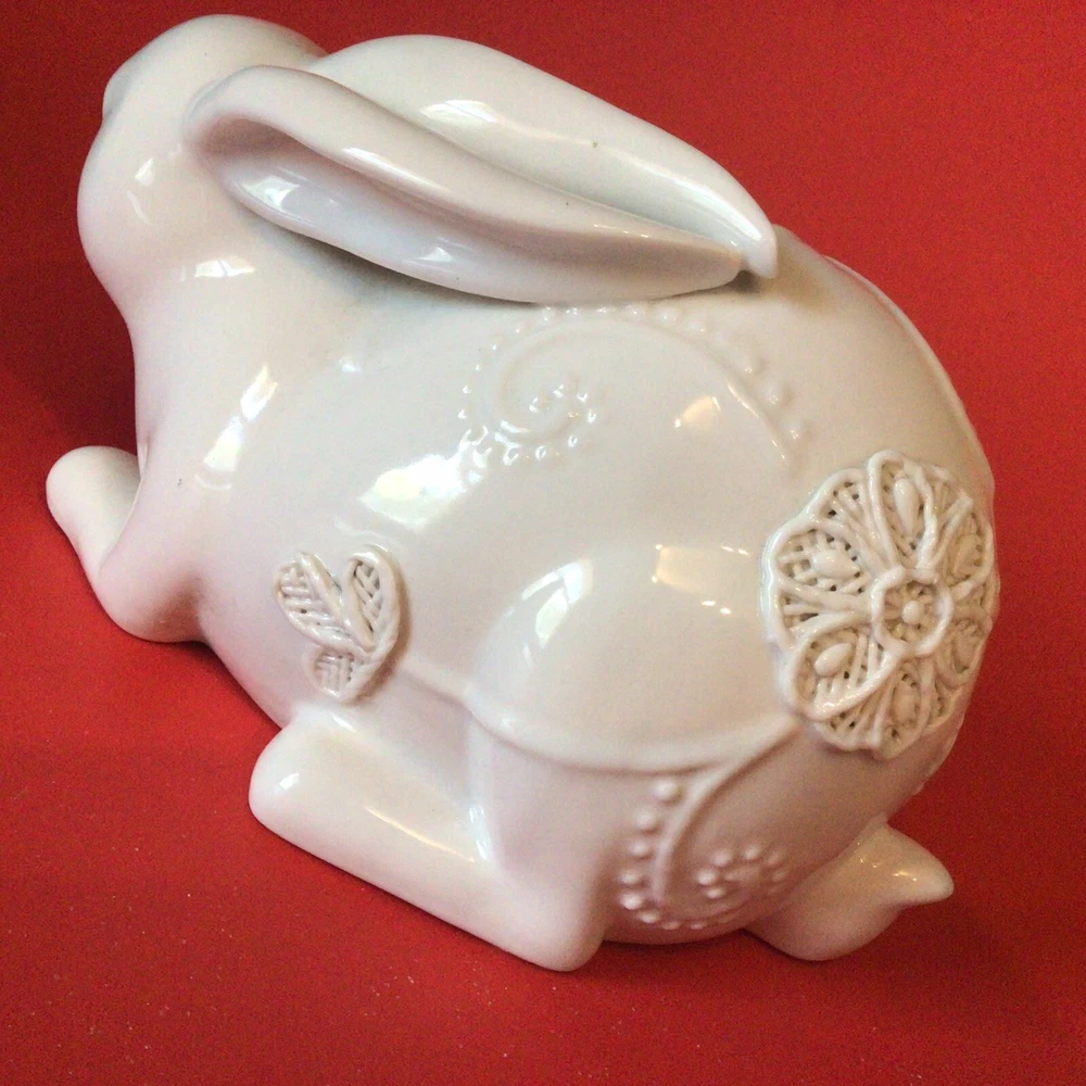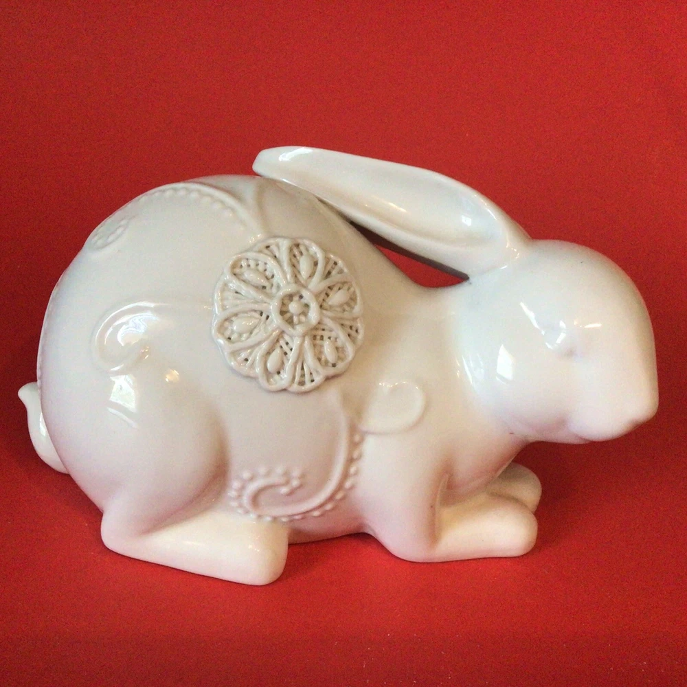 GORGEOUS WHITE PORCELAIN BUNNY RABBIT FIGURINE. NORMAL MANUFACTURER TEENY GLAZE DOTS. MEASURES 8 INCHES LONG AND 5 INCHES TALL. VERY UNIQUE. IF YOU HAVE ANY QUESTIONS OR WOULD LIKE MORE PHOTOS, PLEASE MESSAGE US. THANK YOU SO MUCH FOR SHOPPING WITH US! WE ENCOURAGE YOU TO CHECK OUT OUR CUSTOMER REVIEWS. CHECK OUT AND FOLLOW OUR STORE FOR MORE GREAT ITEMS AS WE ADD TO OUR INVENTORY ALMOST DAILY. http://stores.ebay.com/wootieswonders THANKS AGAIN. KEN AND CAROL