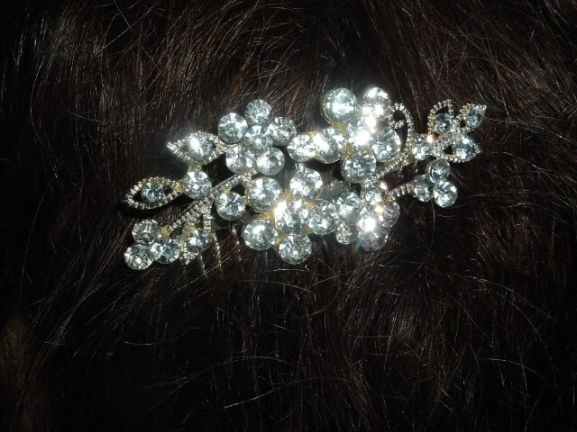 A slide silver side hair comb with chaton cut, white rhinestone flowers framed in beaded silver measuring 3" wide and 2" tall. Condition is excellent, perfect for a prom, wedding or night out on the town, lots of bling.