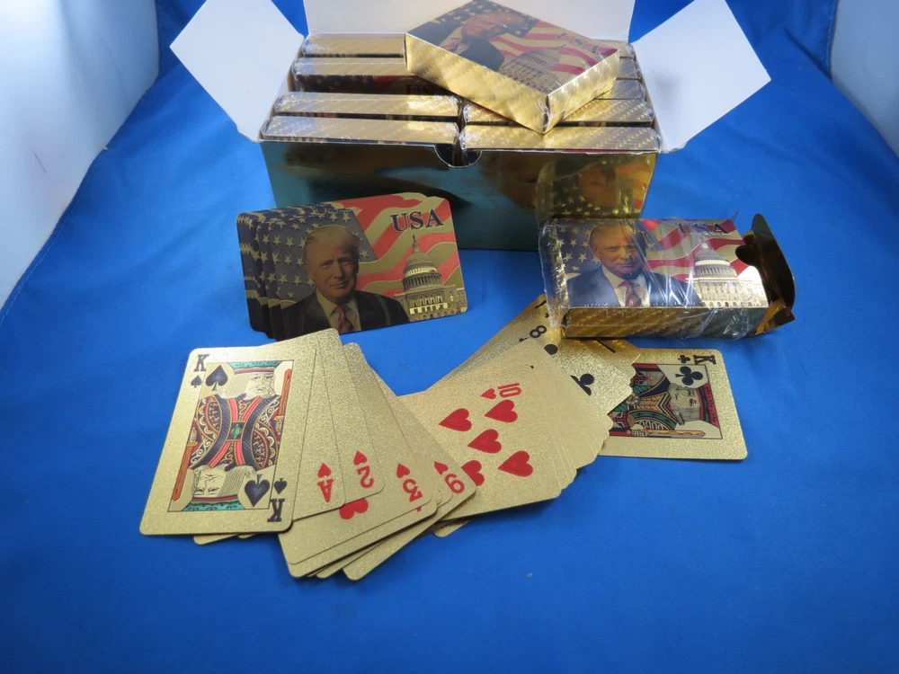Wholesale lot of 12 President Trump playing cards decks 52 cards per deck. Gold and waterproof. We do not break lots feel free to resell yourself at a nice profit or buy from one of our many re-sellers. Also included is a limited edition Trump President novelty money bill (May not be the one pictured) Please search our store for TRUMP.... FOR THE LARGEST SELECTION OF TRUMP ITEMS IN THE WORLD Listing and template services provided by inkFrog