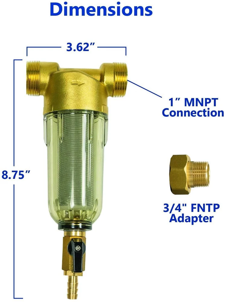 Whole House Water Filter: Protect your entire home or your appliances by filtering all incoming water with ’s Spin Down Sediment Home Water Filtration System. Durable Whole House Water Filter: Spin Down Whole Home Water Filtration Systems are built to last, made with a fitted stainless-steel mount for heavy-duty usage. Easy to Install Home Water Filter: ’s spin down whole house water filters are designed for quick installation and easy to understand instructions. Includes mounting material and connection adapters, making the set-up for your new whole home filter quick and simple. On Demand Support: Rest easy with the support from experts who can answer any of your questions about your new home water filter. All spin down whole home filtration systems come with a 1–year . Low Maintenance Water Filter System: No need to mess with complicated of your whole house water filter cartridges, ’s spin down whole home filtration systems come with a reusable water filter cartridge. Sediment Water Filter: Keep the most damaging sediments out of your drinking water and protect your other filters from coarse impurities including rust, sand, dirt and silt. High Quality Whole Home Water Filter: This whole home water filtration system is designed with a large 1” connections and long, high-capacity housings allowing for almost no reduction in your home’s water pressure. Reliable Water Filtration: The whole home spin down sediment filter is engineered for reliable and high-efficiency filtration, system delivers up to 0.25 gallons of filtered water every second. Technical Specs: This system is designed to be used in a dry level area protected from freezing temperatures and direct sunlight. The system works with 15 - 115 psi and water temperatures between 40-113℉. The system includes a pressure release button and pressure gauge for system monitoring.